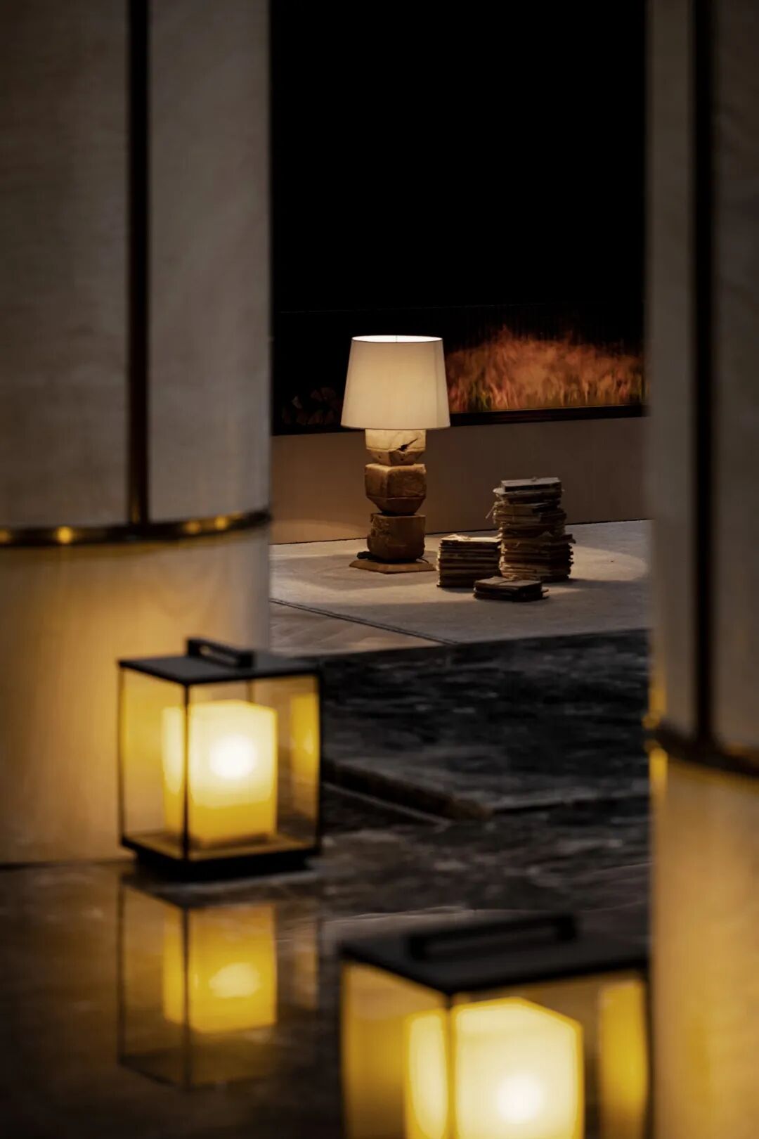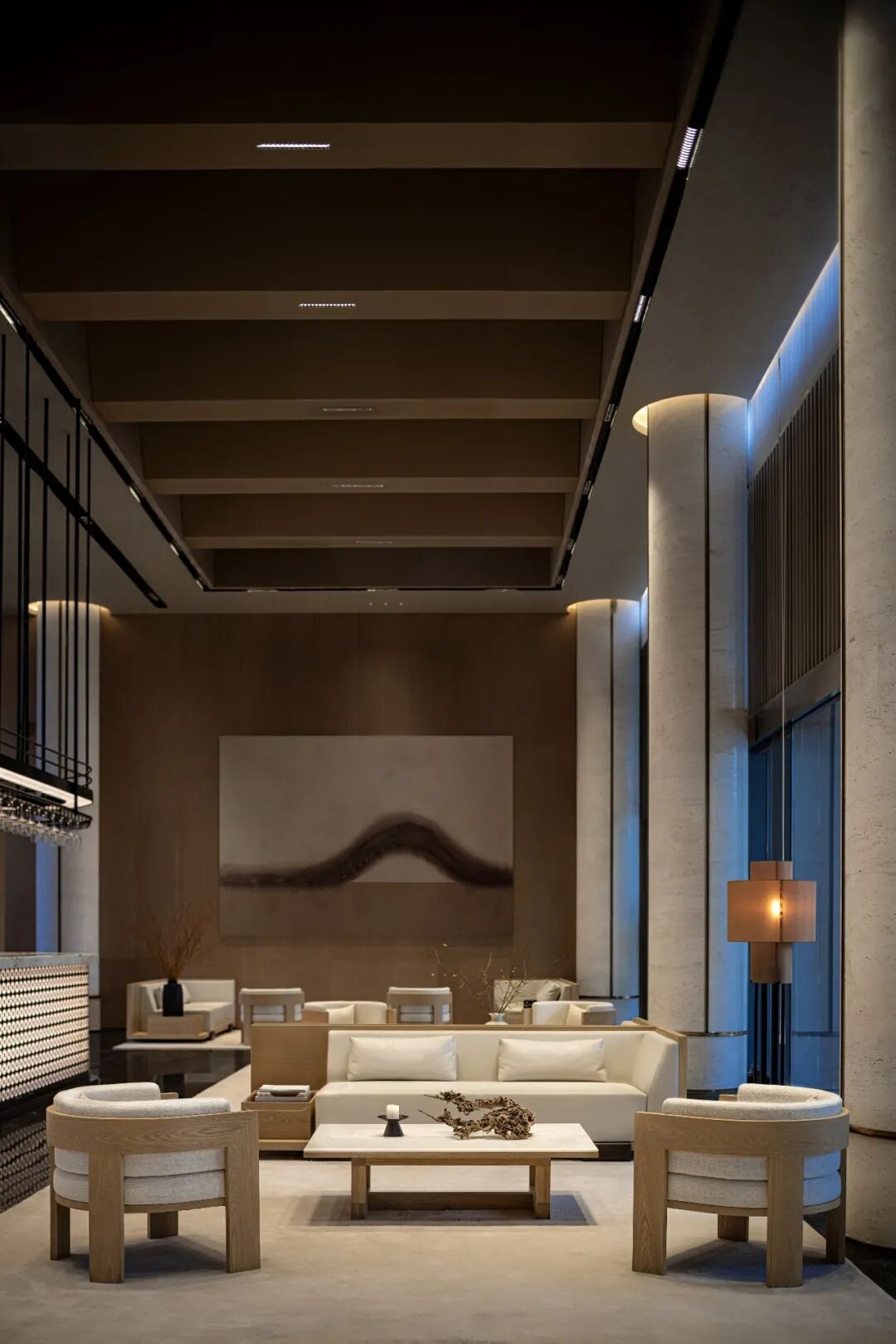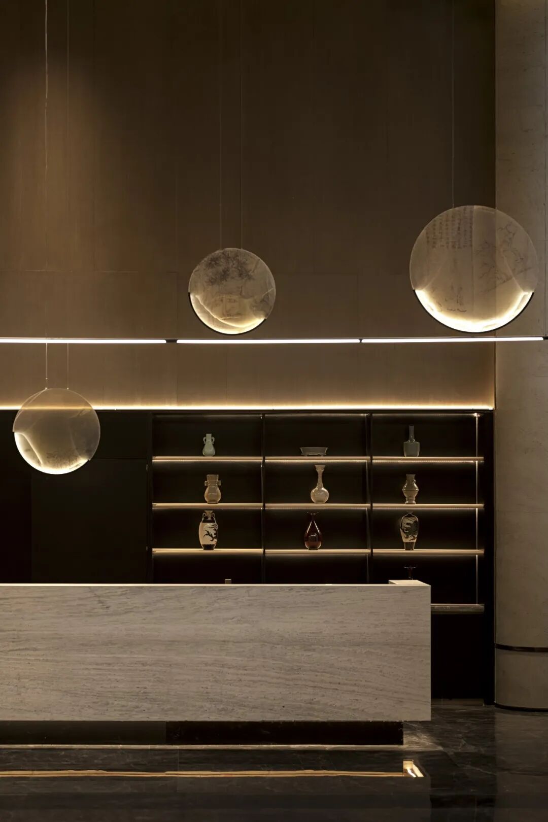 成都地势中间低,四周高,是名副其实的盆地。成都特有的“高”与“低”柔和在一块,水墨画点缀的灯饰映照在大理石的地面上,将人的思绪引向传统的一方。