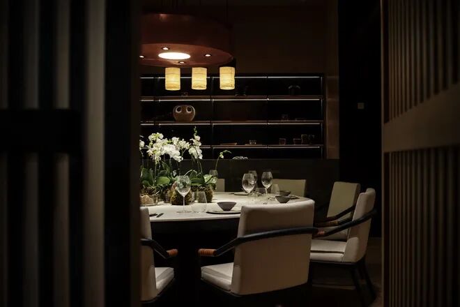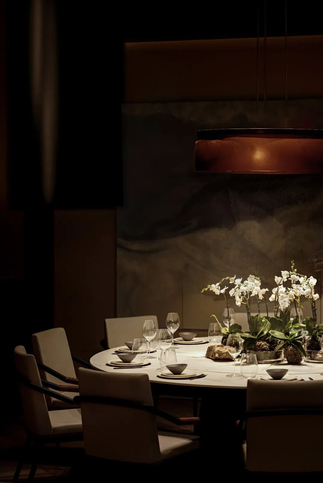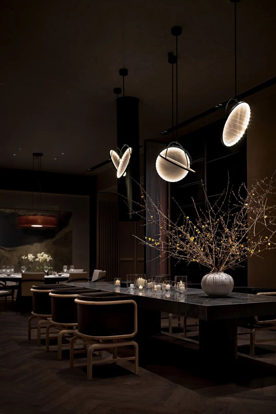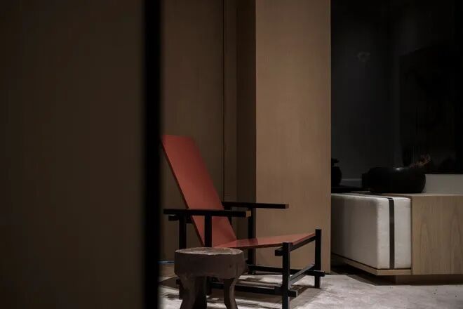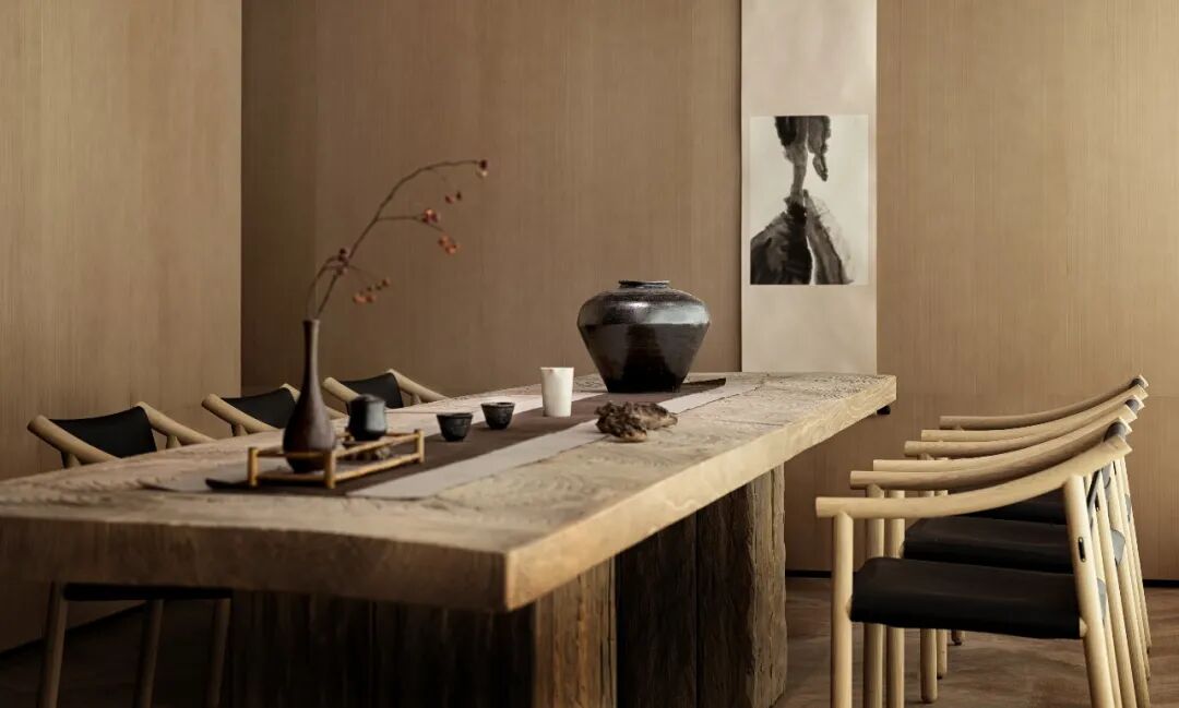 多与少的哲学理念,被充分地应用于现实空间,杯盏交叠,互为映衬。弧线与直线的交融恰到好处,宋朝靠背木椅的现代化呈现,更是将传统与现代糅合在一起
