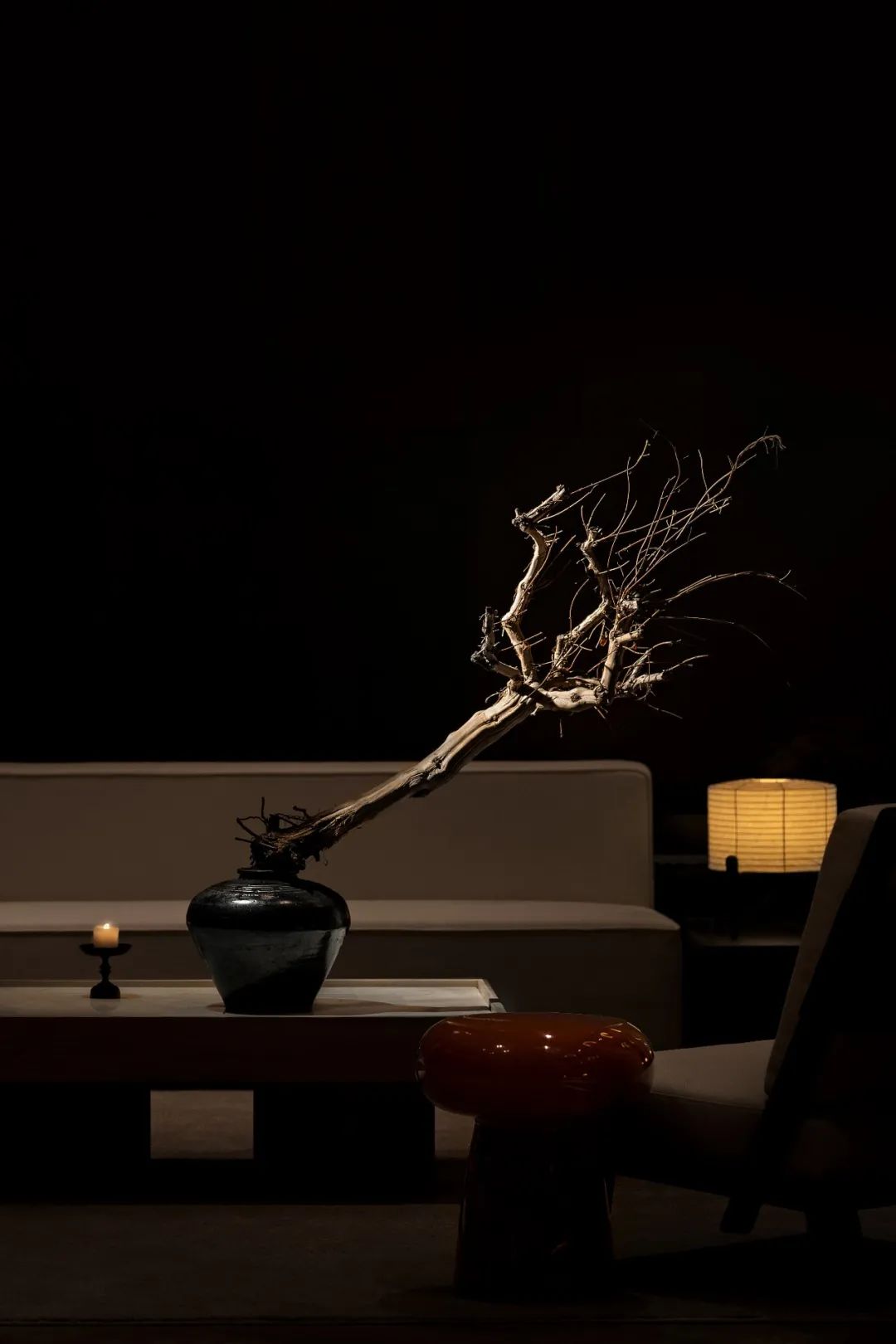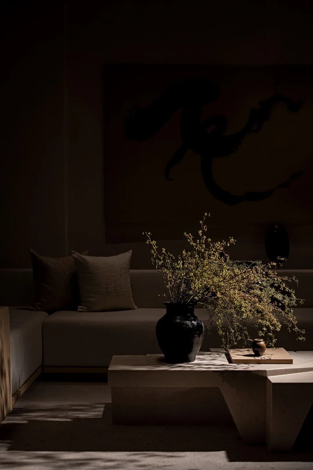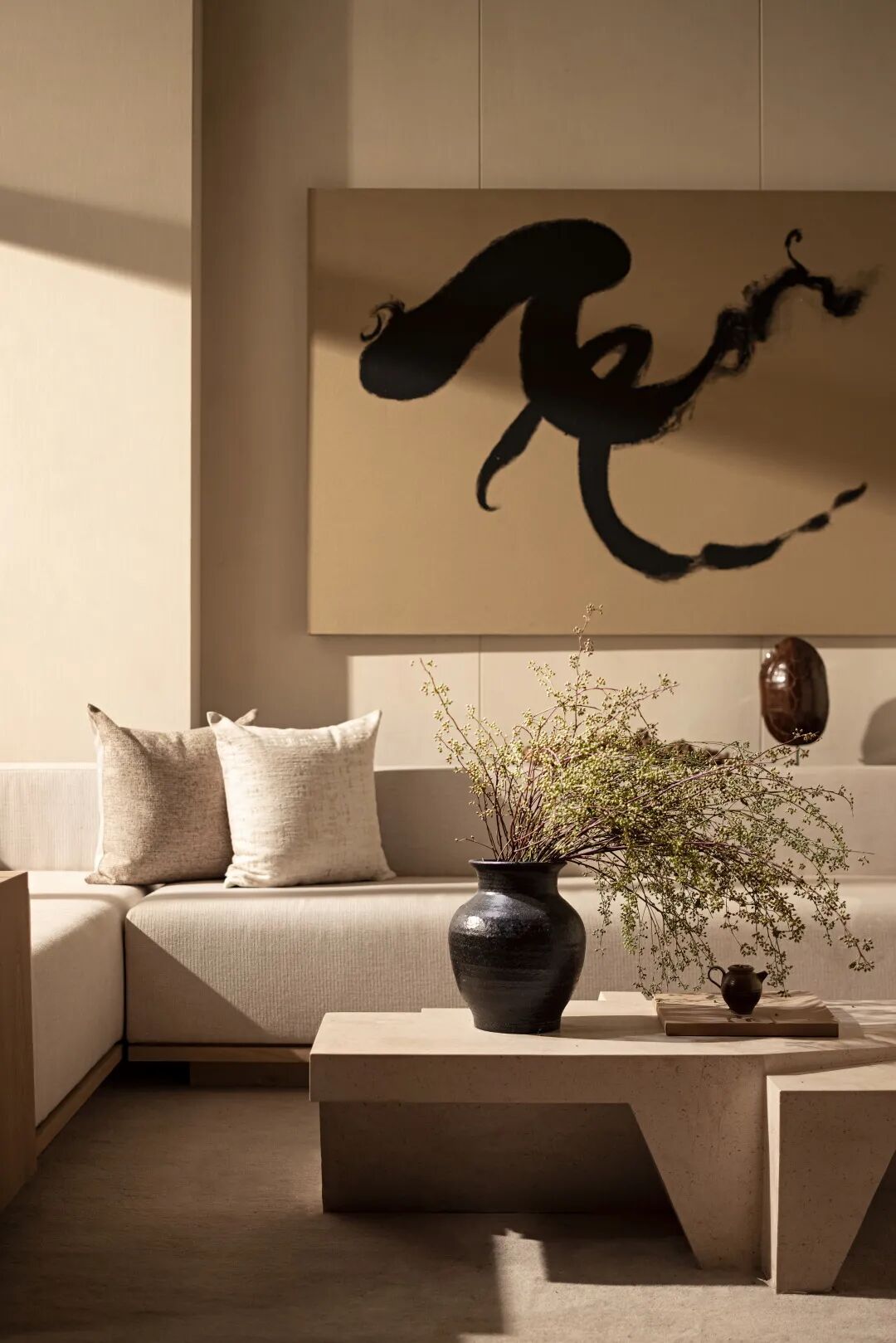 一收一放之间,光影的变化从器物当中流泻而出,宋代所追求的极简理念,又在当下得以重现。绝对的单纯和相对的抽象,像是造物主的左右手,用一幅粗粝感的水墨画,一尊质地精美的白瓷,渲染着空间的高雅之意。
