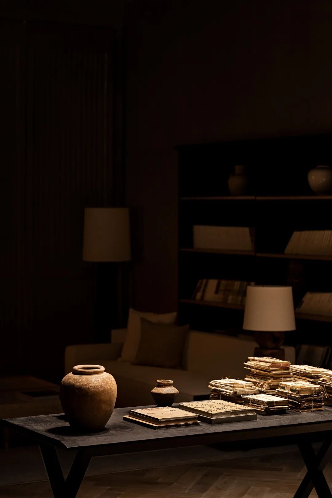 一面是明火,一面是知识。低矮的茶几,桌椅,实现实物的高度与思想的维度相统一。一支高洁的腊梅从宋瓷里探出头,点燃空间最灵动的生气,与世傲骨。