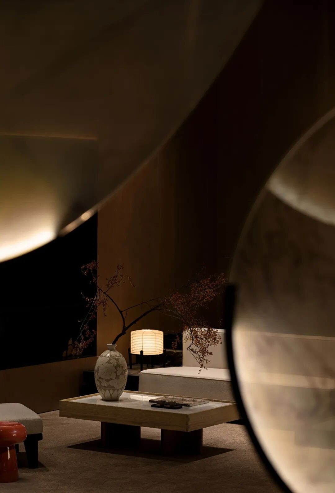 休息空间的墙面挂置着蜿蜒的木质挂件,是对宋代官帽的延续和演变,唤醒人特有的探索欲。