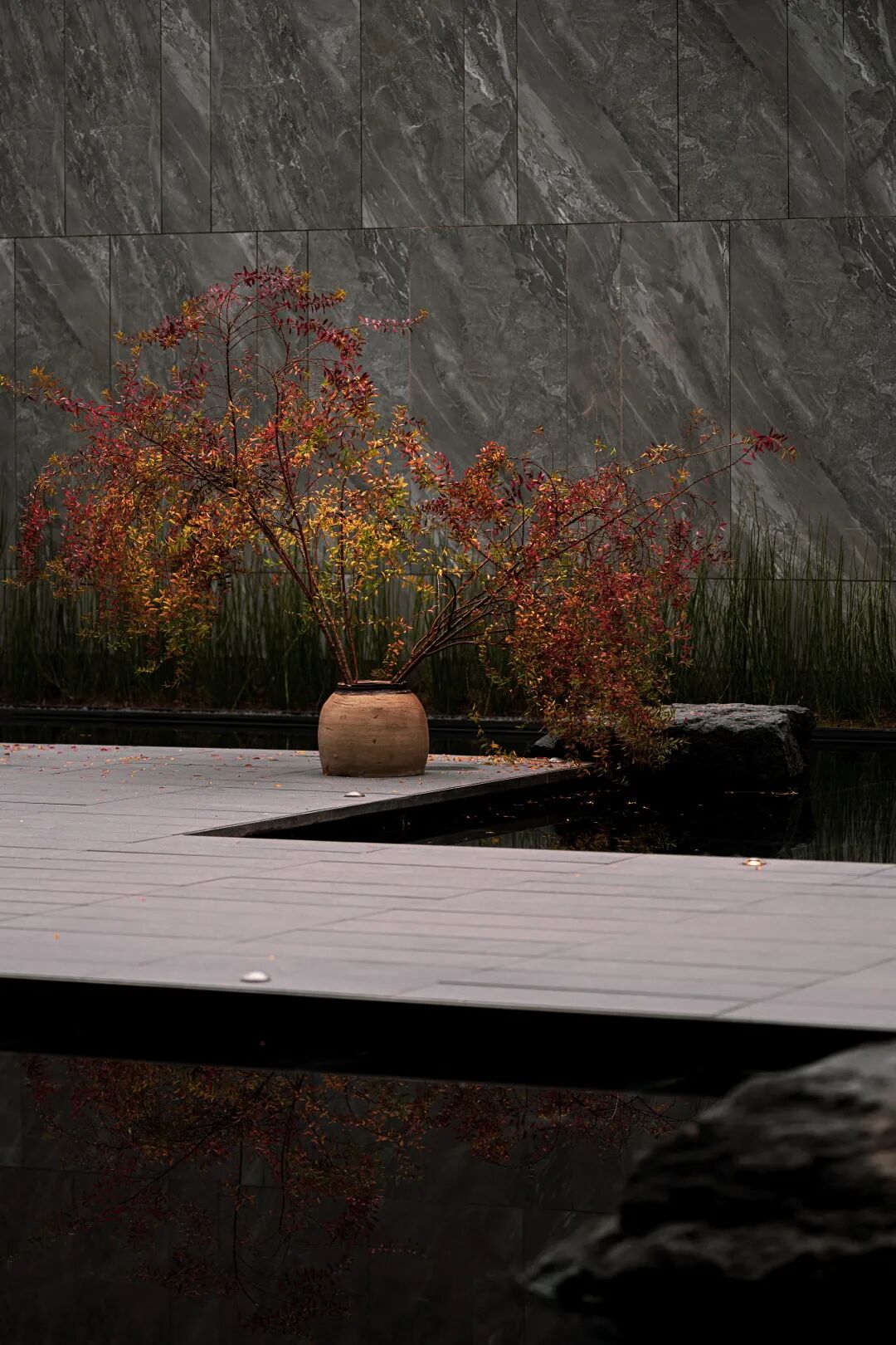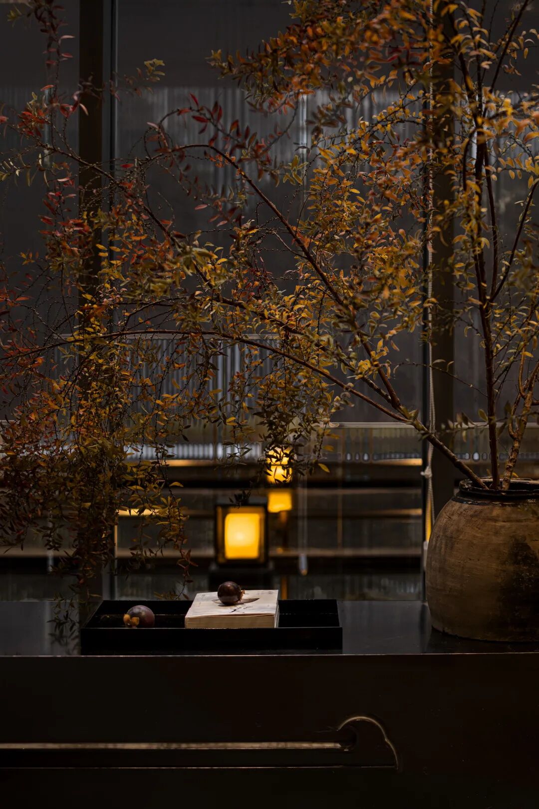 木叶繁茂的珑松,在傍晚余晖散去之时,枝丫在墙面上留下斑驳的倒影,沉淀着禅意的艺术。