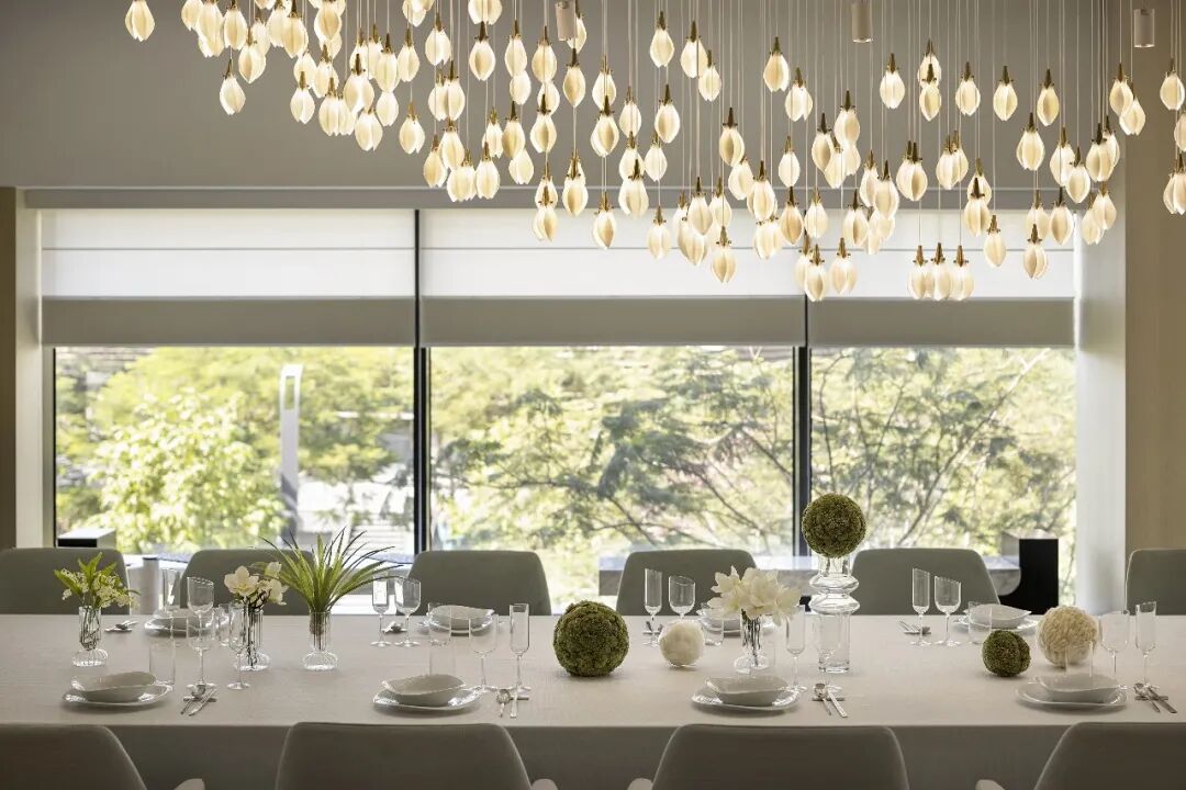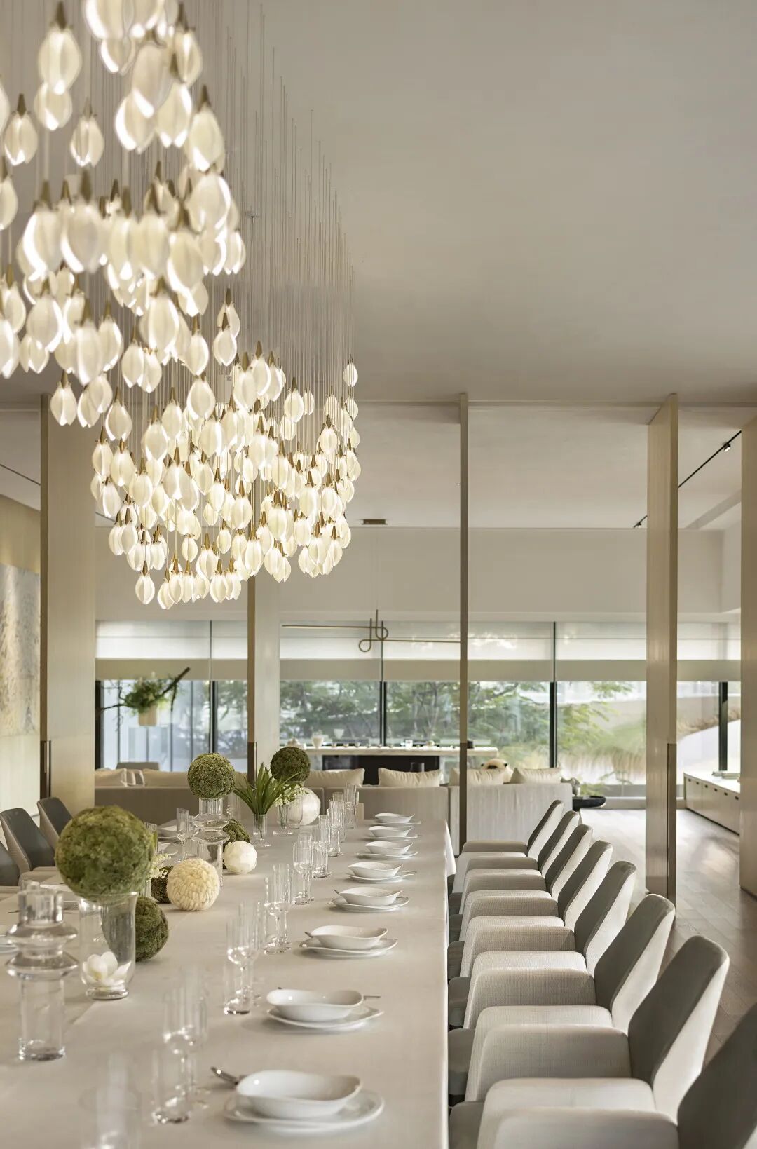 上行至二層私宴廳,以生態場景作為空間的主要設定,明淨的落地窗令光線在空間中肆意流動,與室外景觀形成了自然的對話。
