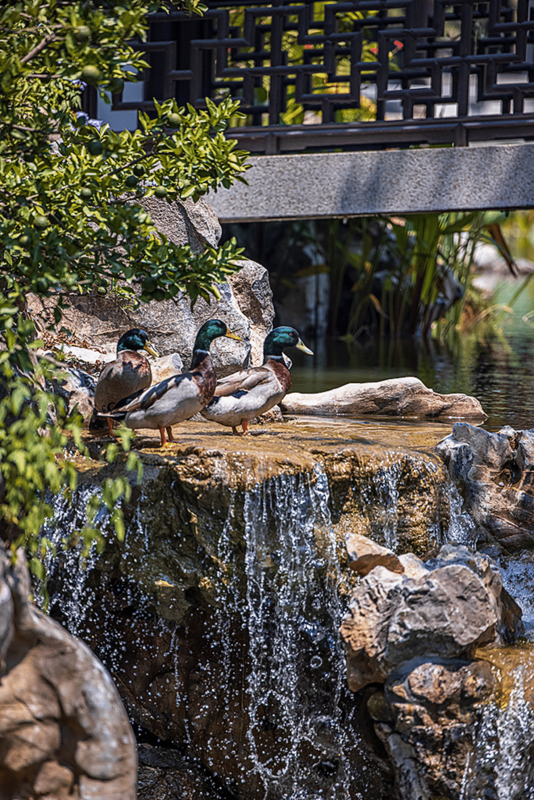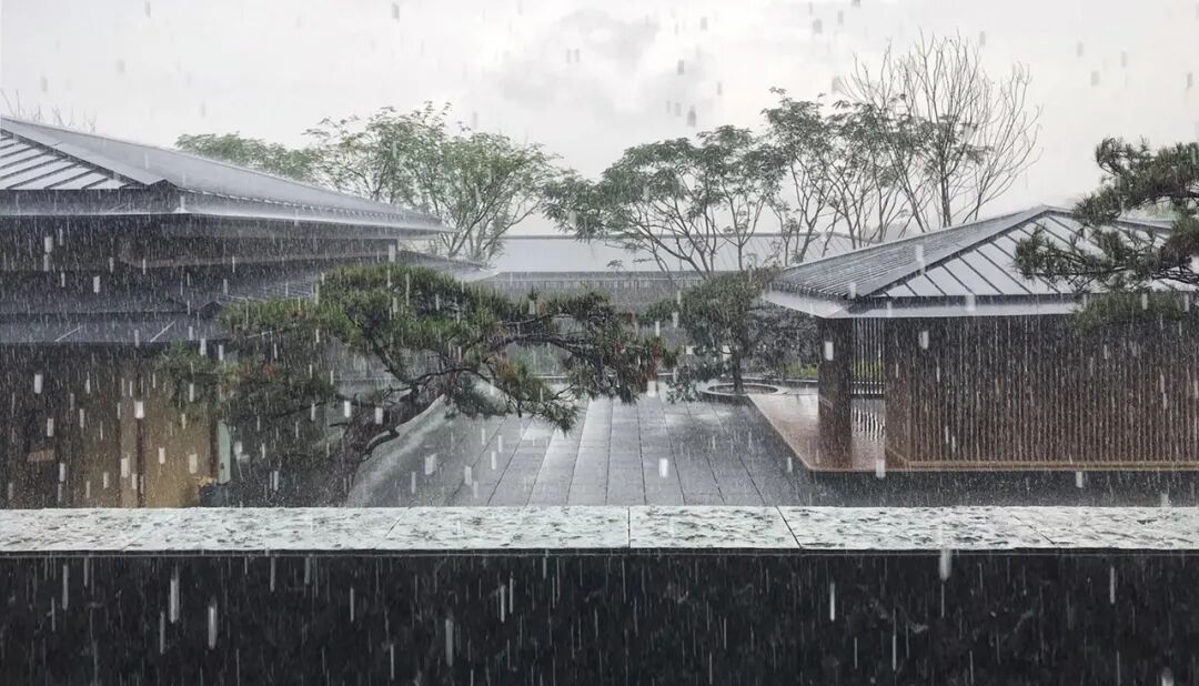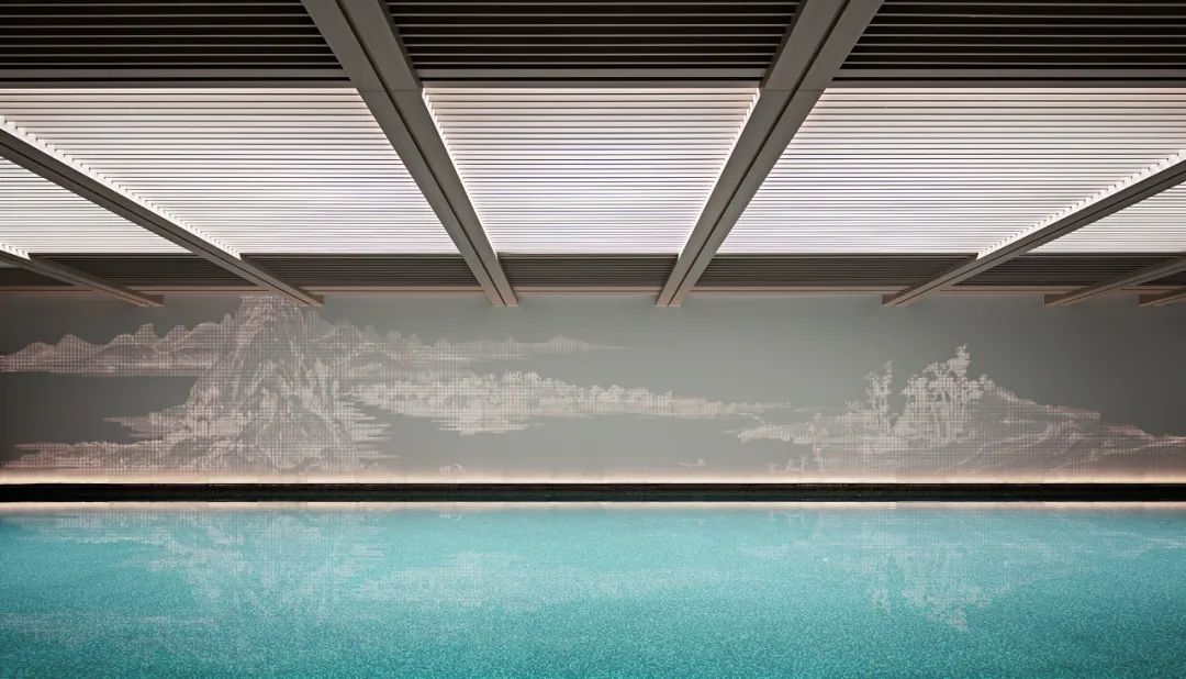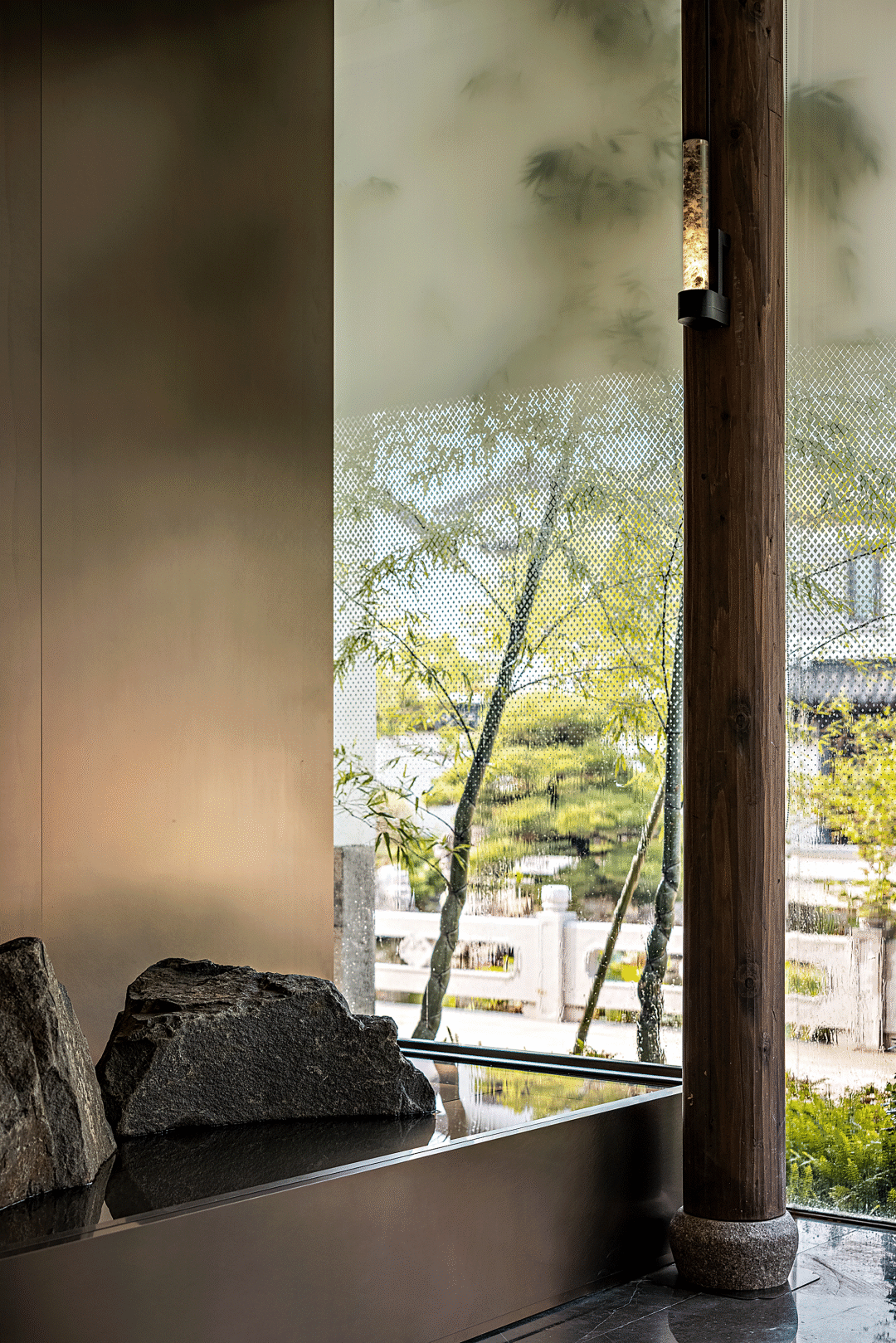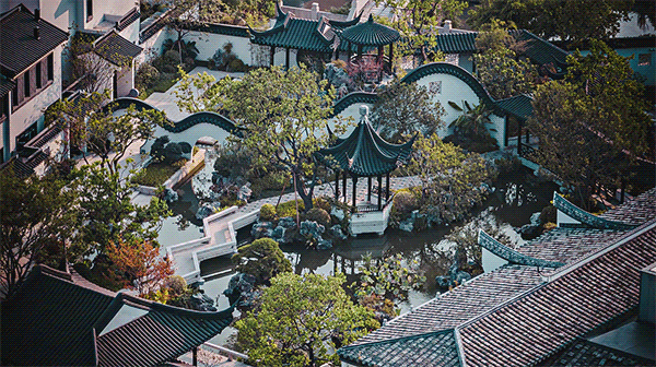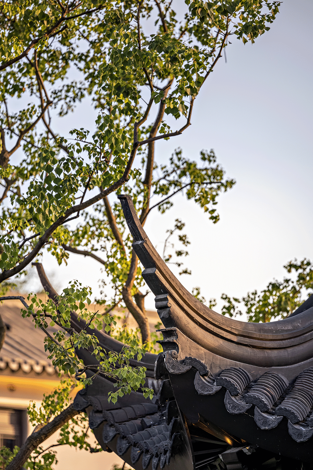 穿過連廊,映入眼簾的青瓦、屋檐、古樹,每一寸都營造若詩若畫的東方意境,欣賞著「采采流水,蓬蓬遠春」,難掩這份靈動,感悟城市中的自然靜謐。