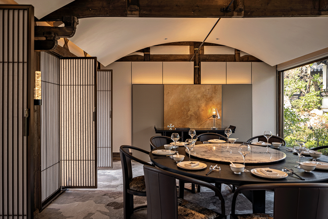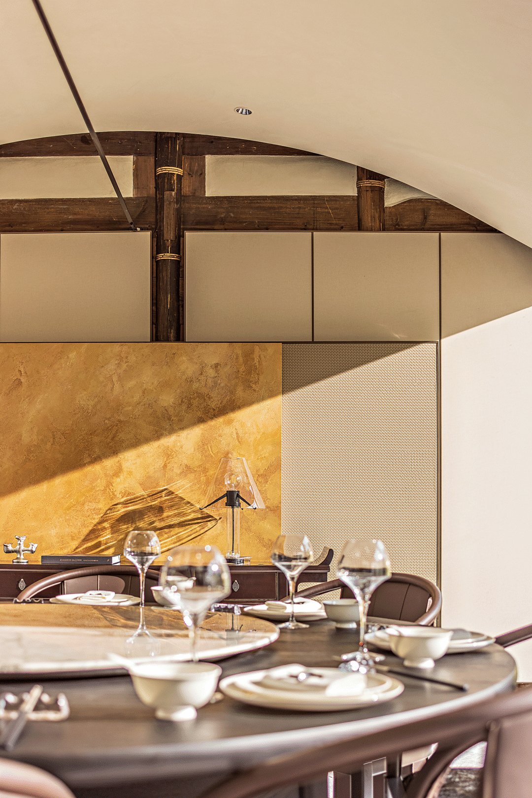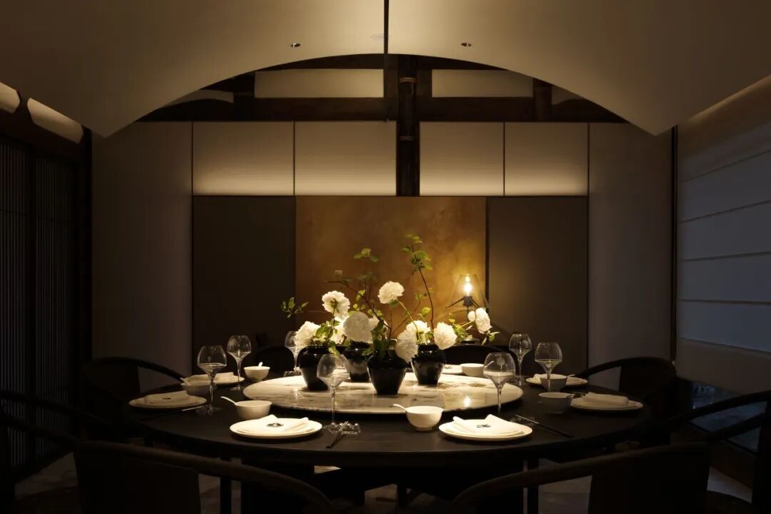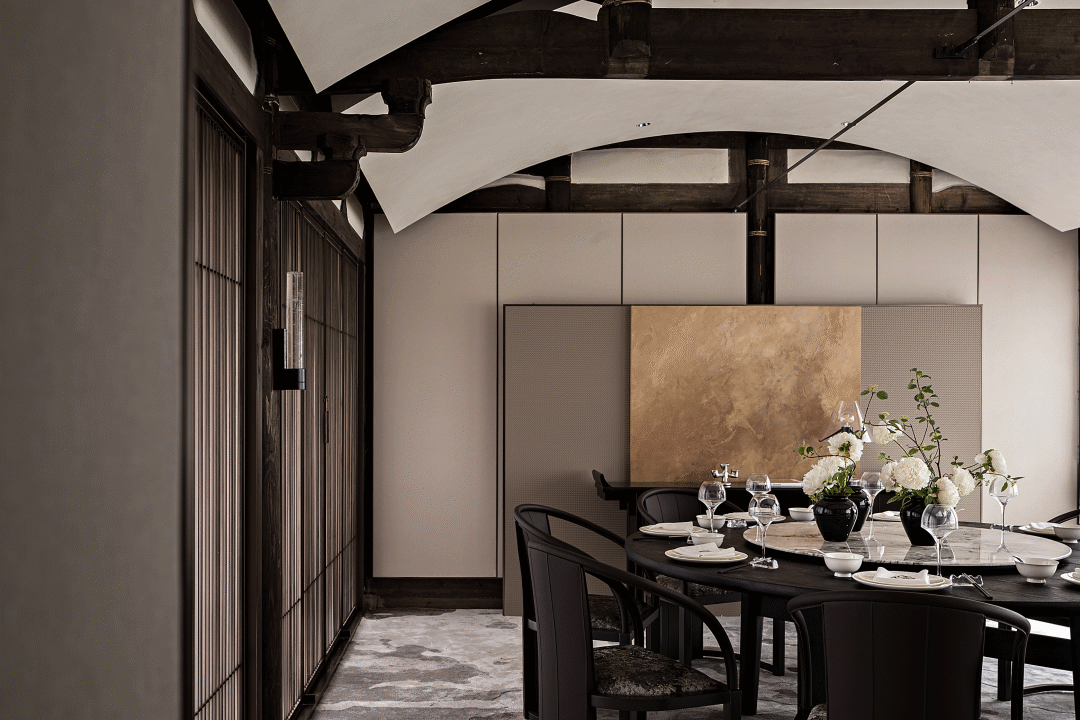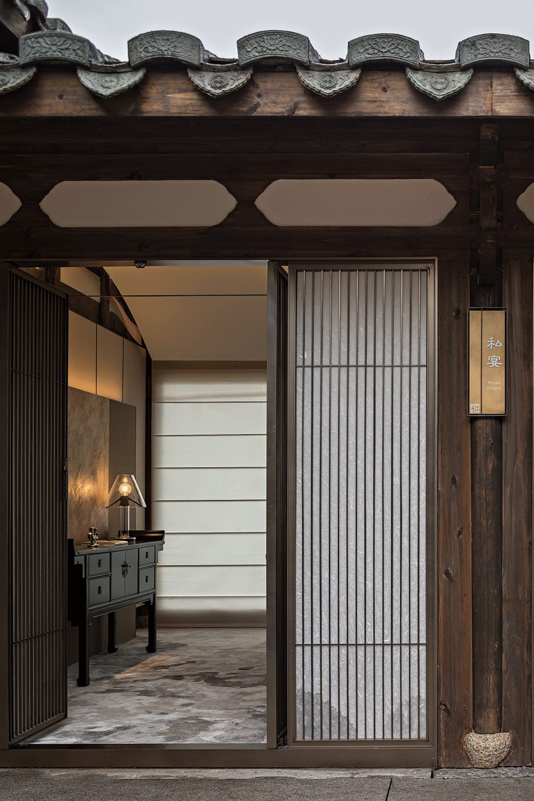 私宴空間以軸對稱的形式分布既體現了東方美學與傳統建築的古韻, 每一根房梁、立柱,都記錄了老建築在歲月變遷中的印記,是歷史的傳承,亦是文化的縮影。