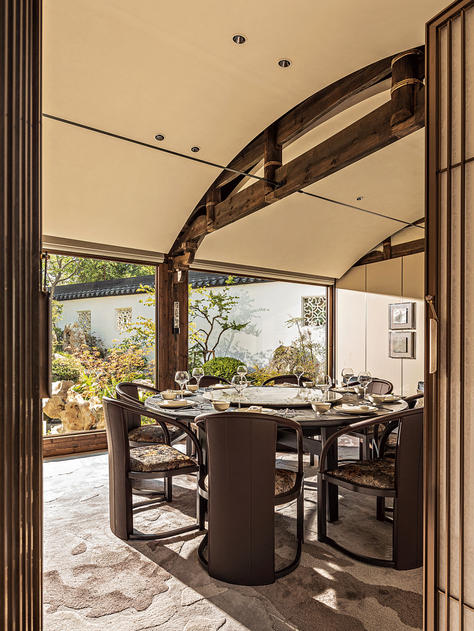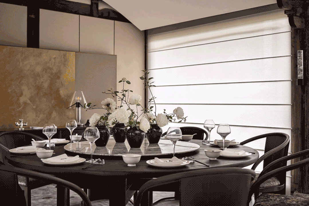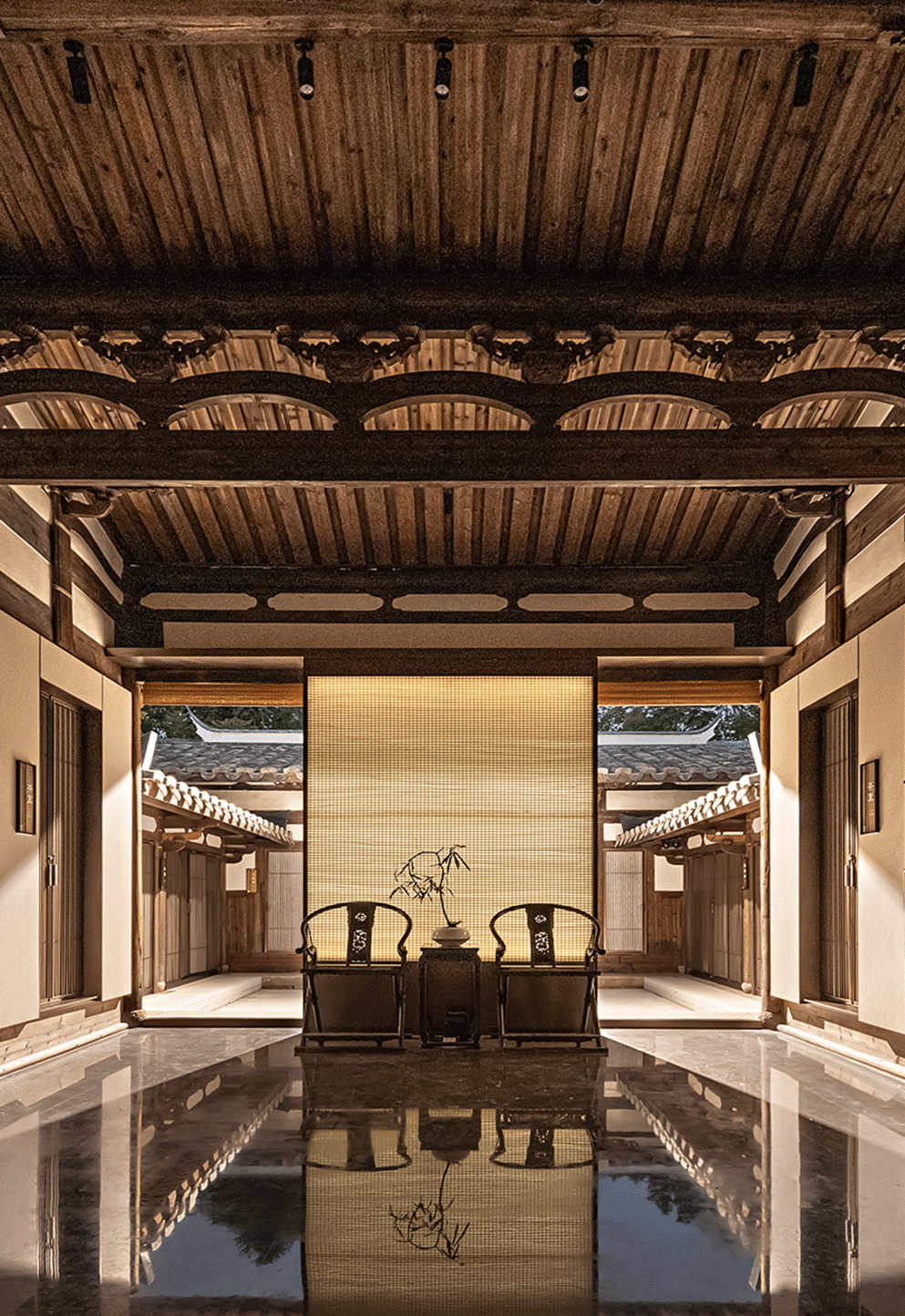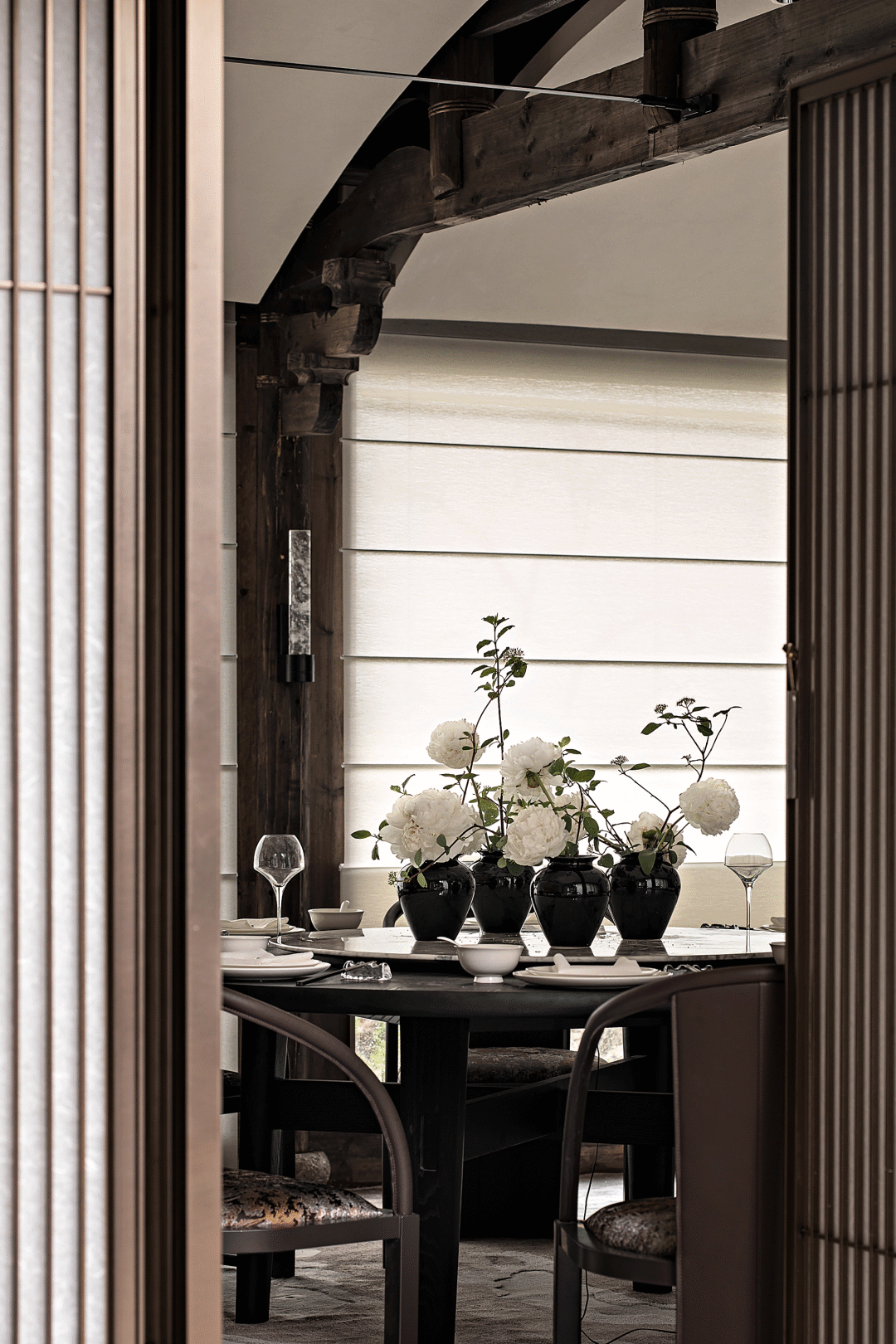 私宴空間以軸對稱的形式分布既體現了東方美學與傳統建築的古韻, 每一根房梁、立柱,都記錄了老建築在歲月變遷中的印記,是歷史的傳承,亦是文化的縮影。