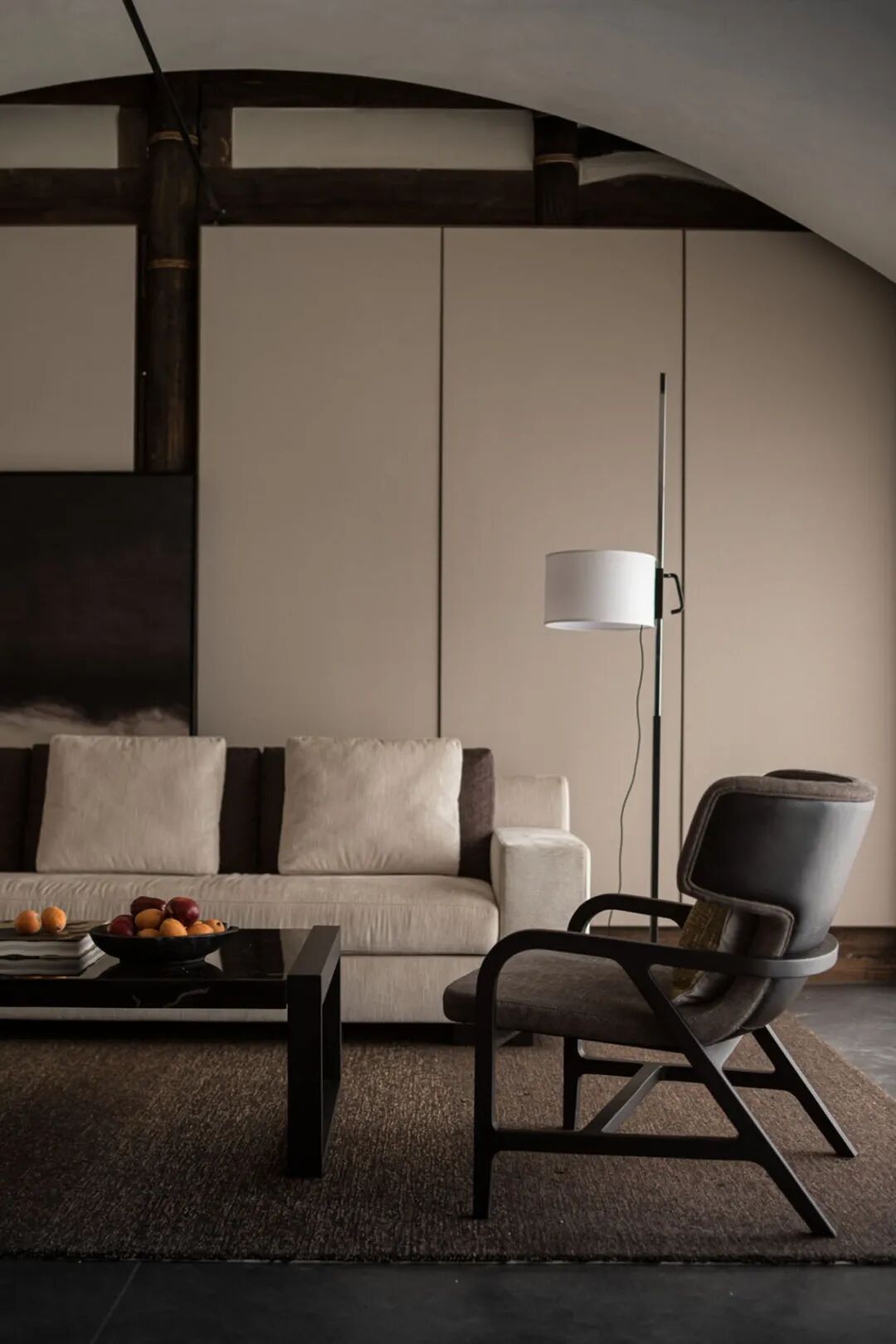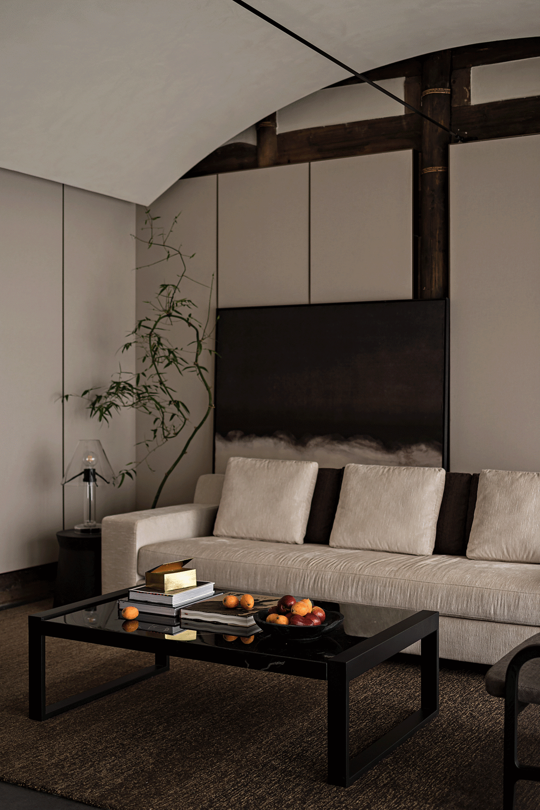 走進這個黑白主色調的東方意境中,弧形頂與原有屋面保持著一致的高度,沒有過多的修飾,線條整潔的家居,典雅別致的設計彰顯了空間魅力。