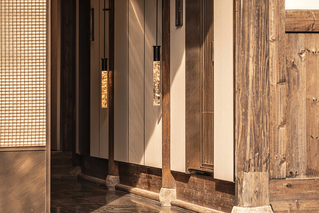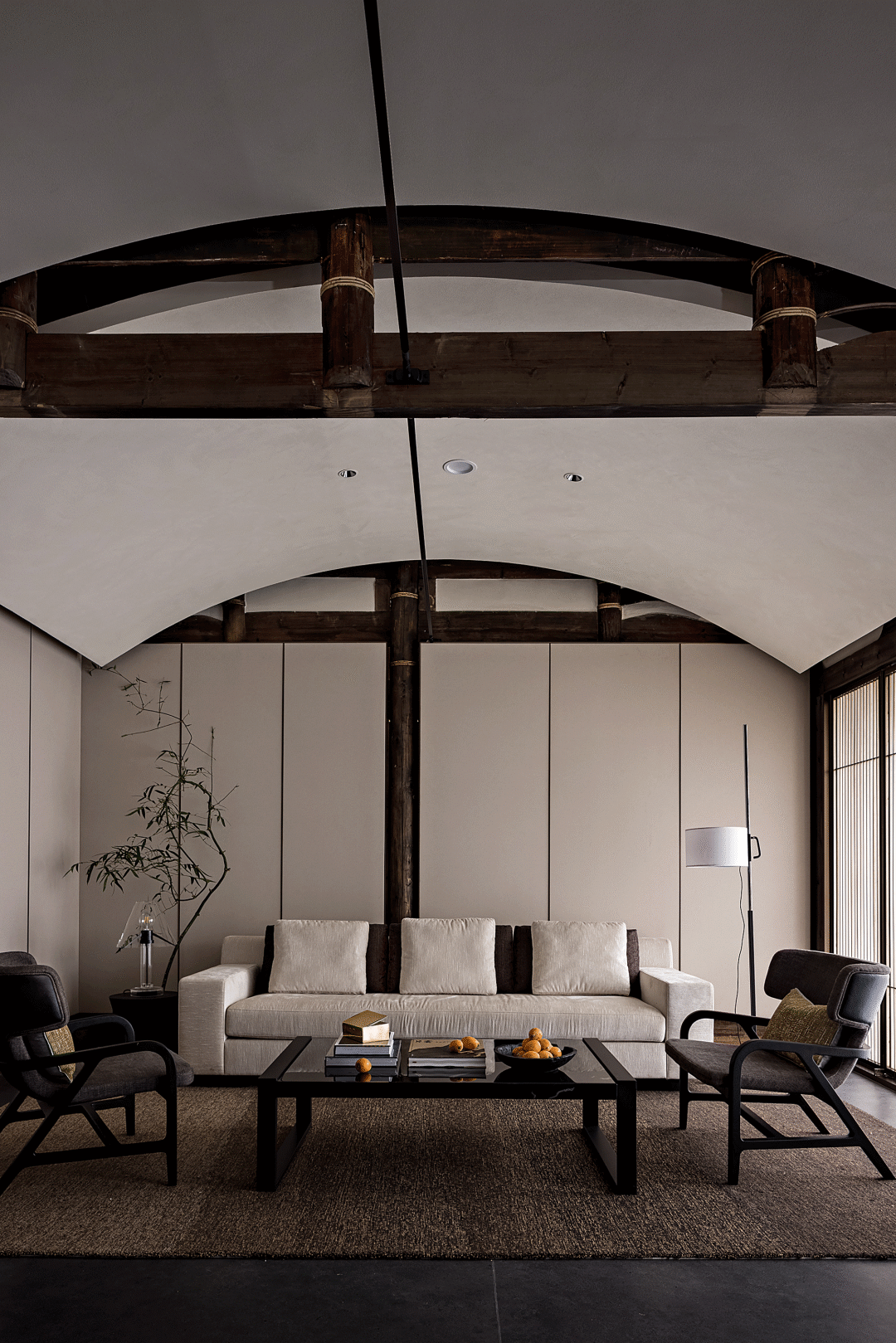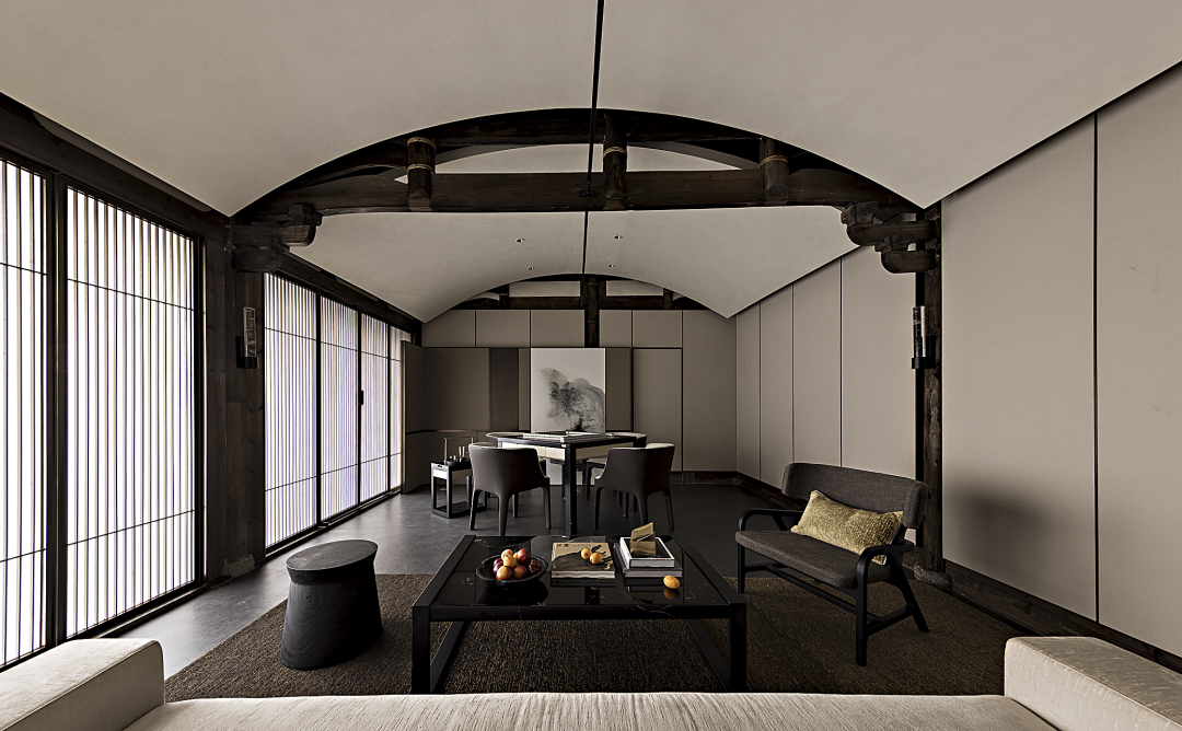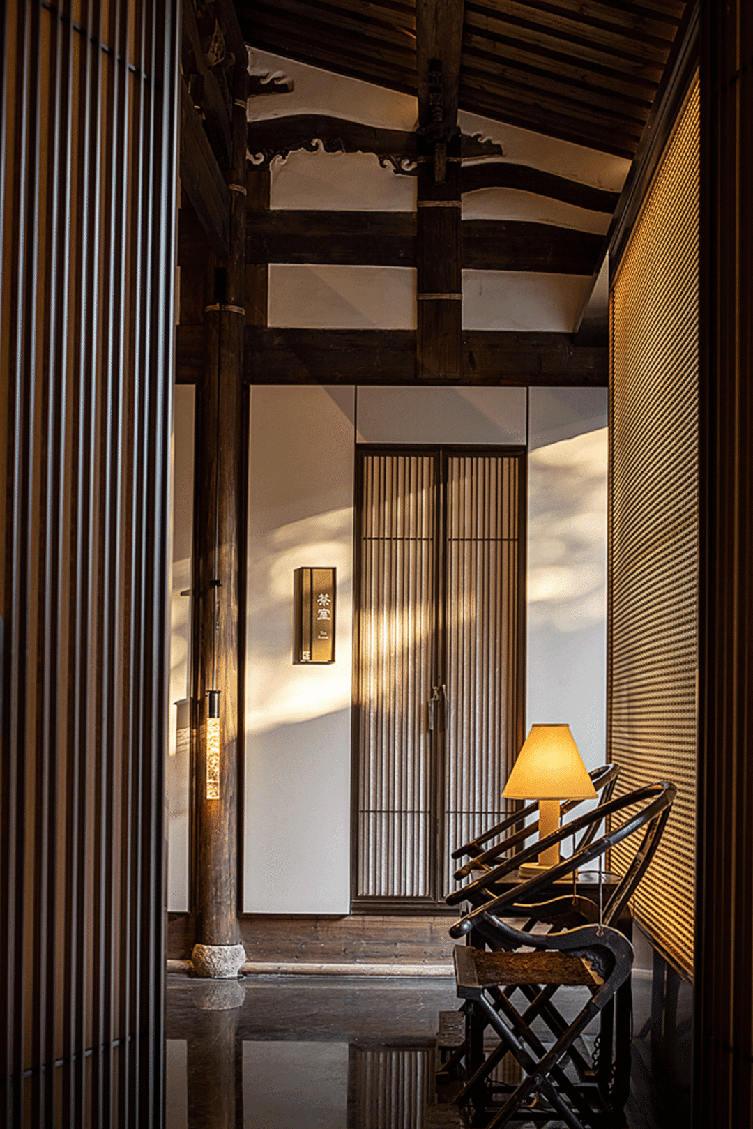 前廳簡單大氣,長年累月中舊物承載著大眾的記憶與情感,色調雅致,拙樸的木梁與室外福州園林的古老橋梁相輔相成,展現特有的生活印記。