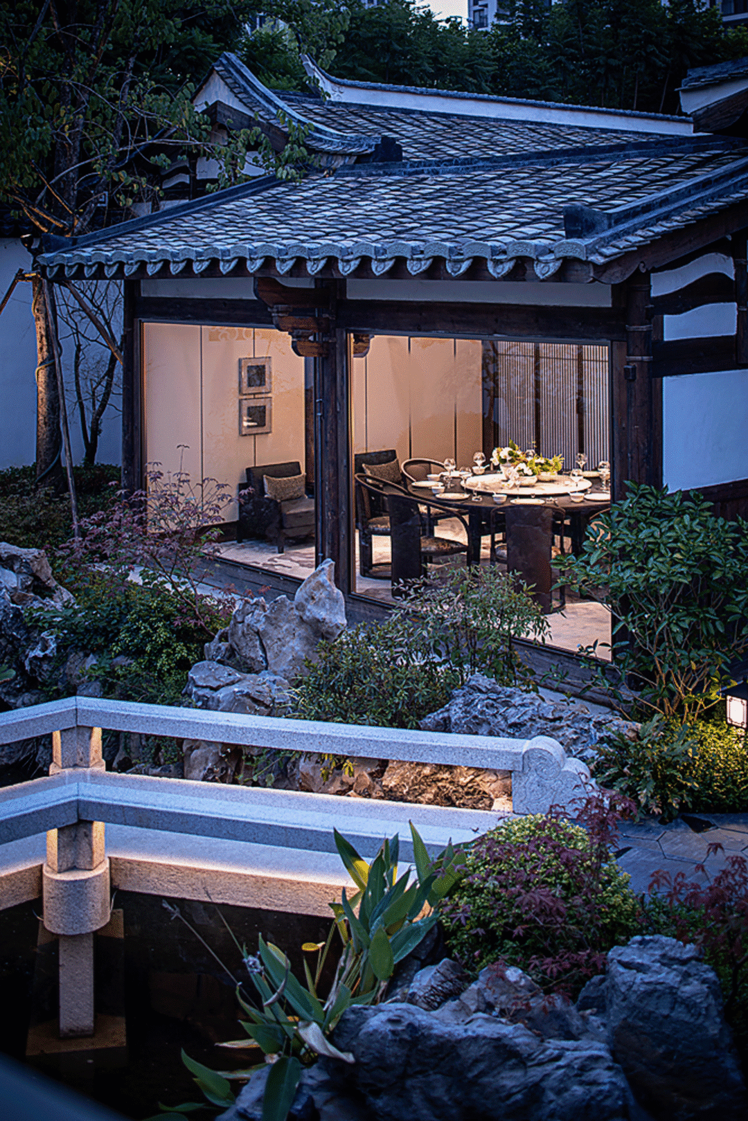 夜幕將場地形態進行二次塑造,利用光影效果的變換,勾勒出庭院的幽靜與深邃,映襯出黛瓦之下的燭光點點,是魚戲蓮葉的悠然自得。
