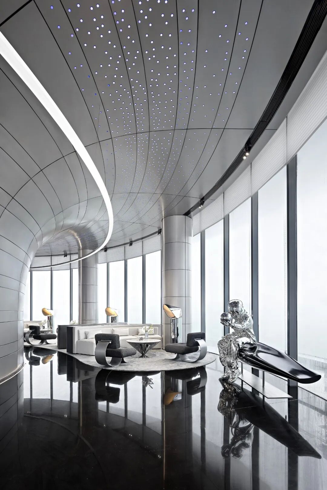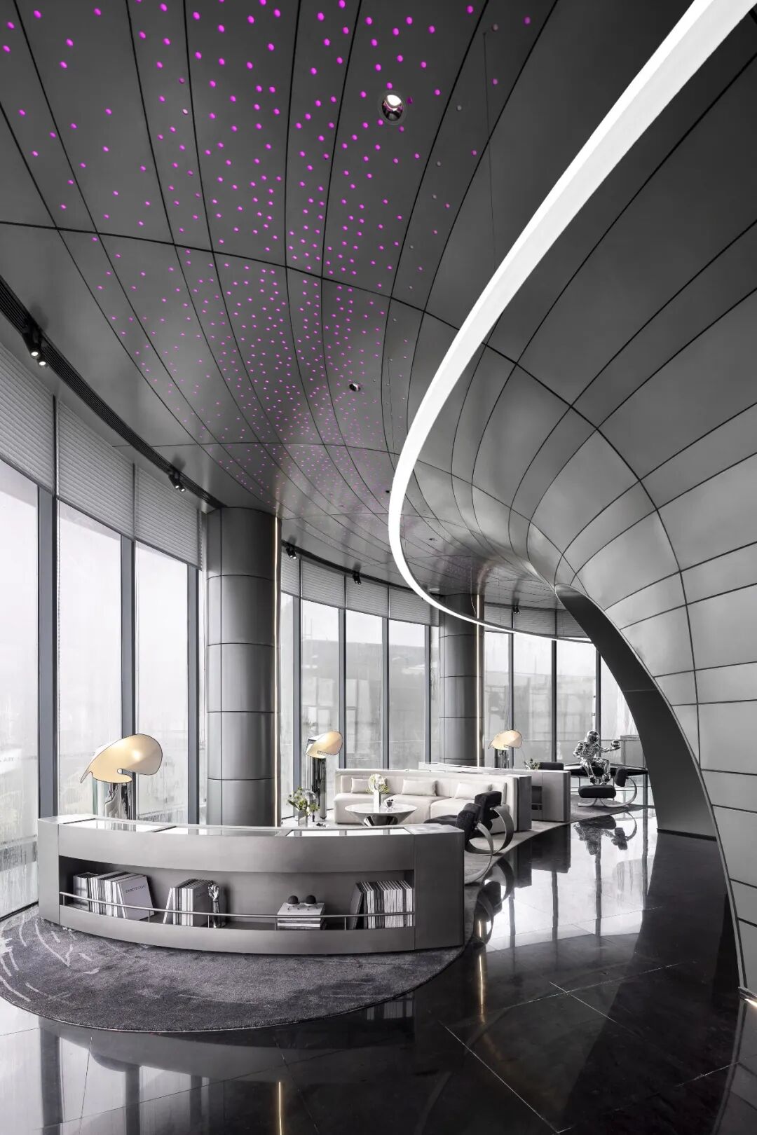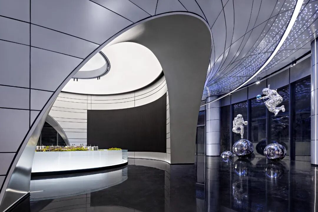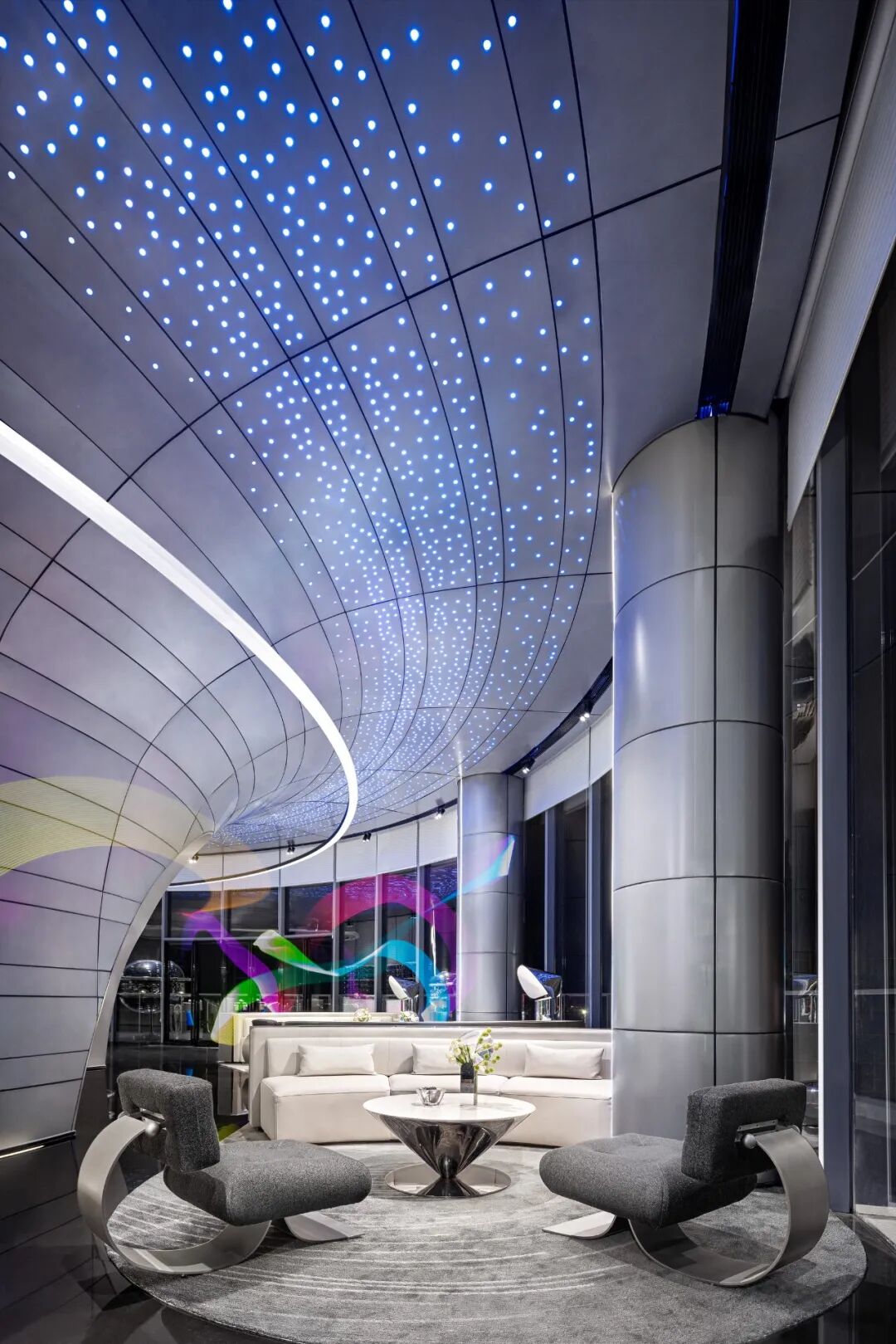 曲線語言描繪著對於未來的無盡探索,雄渾而有力,如同拔地而起的大樹般挺立。大色塊高級灰色鋁板作為載體,頂部天花的穿孔鋁板透過燈光浮動著一片滿天星辰,漸變,閃爍,模糊著現實和理想之間的距離。