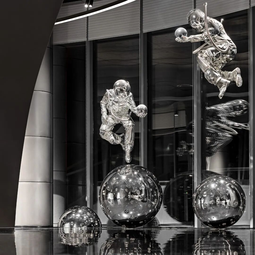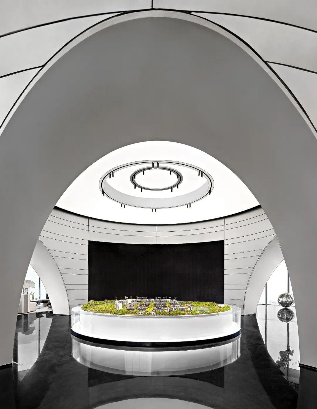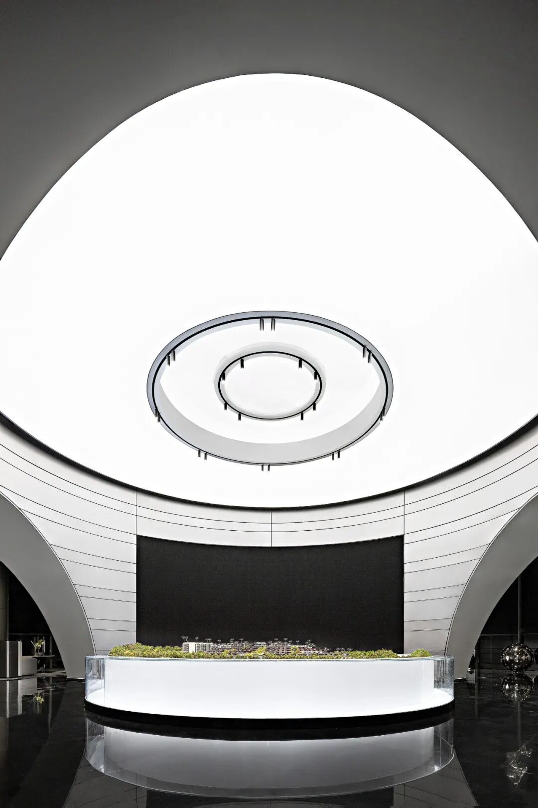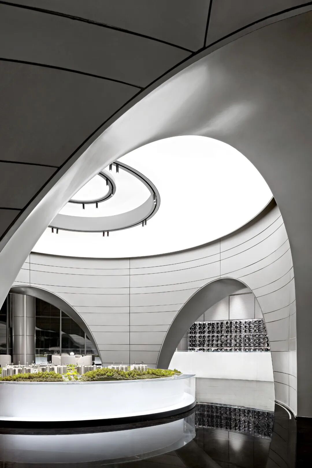 曲線語言描繪著對於未來的無盡探索,雄渾而有力,如同拔地而起的大樹般挺立。大色塊高級灰色鋁板作為載體,頂部天花的穿孔鋁板透過燈光浮動著一片滿天星辰,漸變,閃爍,模糊著現實和理想之間的距離。