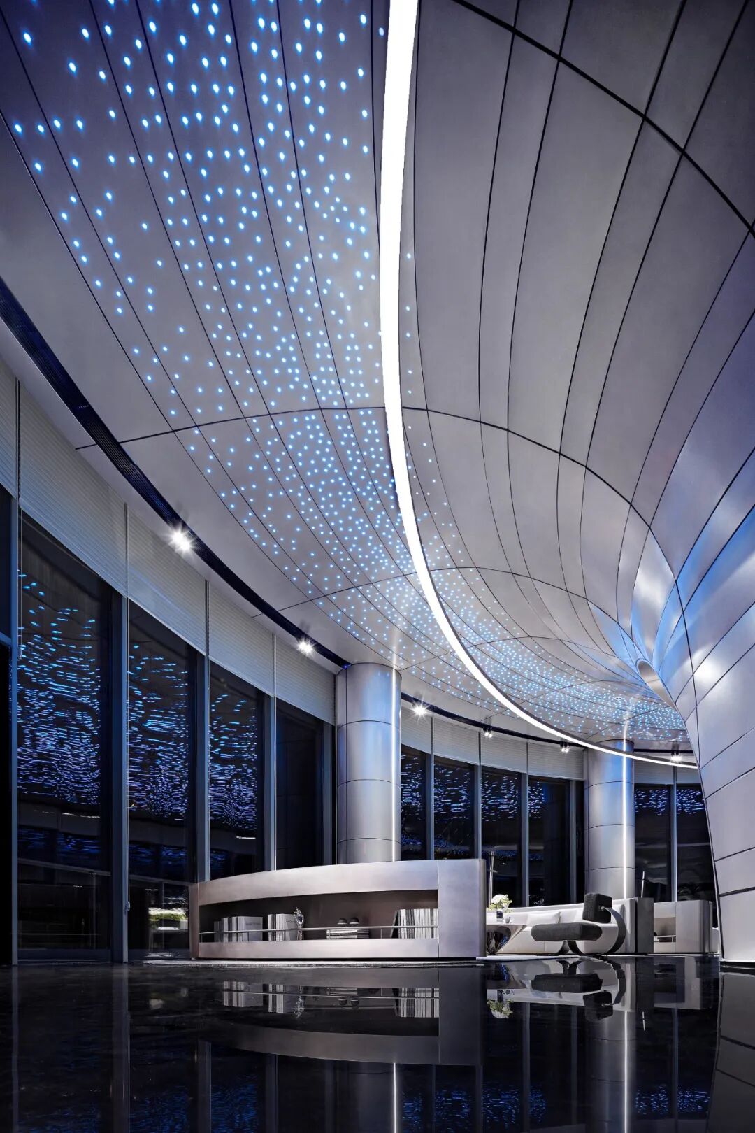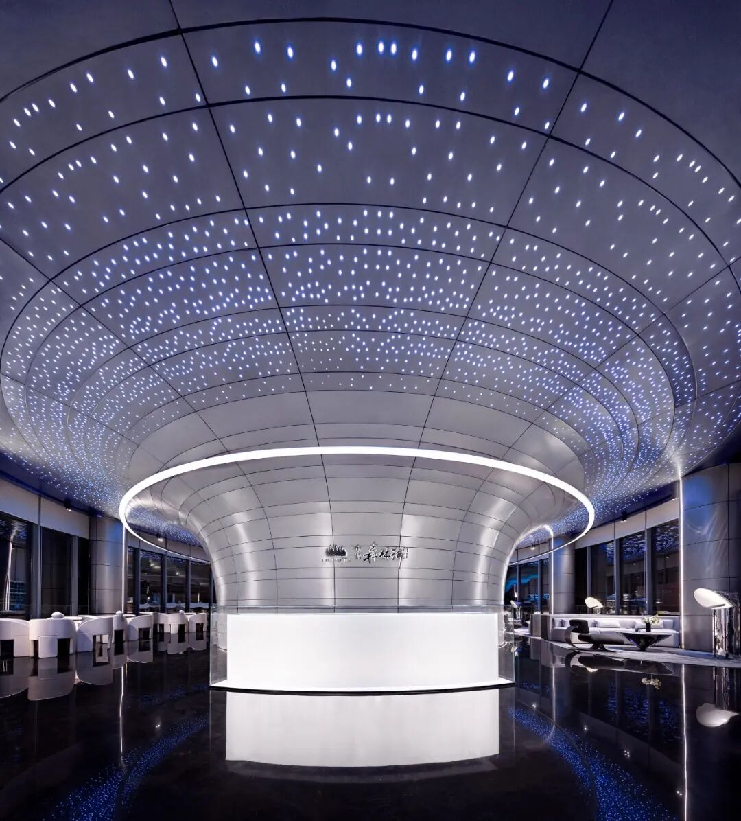 Curvilinear language depicts the endless exploration of the future, vigorous and powerful, like a tree rising from the ground. Large color block high-grade gray aluminum plate as the carrier, the ceiling of the perforated aluminum plate floating through the light a piece of stars, gradual change, flickering, blurring the distance between reality and ideal.