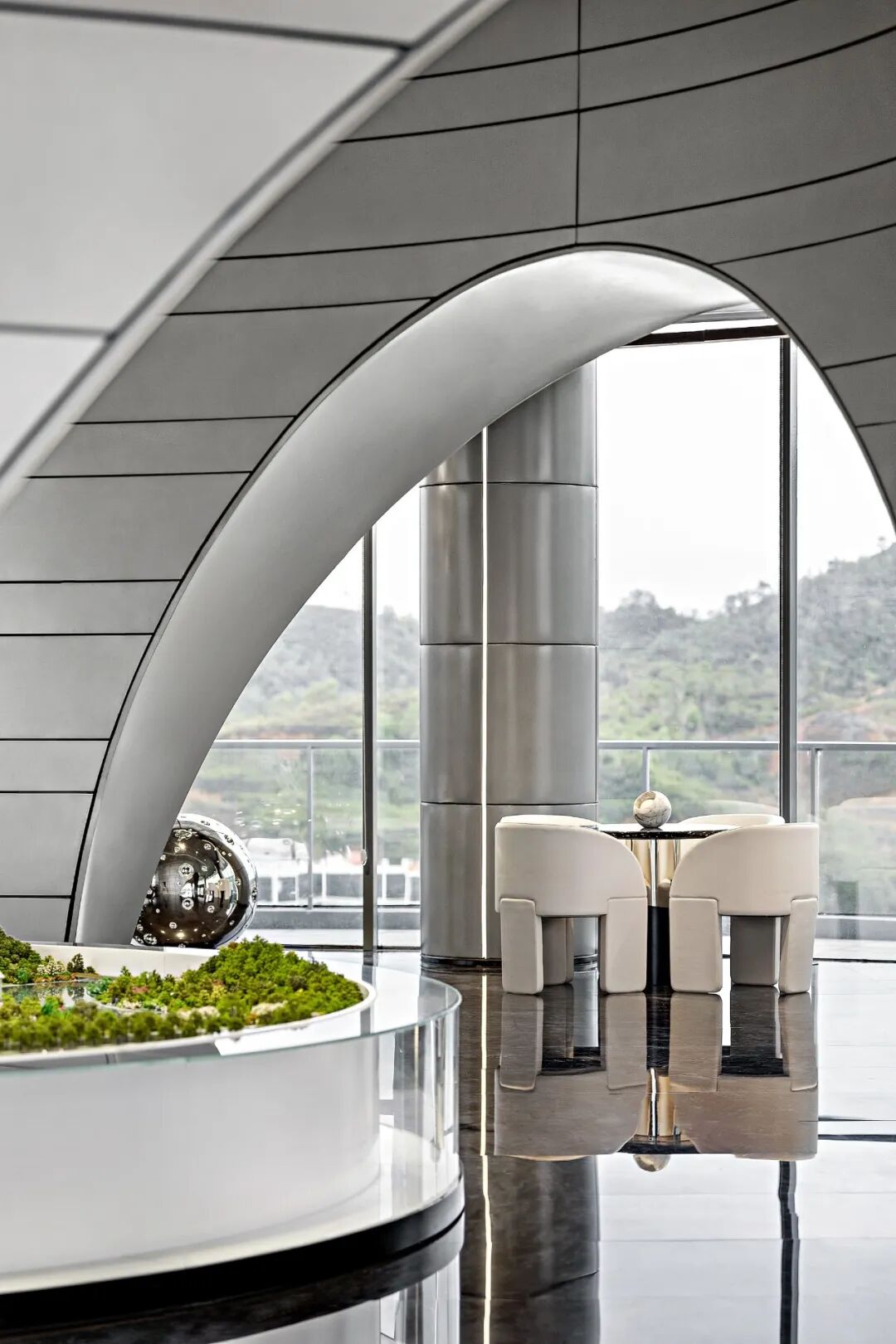 The project is located in the urban-rural integration demonstration Area of smart products in southern New Town, Luhe County, Shanwei City. Under the grand strategic framework of integrated development of Bay Area, the city has strong accessibility. Considering the spirit of the site, the design team pays attention to the connection between nature and emotion. Multiple geometric vocabulary runs through the spatial structure, and the balance between the whole and the details of strong social attributes builds a streamlined free community complex, creating a futuristic island of avant-garde art and technology.