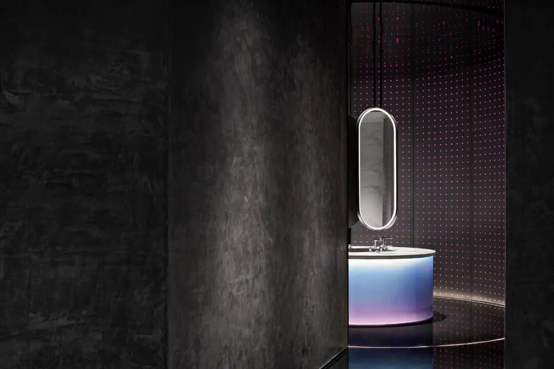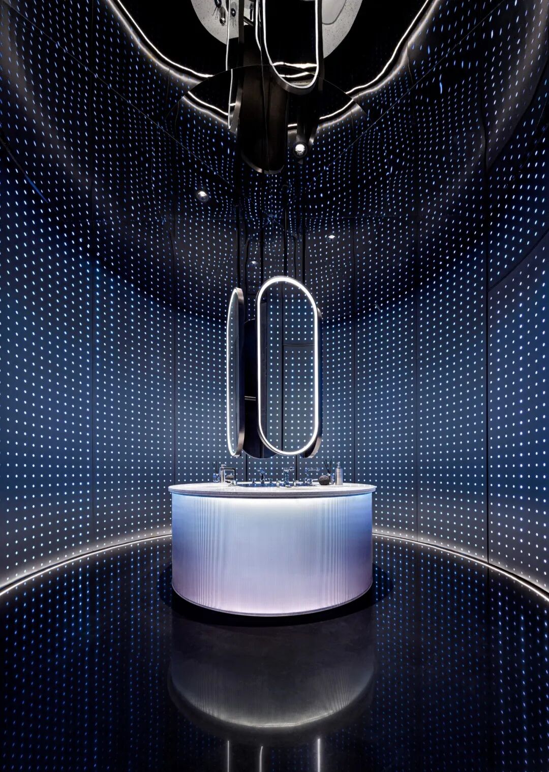 夜晚時,它是璀璨星河;白天時,它是一覽無餘。科技融入生活,呈現著多維互動的生活方式,天花以自然星軌為設計原點的LED動感光束以島嶼中軸為核心而不停轉動。