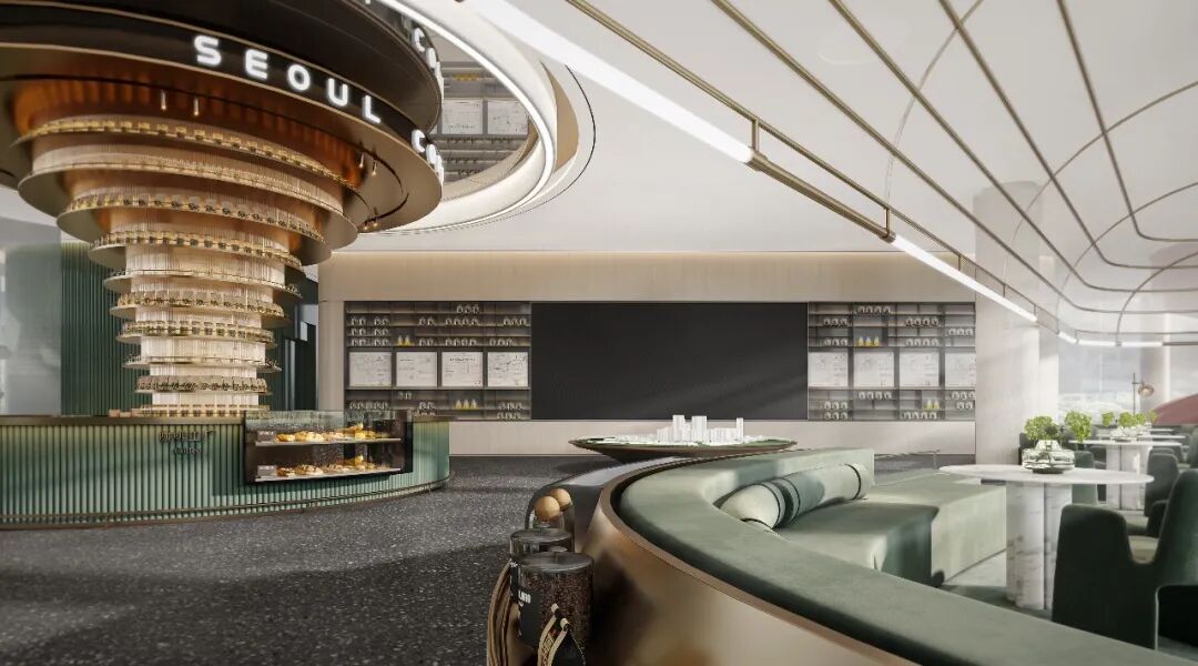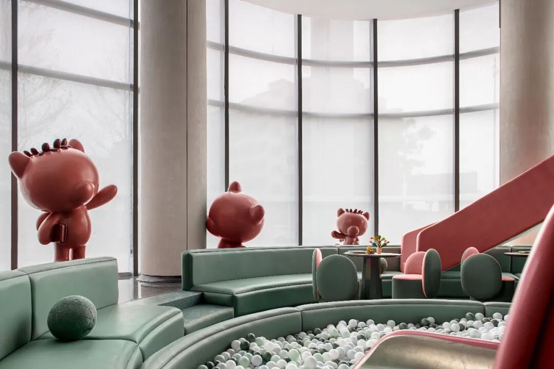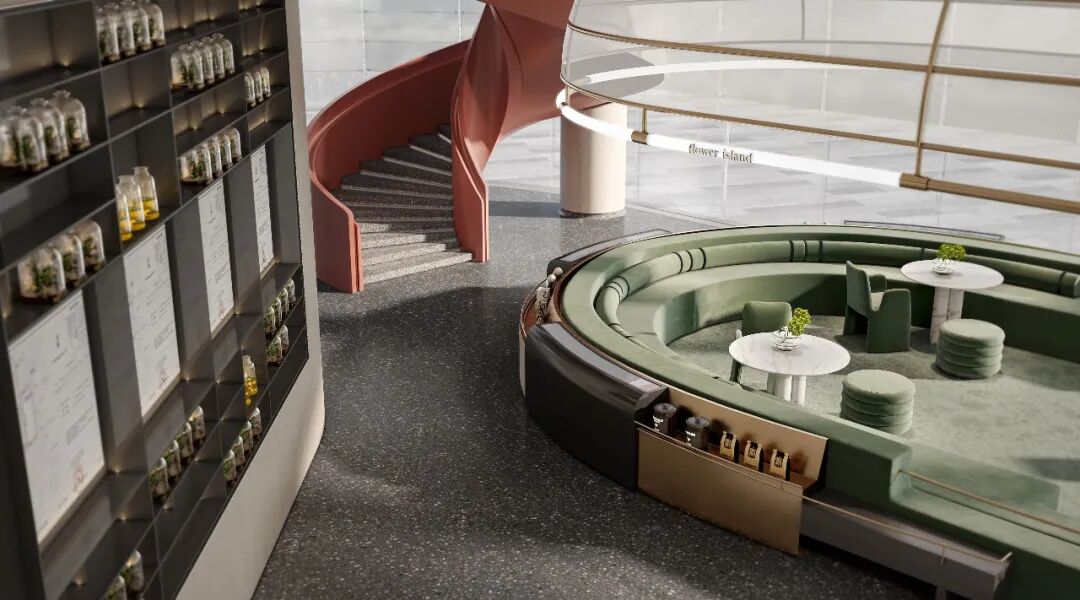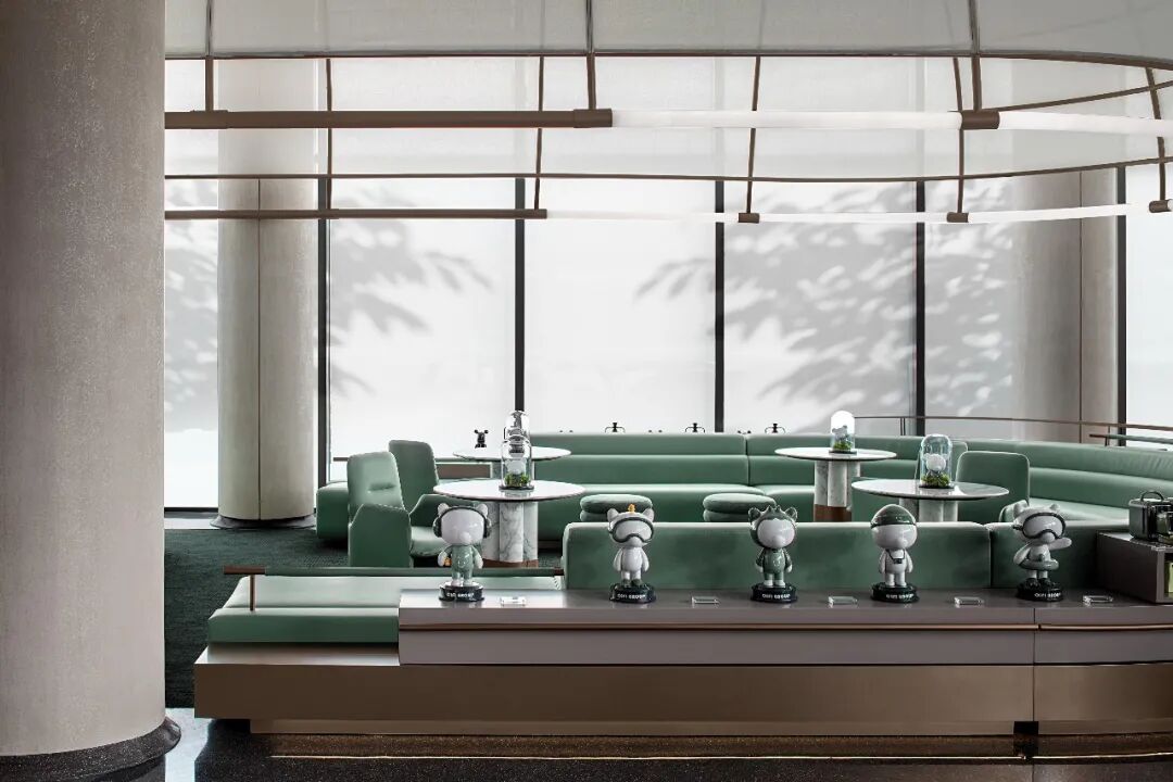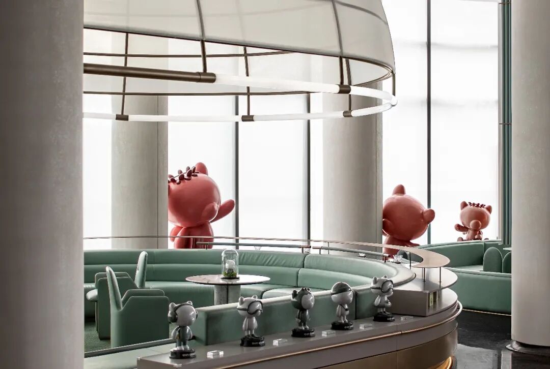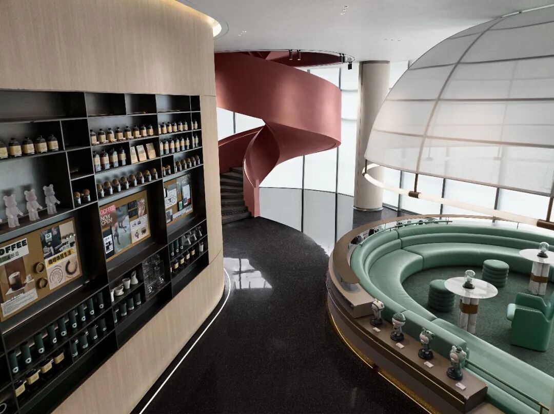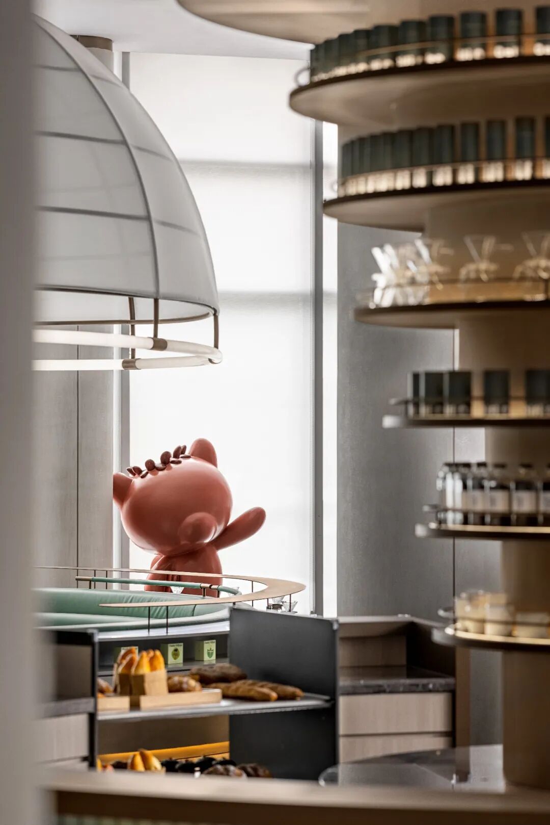 弧形长沙发与空间主体架构甚为吻合,融入天方地圆的东方理念,在顶部融入起伏的山丘,别有一番风趣。旭辉小熊的加入,被花艺拥簇,趣味性与艺术性兼具。沙发背部主要展示咖啡文化产品与在文创品,,咖啡与潮玩元素的陈列氛围,精致高级。