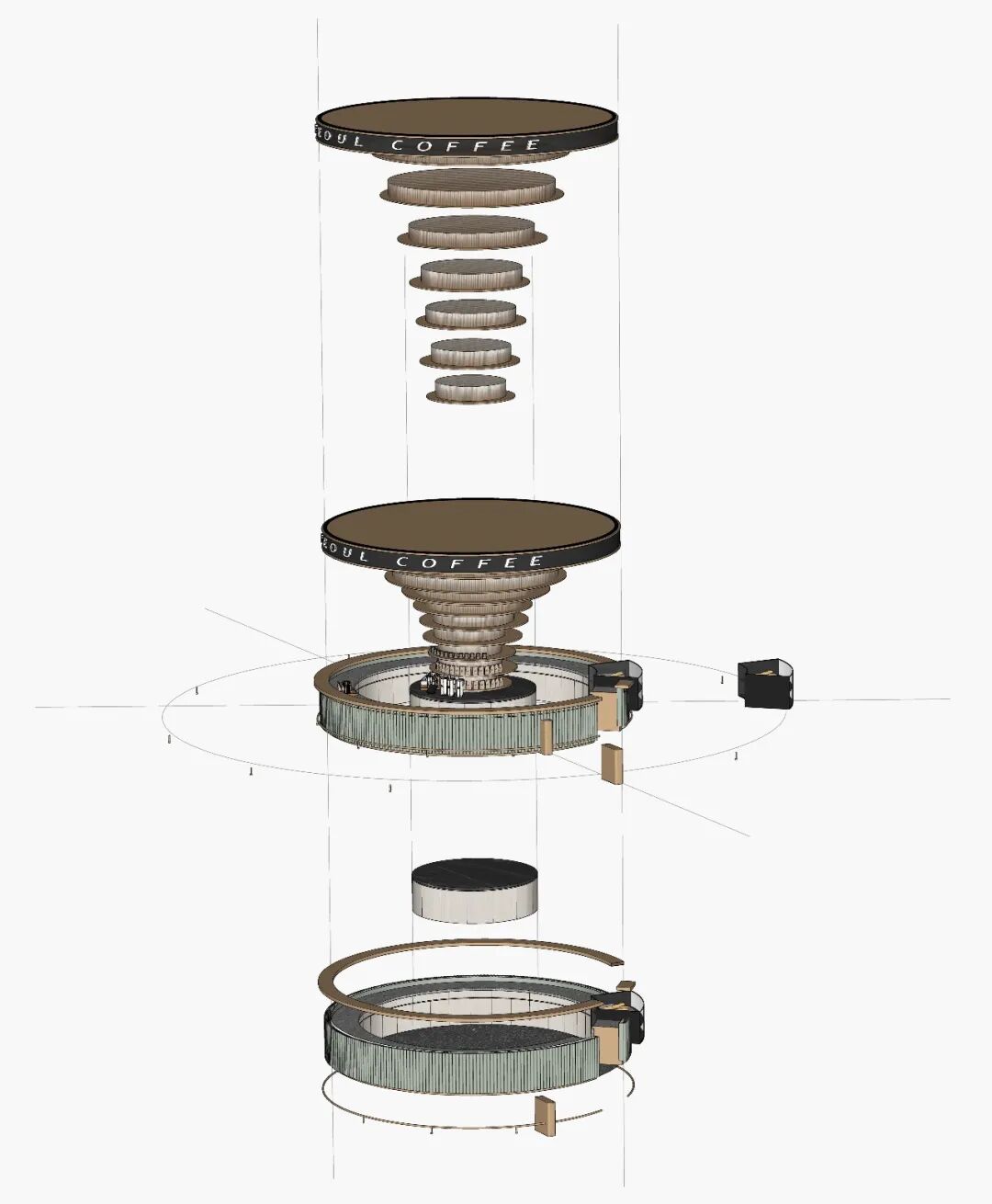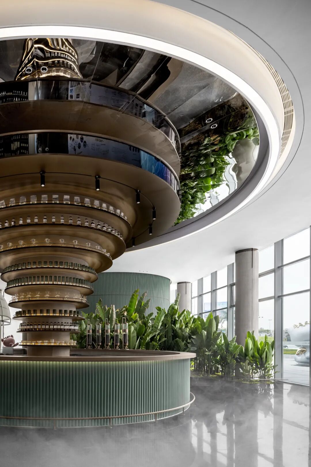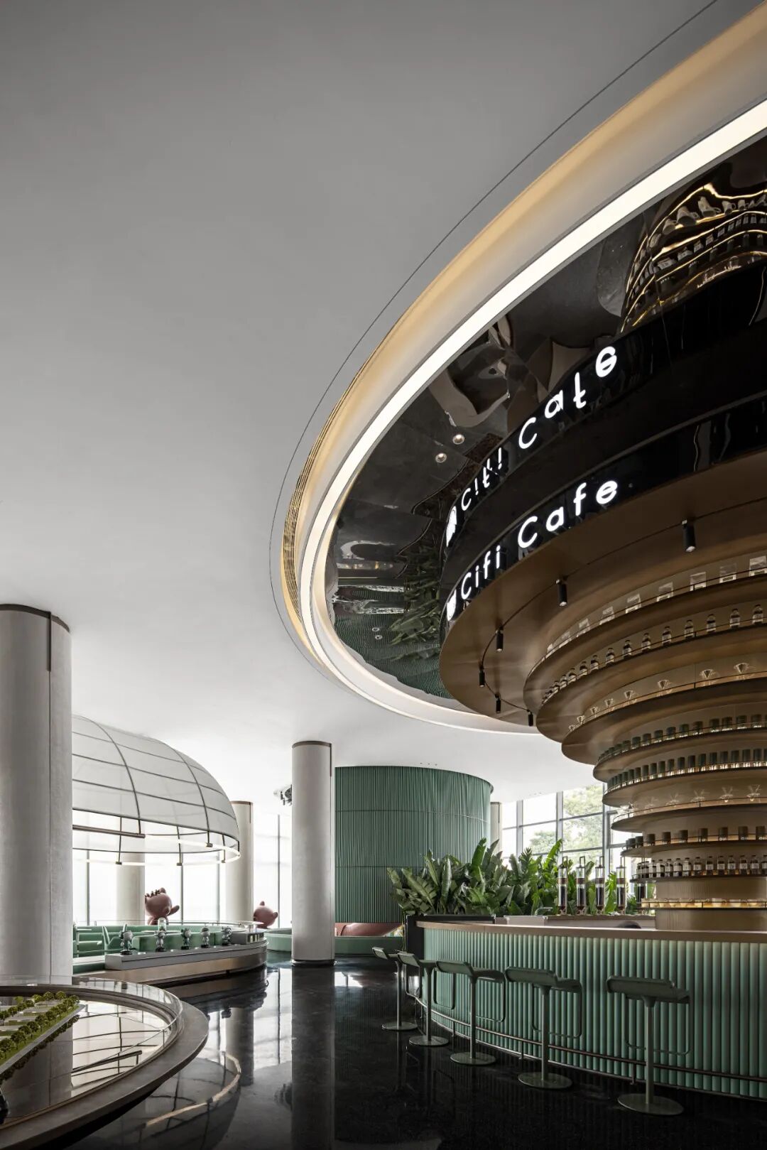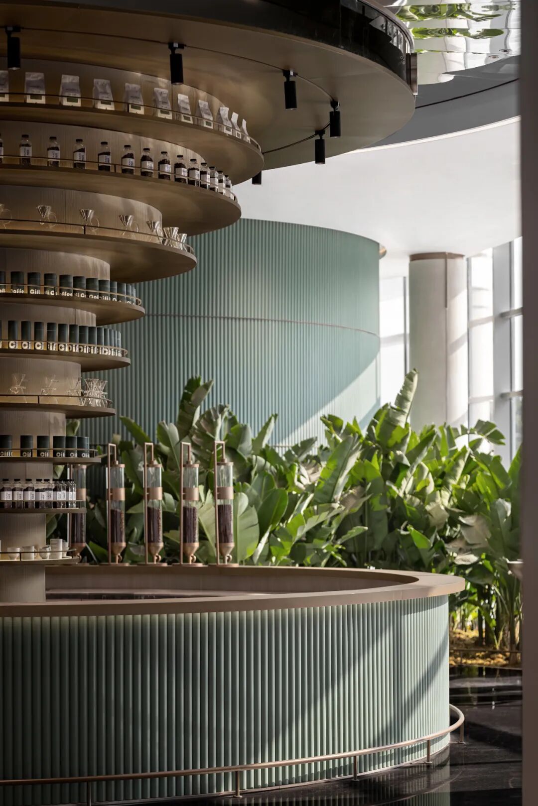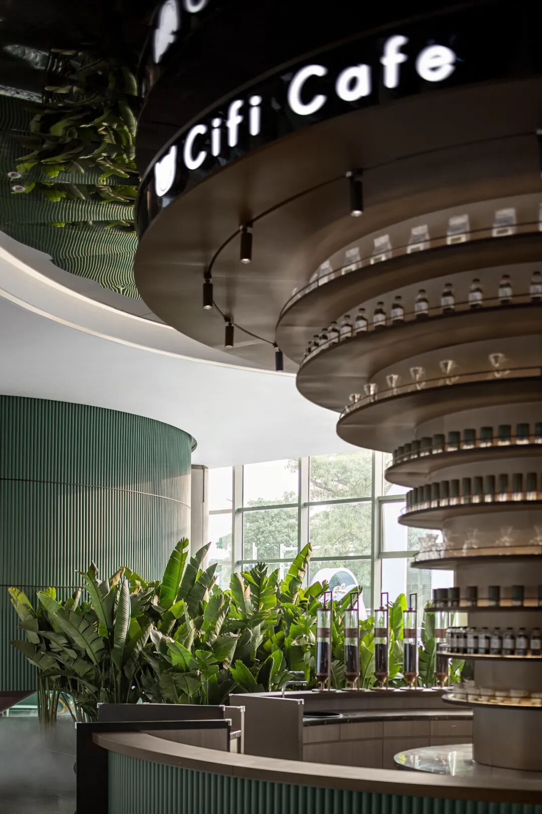 水吧区呈弧线状,层层叠加,释放出一番轻盈的质感。中部以旋转状层架展示Cifi Coffee的品牌产品,建立起空间与品牌之间的互动联系,也带来向上的疏阔感受,使之成为人们的视觉焦点。