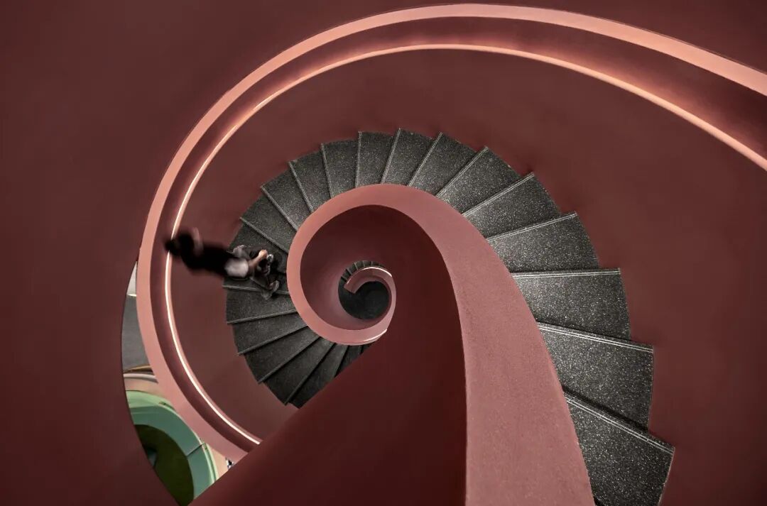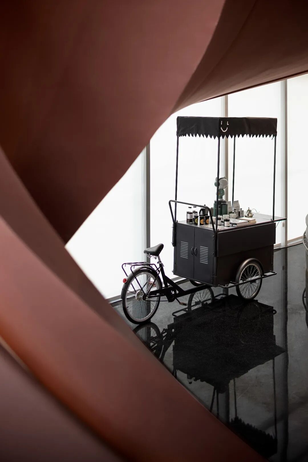 沿着阶梯逐渐向上,自然流畅的曲线传达出空间的洒脱与随性,橘红色墙体带着岭南独有的韵味,在透射的光影下引入一处纯粹神秘的氛围。视野中的复古三轮车,在现代的设计中又不乏文化的延续性。