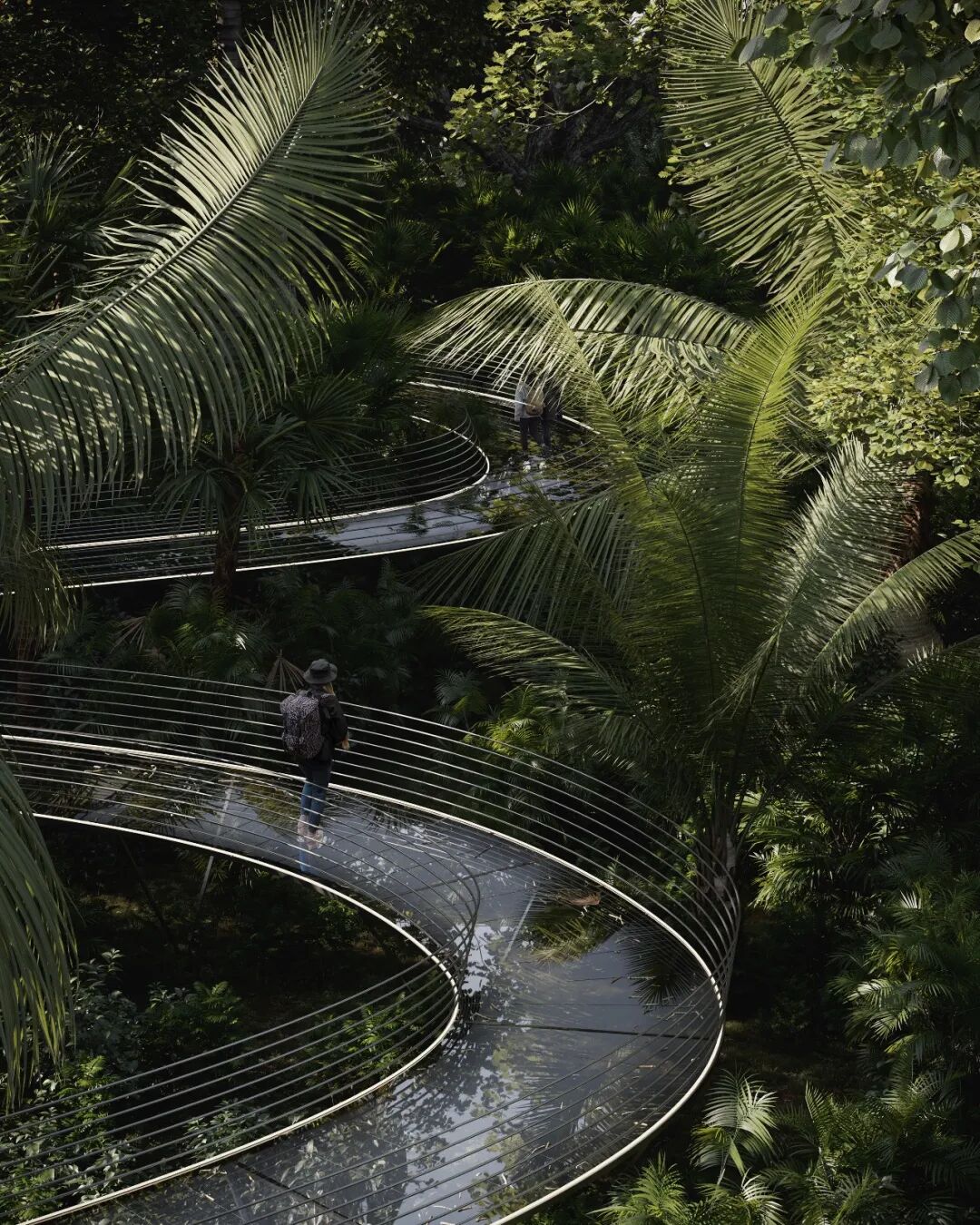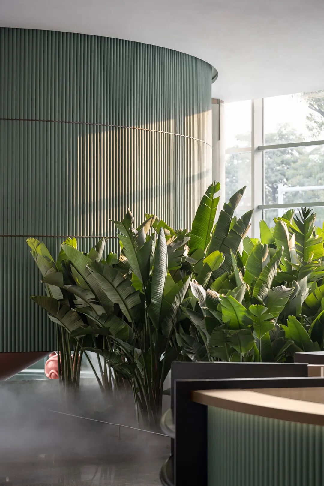 接待前厅以“城市自然美学馆”为起点,选择打造一处四季如歌的“迷幻森林”,突破性地将大片天堂鸟植物种植在空间内,去阐述城市新生活的无限可能。植物环绕,叶片高低错落,姿态优美,如置身于森林之中,在灵动雅致的空间中使视觉层次更为丰富之余,也有城市新生,重返自然的美好向往。