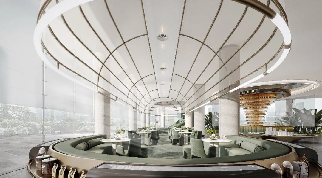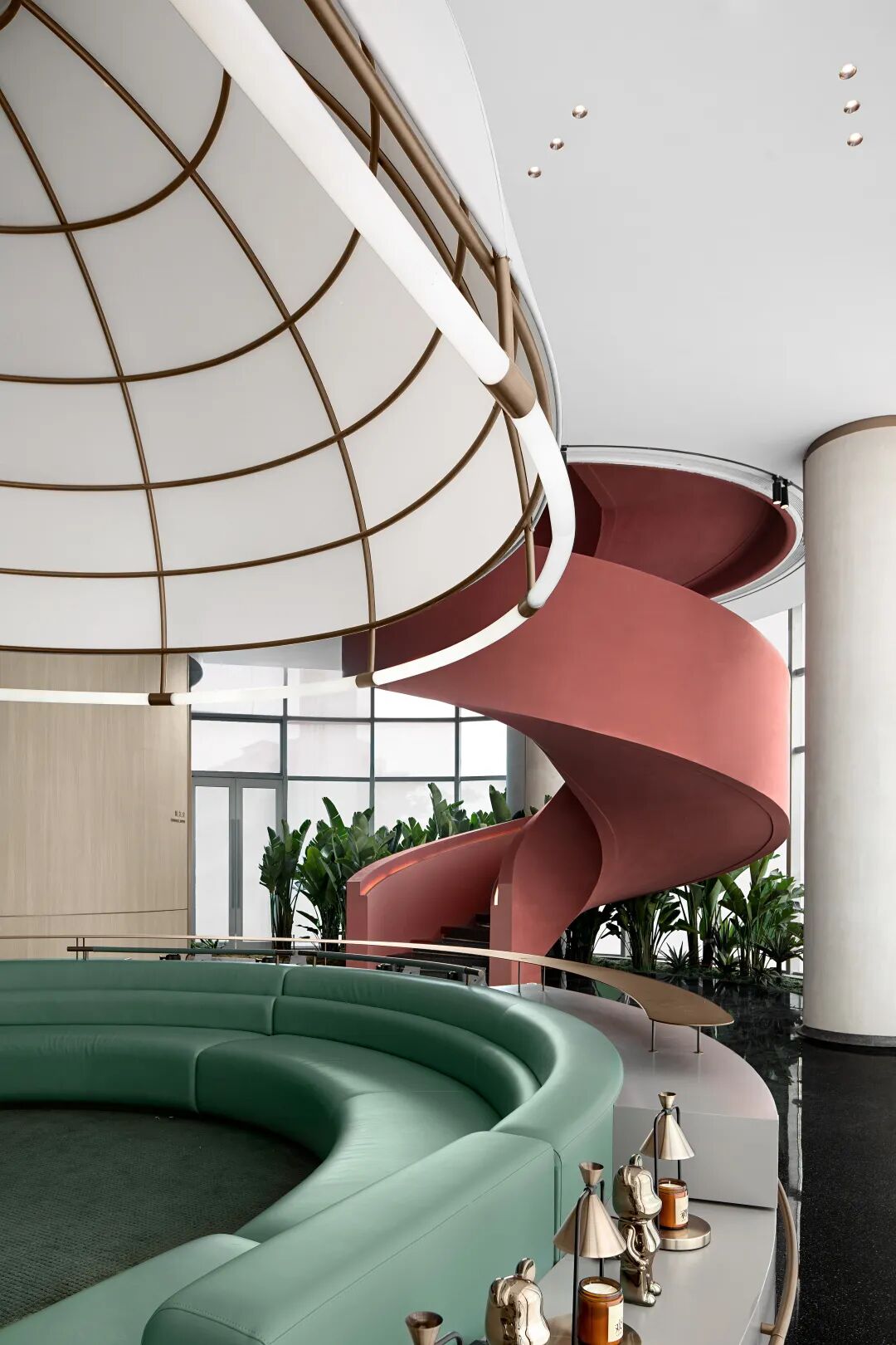 洽谈区空间顶部结合咖啡馆大伞造型,整体布局与天花弧形相互呼应,动线舒适流畅,增强空间流线感,传递着轻松浪漫的空间意境。金属、大理石的有机结合,营造出城市强烈的秩序感与仪式感,花艺的点缀灵动又具诗意,使其呈现出现代时尚又富有质感的空间感受。