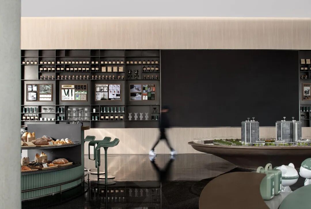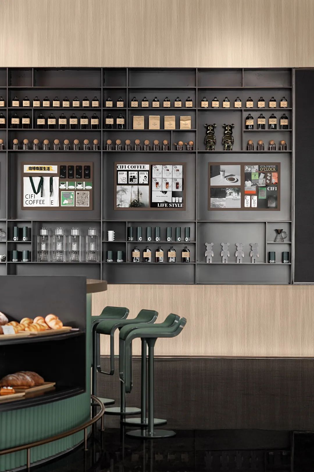 咖啡的主题与摆放整齐的展陈,在丰富墙面视觉层次之余,使整个空间充满生活小资情调,人们远离城市喧嚣静坐在此,手捧一杯咖啡,轻嗅其中芳香,尽情享受生活闲适时光。