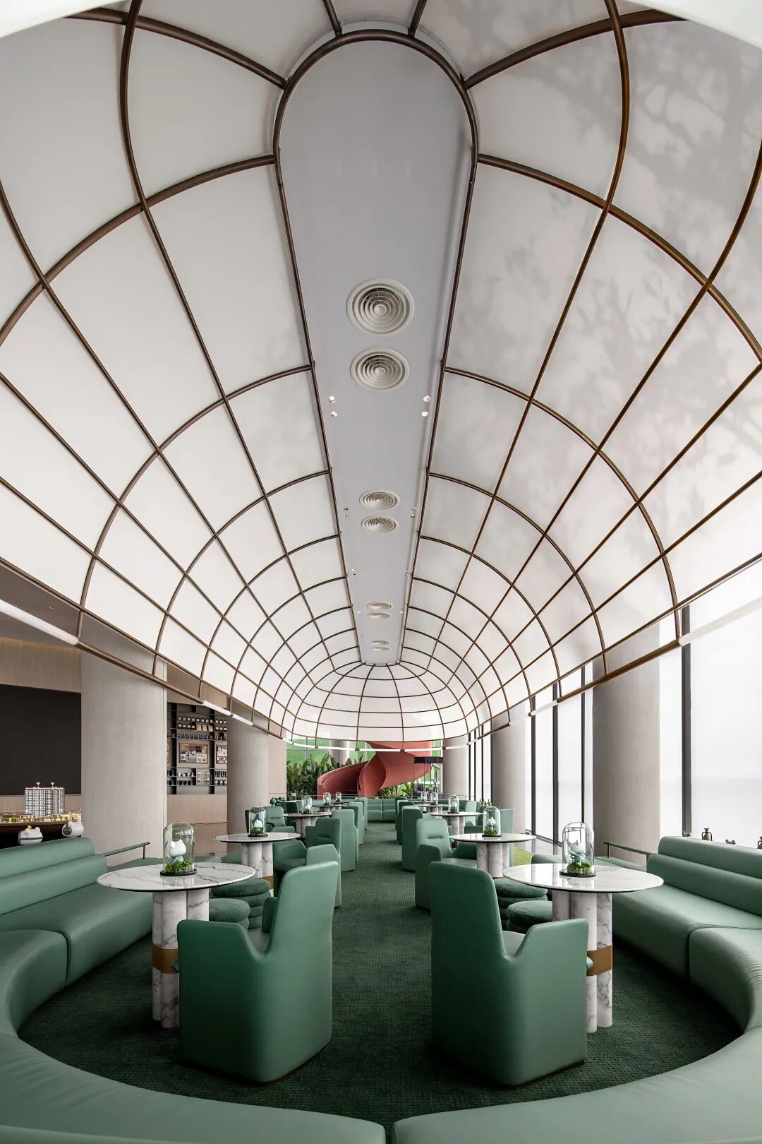 私宴厅既是情与味的相融,也是美学与文化的交织,设计师取的“团圆”之意,运用以圆顶、圆灯,圆桌、圆盘等元素,勾勒出东方欣欣向荣,团圆美满的景象,入目所及的绿色条纹木栅格与纱质窗帘,以半通透的形式去丰富整个空间的层次,既强调了现代美学的艺术氛围,又富有中式的韵味禅意。