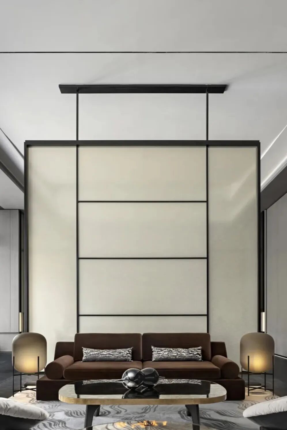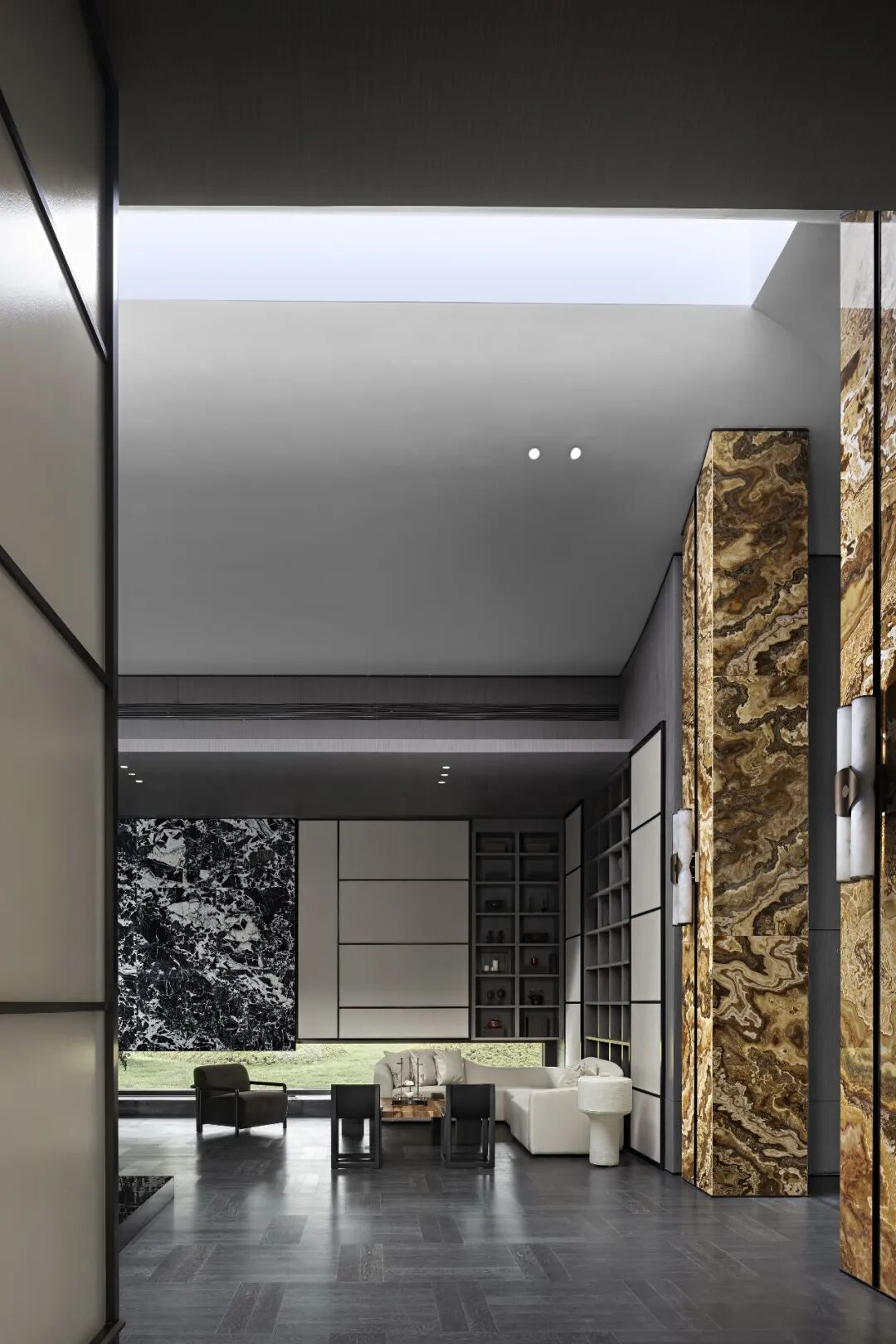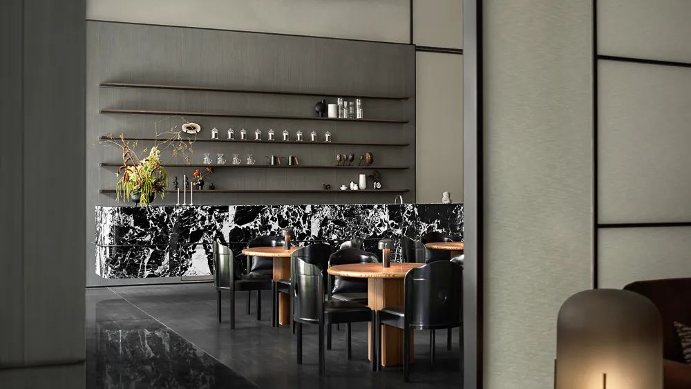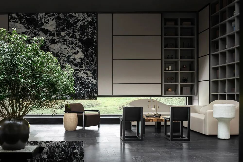在沉稳内敛黑白灰色调中,调和些许自然石材带来的棕调,使整体空间显得雅致而又舒适,户外风景与之呼应,令人更易进入悠然平静的心境。