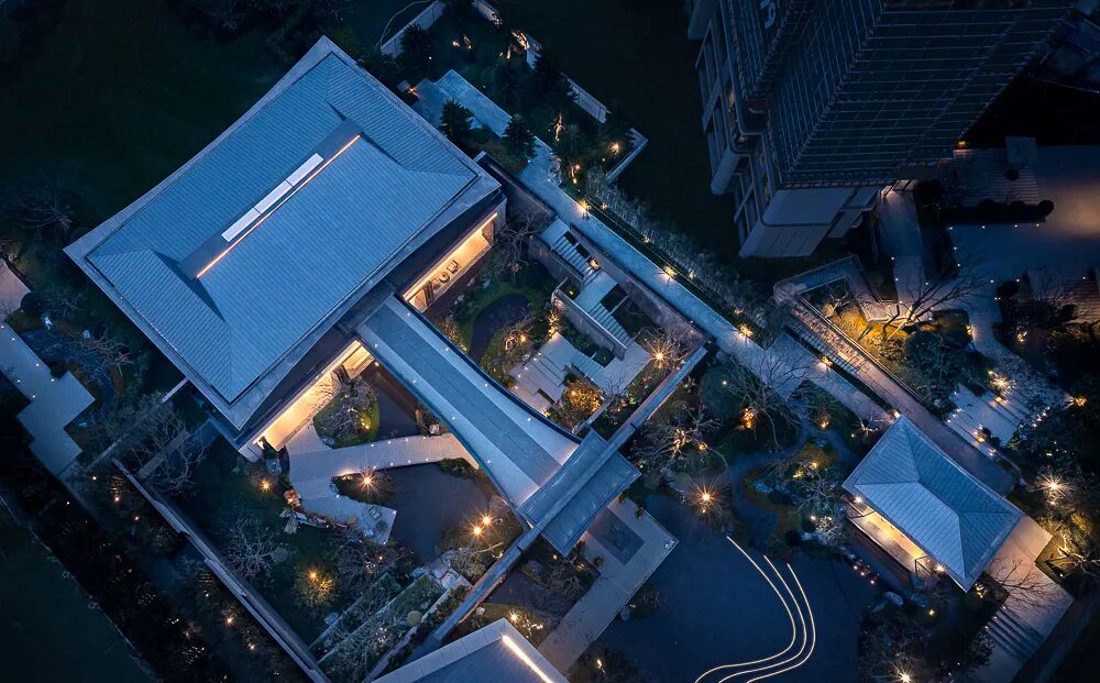 售楼处入口通过前场庭院和一进水院二进下沉景观庭院的动线进入,回归传统园林的归家秩序与游园体验。