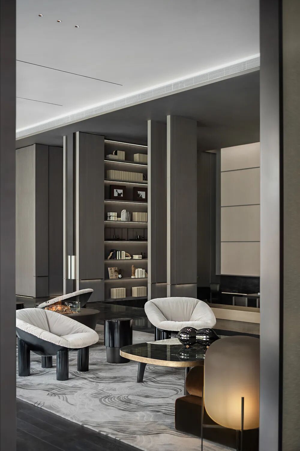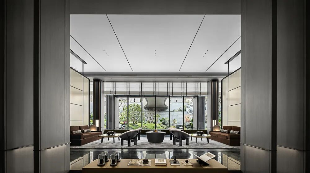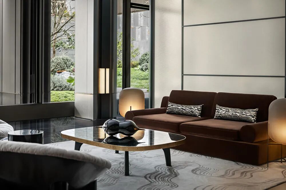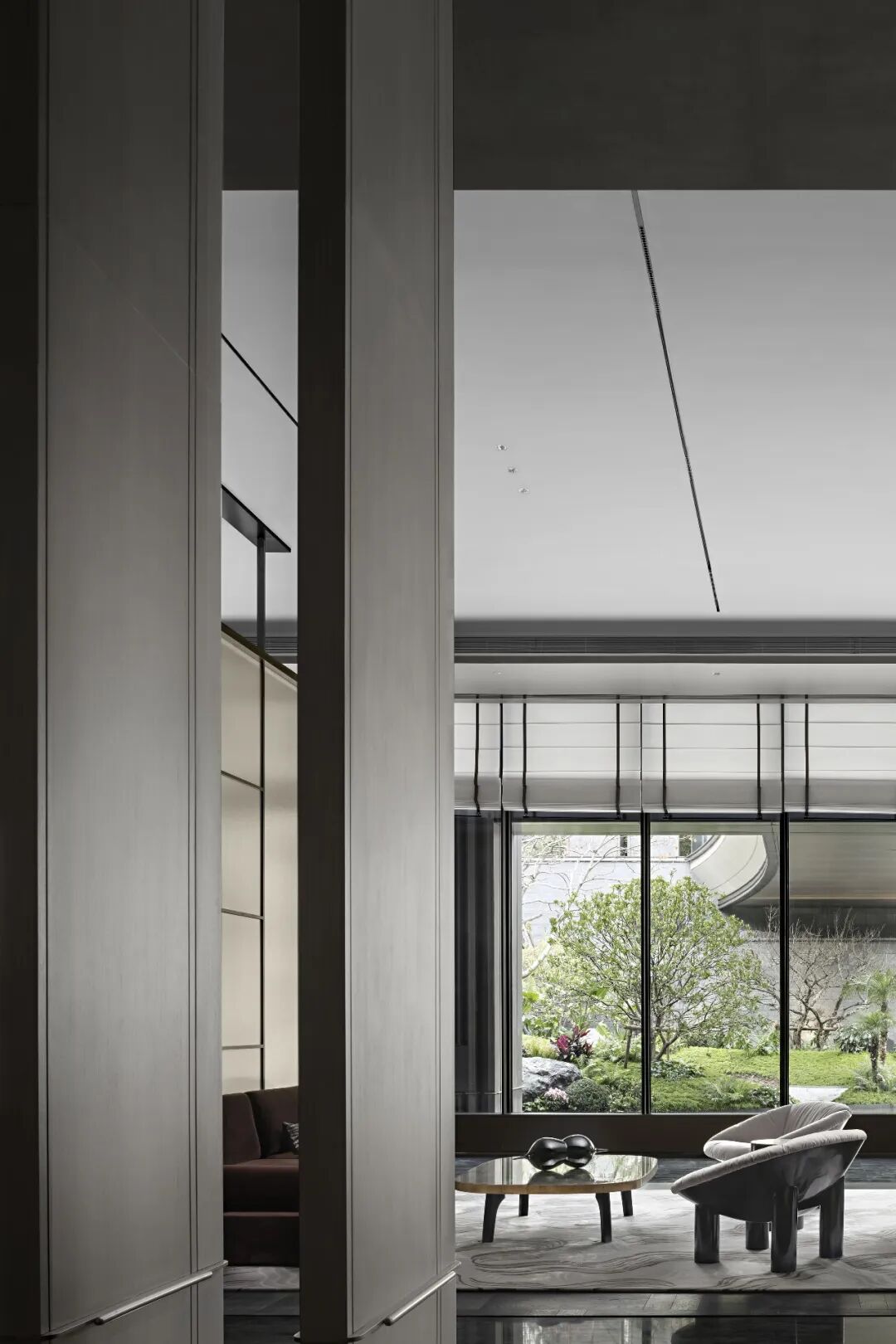 洽谈区是集雅奢与静美于一体的社交空间,提取东方美学造型通过借景形式与中庭景观融为一体,加上返璞归真的东方意蕴,匠造别具格调的东方府院生活情景。