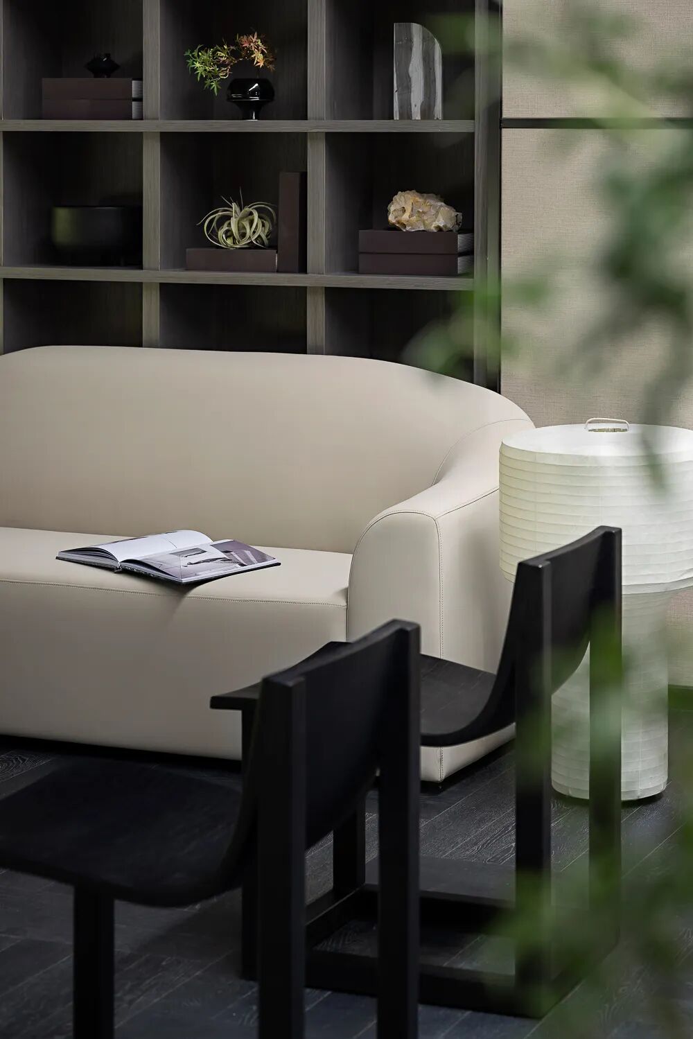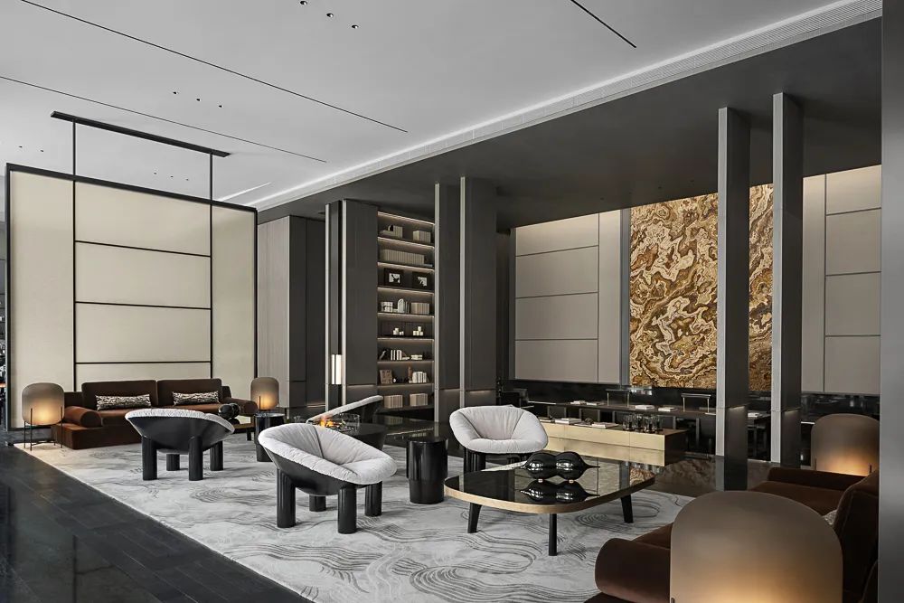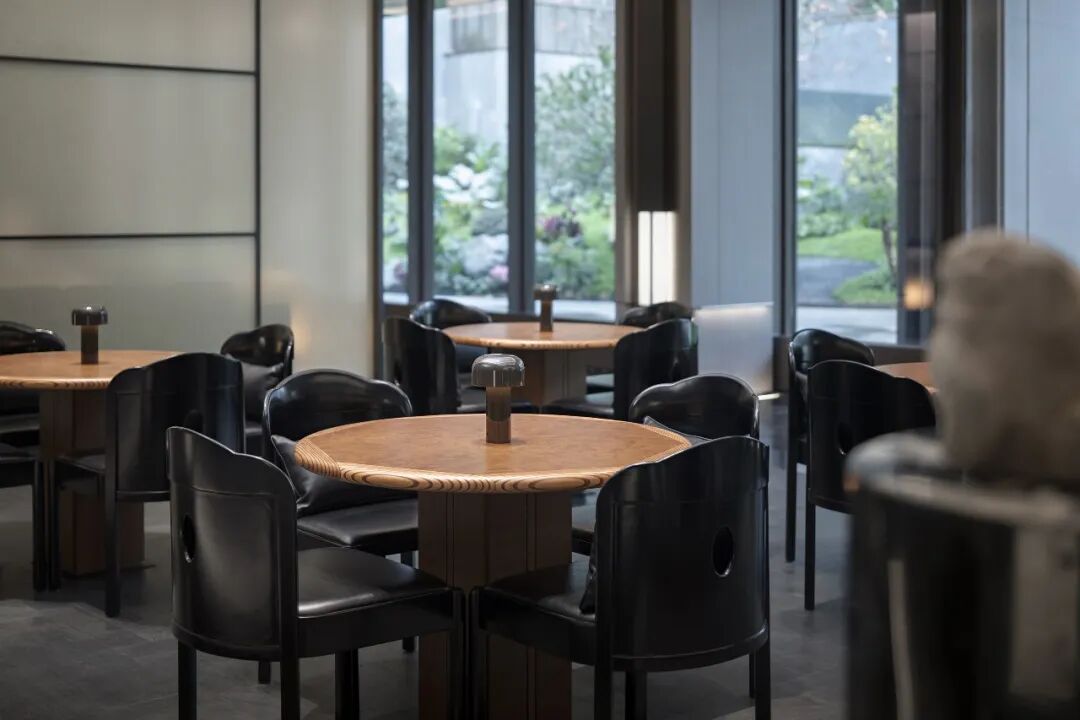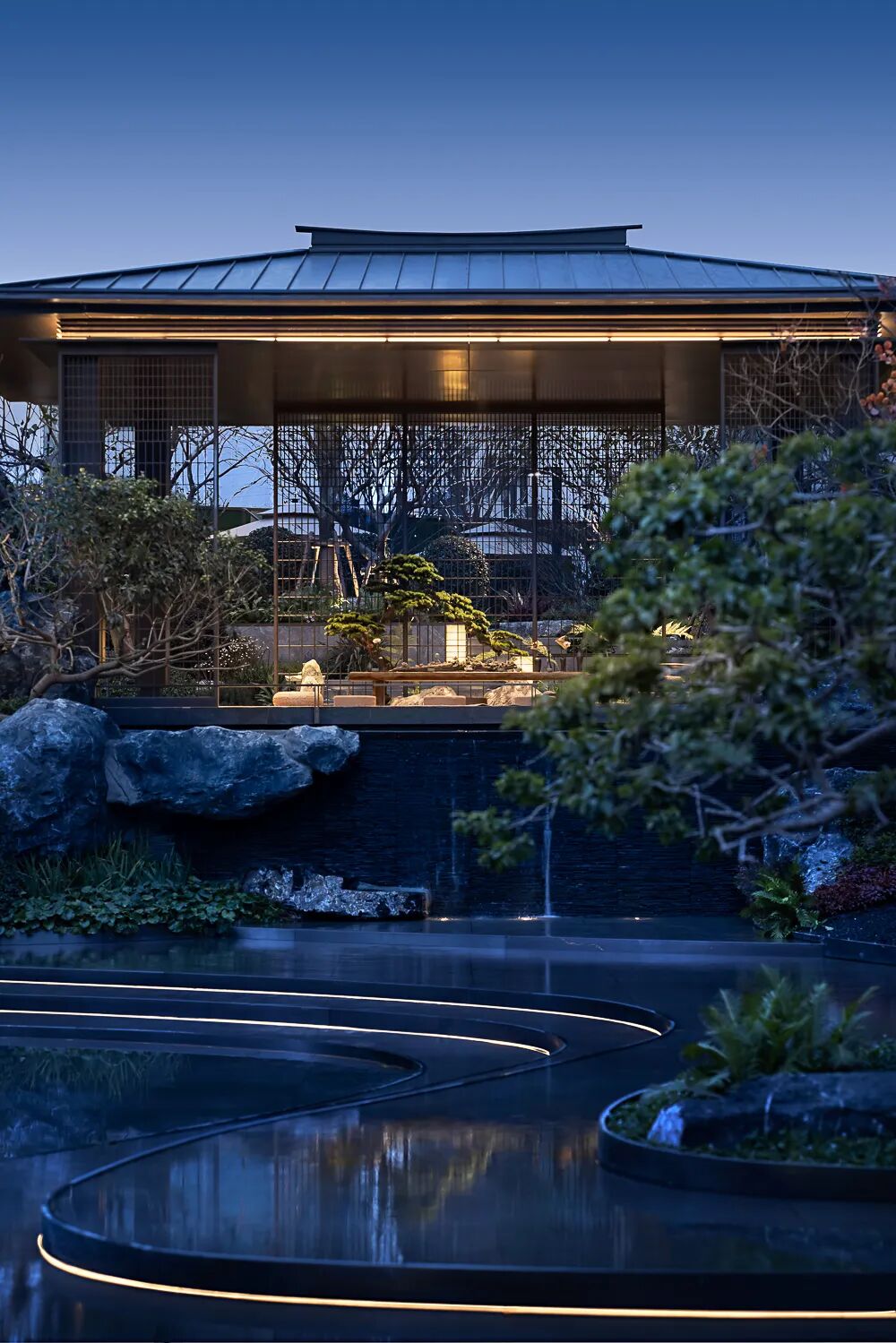 洽谈区是集雅奢与静美于一体的社交空间,提取东方美学造型通过借景形式与中庭景观融为一体,加上返璞归真的东方意蕴,匠造别具格调的东方府院生活情景。