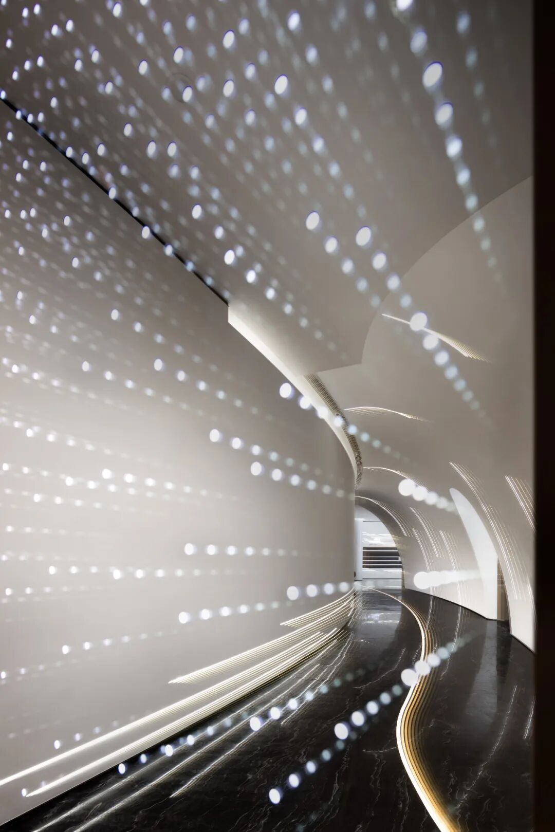 从而在灯光的延伸中,体验着体块的构成与穿插,塑造着时光隧道的万千鎏金。