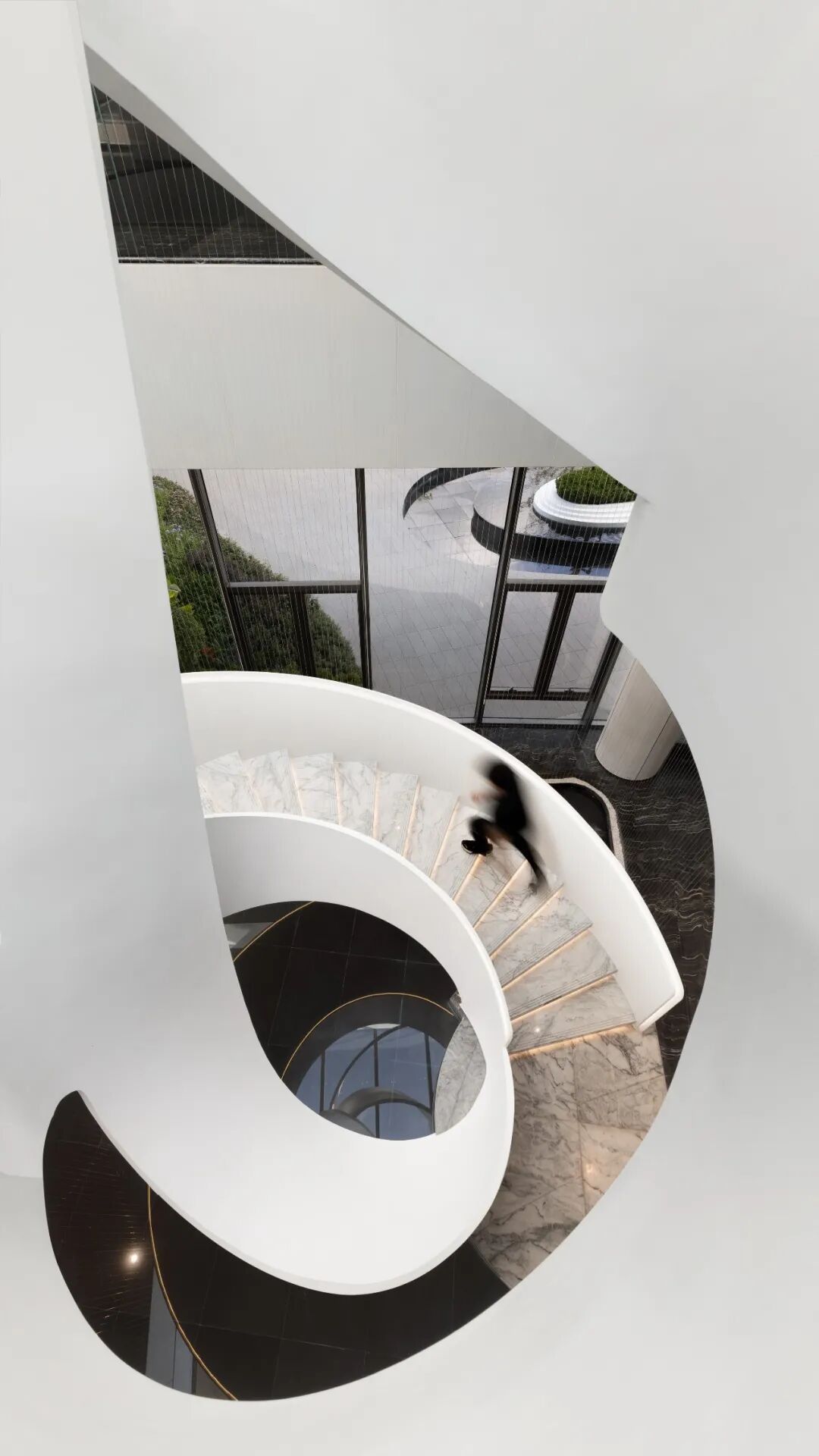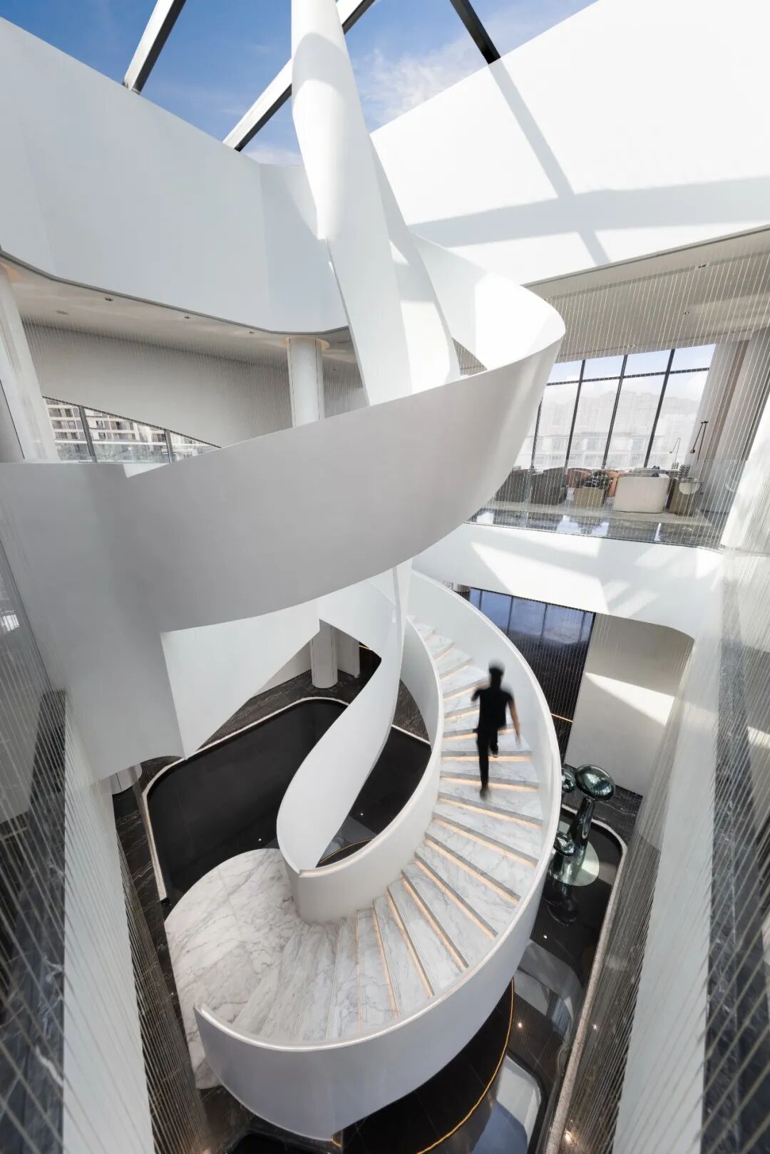 旋转艺术楼梯,既承担着空间功能性的衔接,也成为不同角度的观光之地,由上至下,天光一泻千里,从而保证室内能够宽敞而明亮。