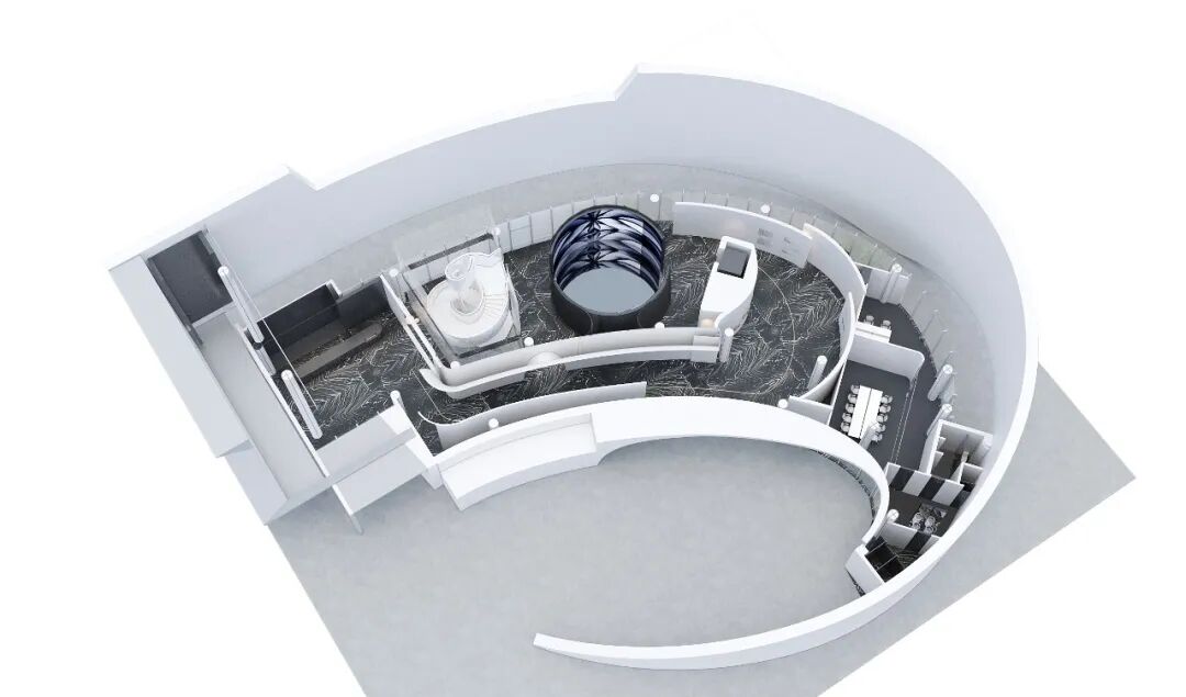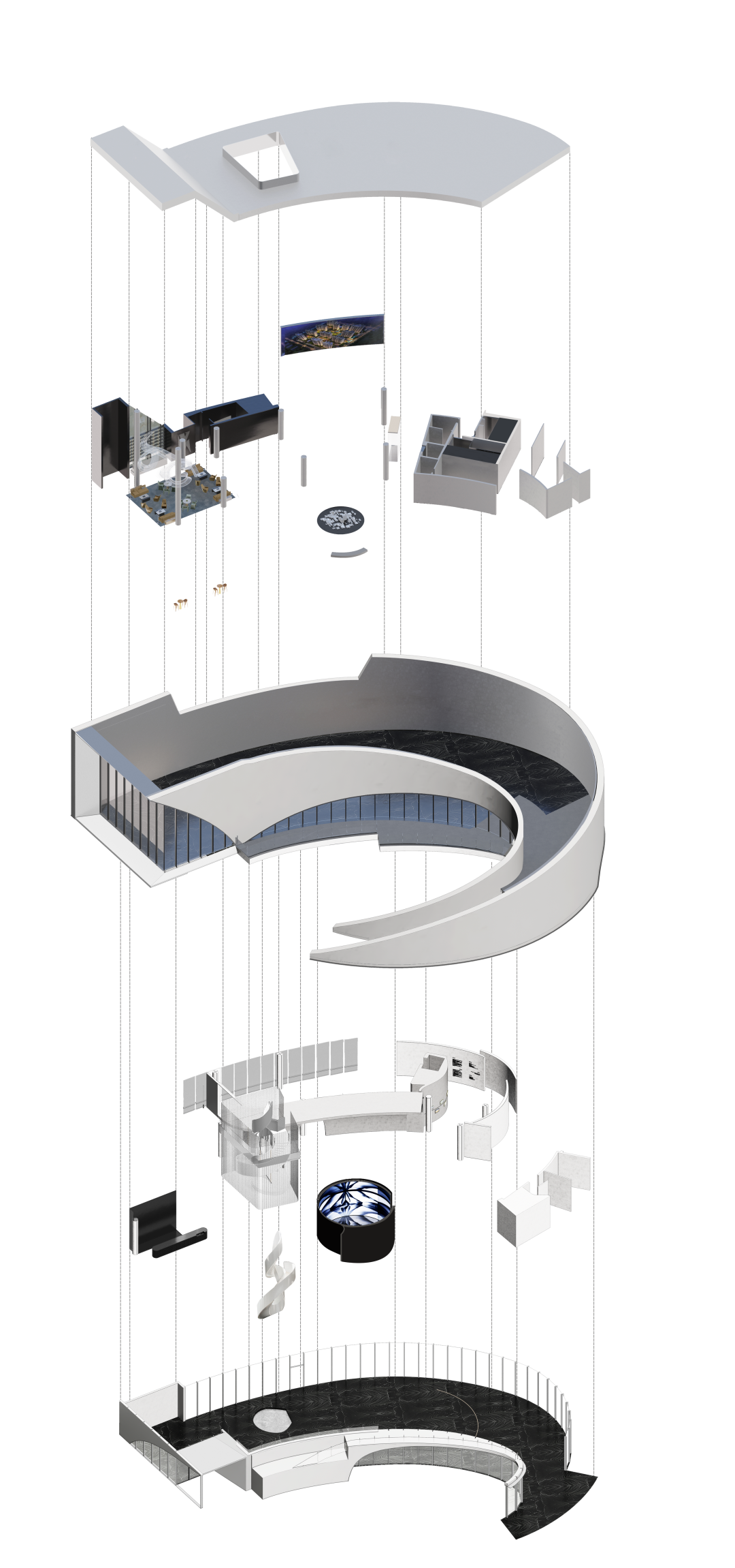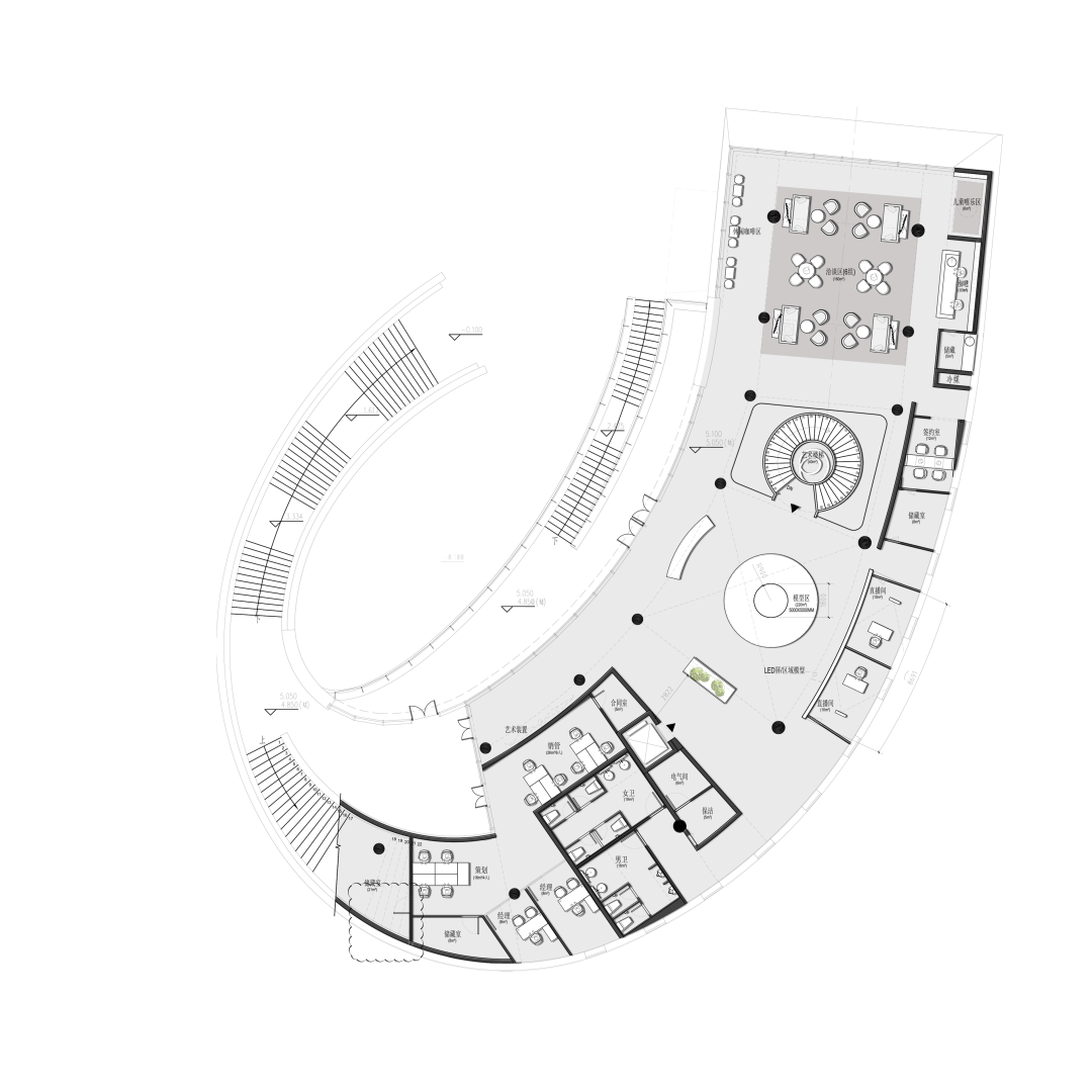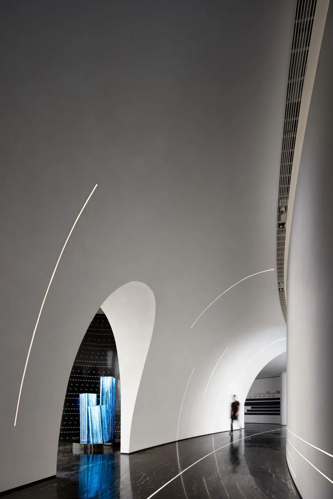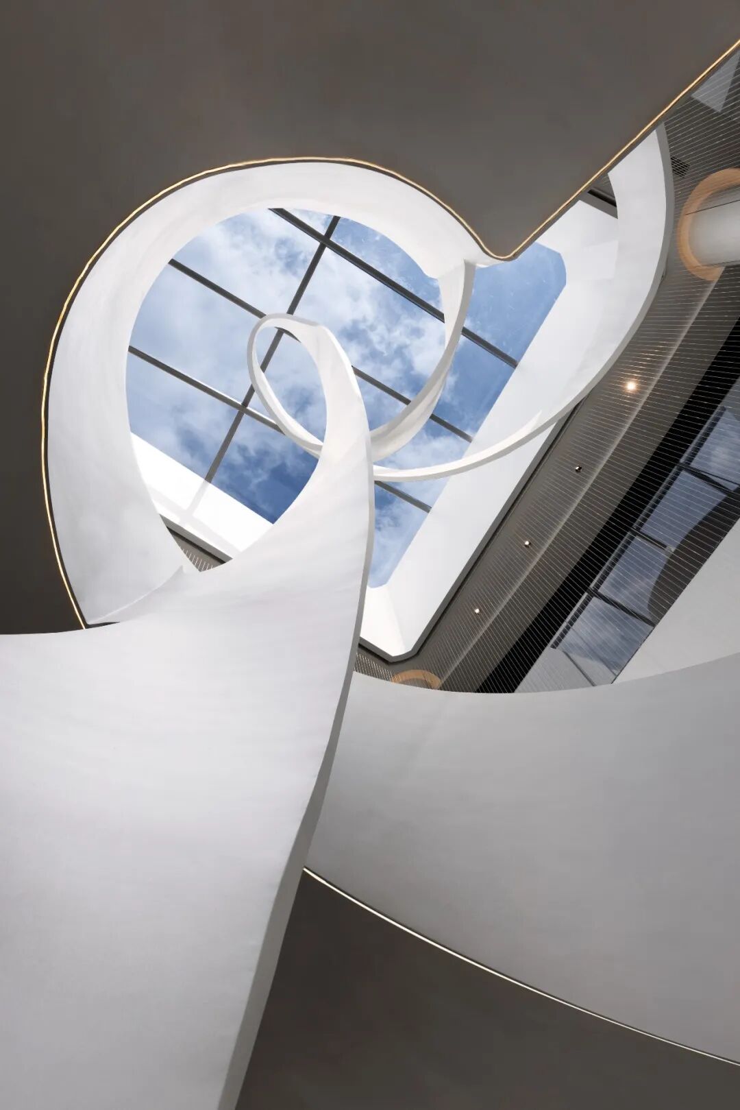 空间的平面布局,空间的内部结构,同样采取曲线的构造,旋转的姿态,回应着城市的自然属性。