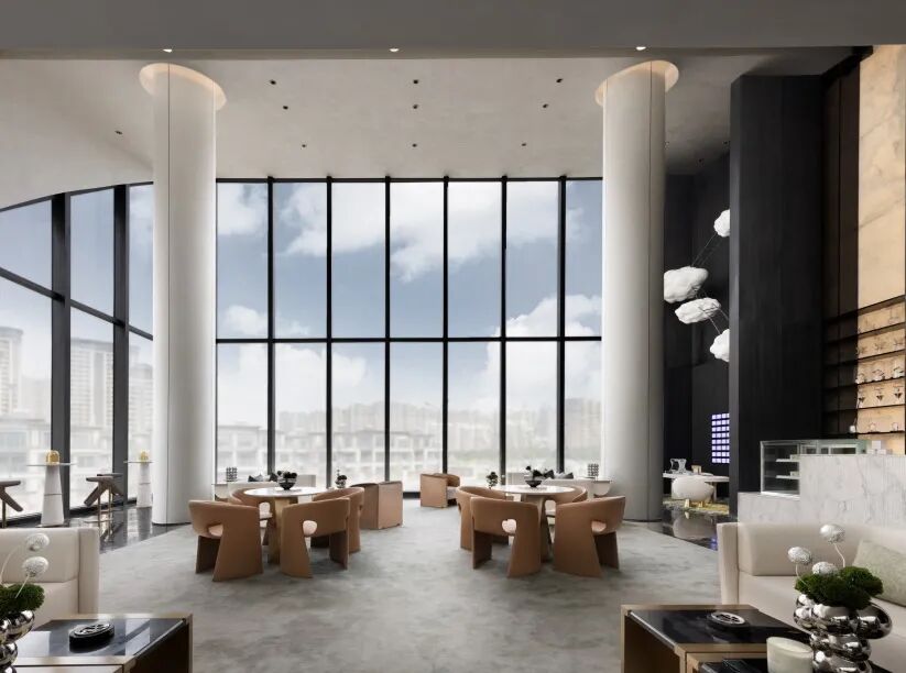 洽谈区开阔徜徉,在与室外景观互相交融的过程中,达至一种轻松愉悦的平和。无论是观景远眺,都能轻松地收入囊中。