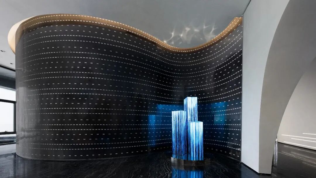 在穿插与衔接中,不同的介质的空间内发生着不同程度的碰撞与交融。流光效果装置随着光源的移动而四处游动,营造出自然的效果。