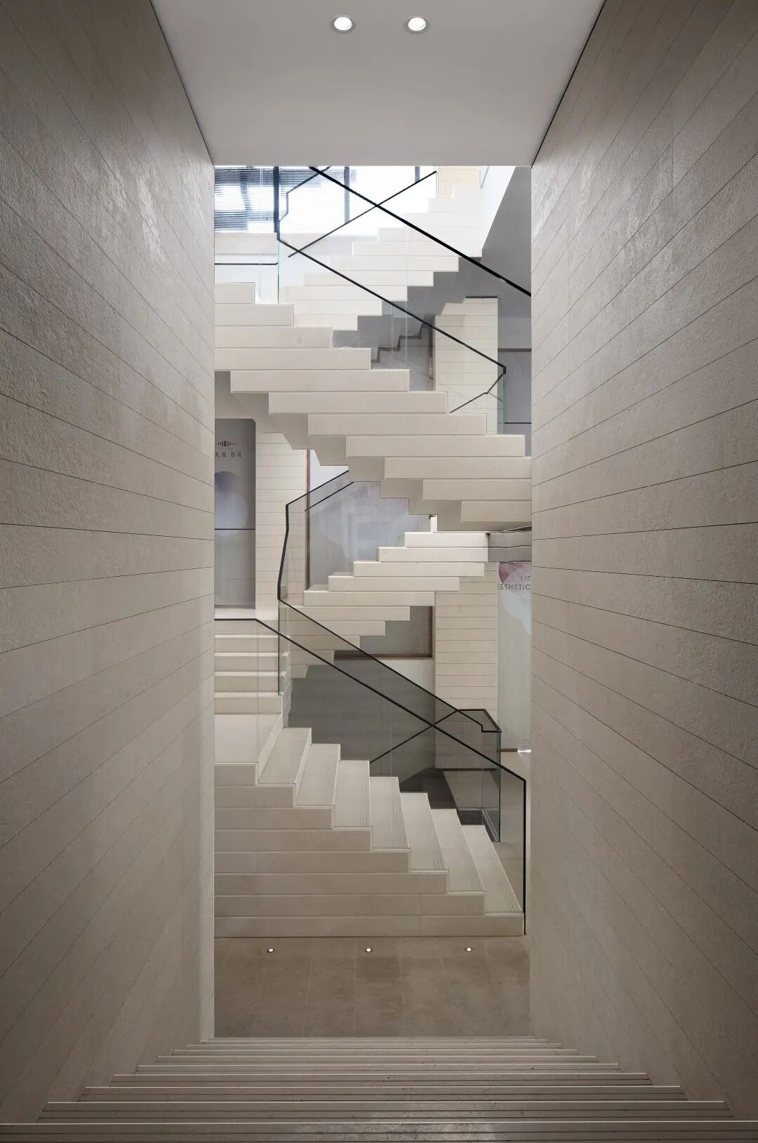 自然的光线总会给人以无需多言的柔软与舒适感,在这个空间中,设计辅以大面积的白色、米白色和简单的线条,留白的地方与环形的空间结构共同围合,一起一伏的视觉表达塑造了空间的现代艺术气息。