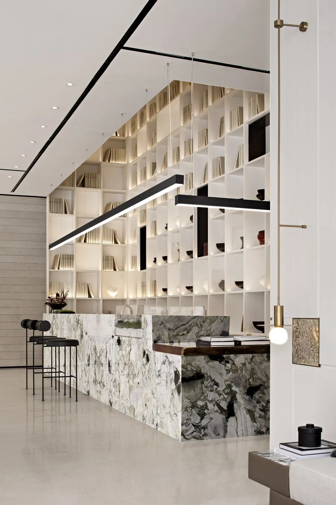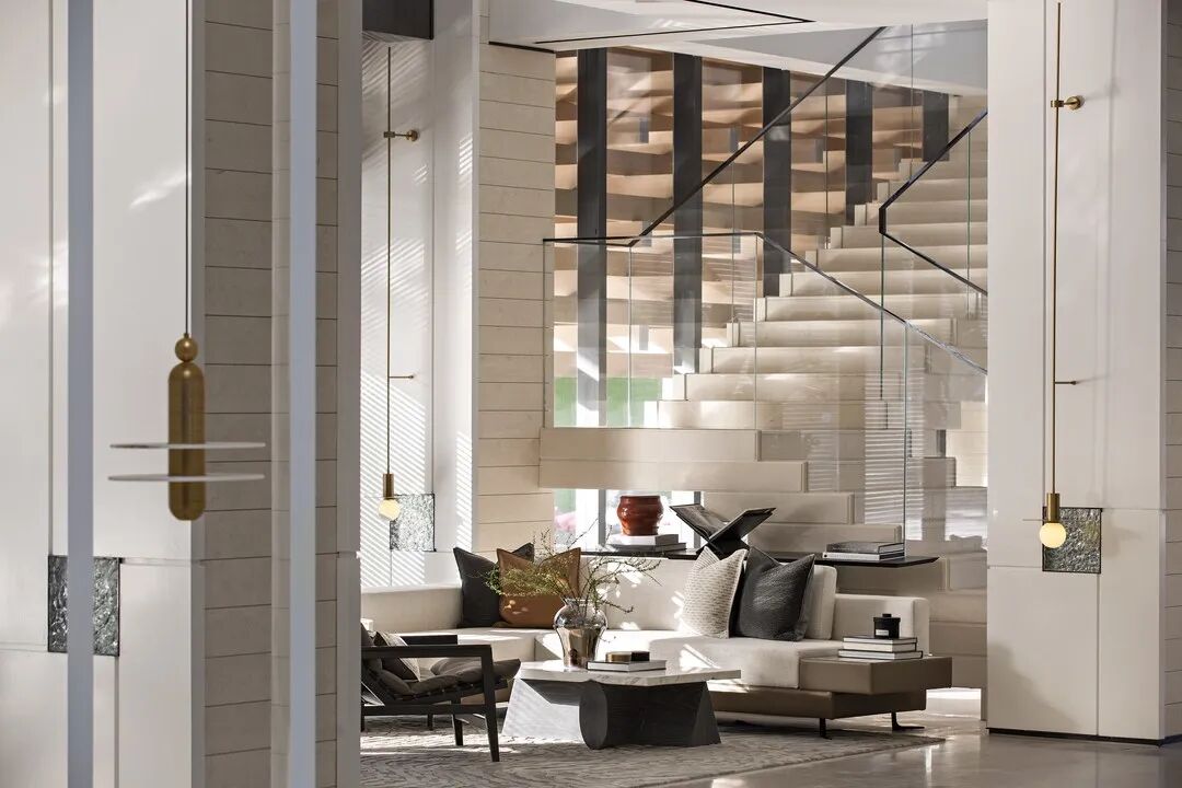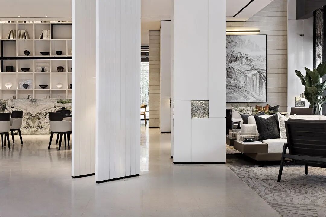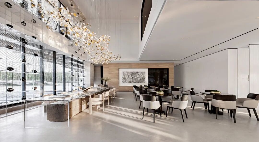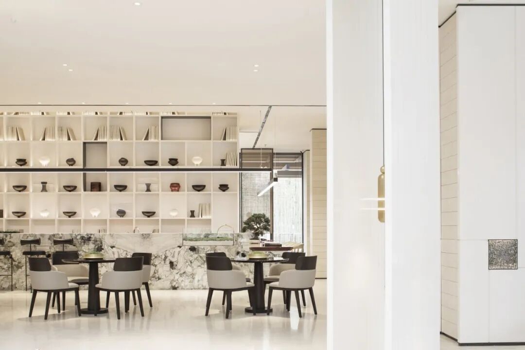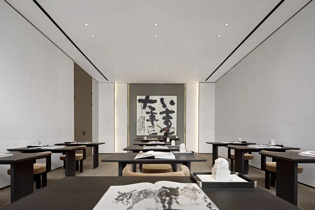 设计以白金摩卡、白沙米黄等浅色材质重构空间秩序,引导视线穿插其中,意在用现代美感营造苏州园林因景互借的韵味,大面的留白可以去掉因文化而衍生的“历史厚重感”,将其轻量化,以呈现更好的净值空间。