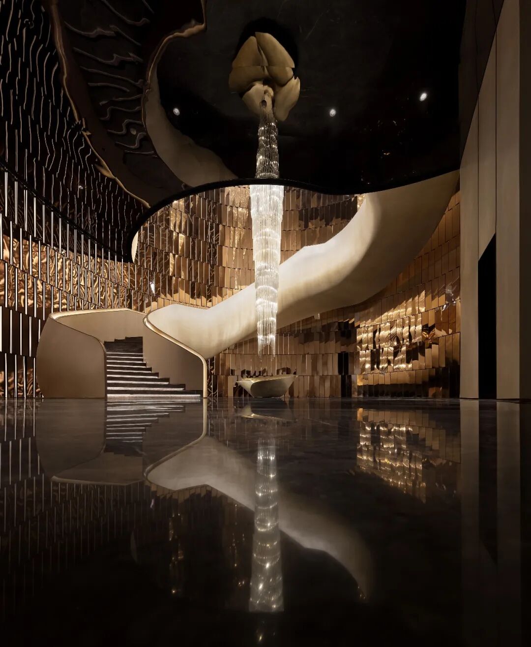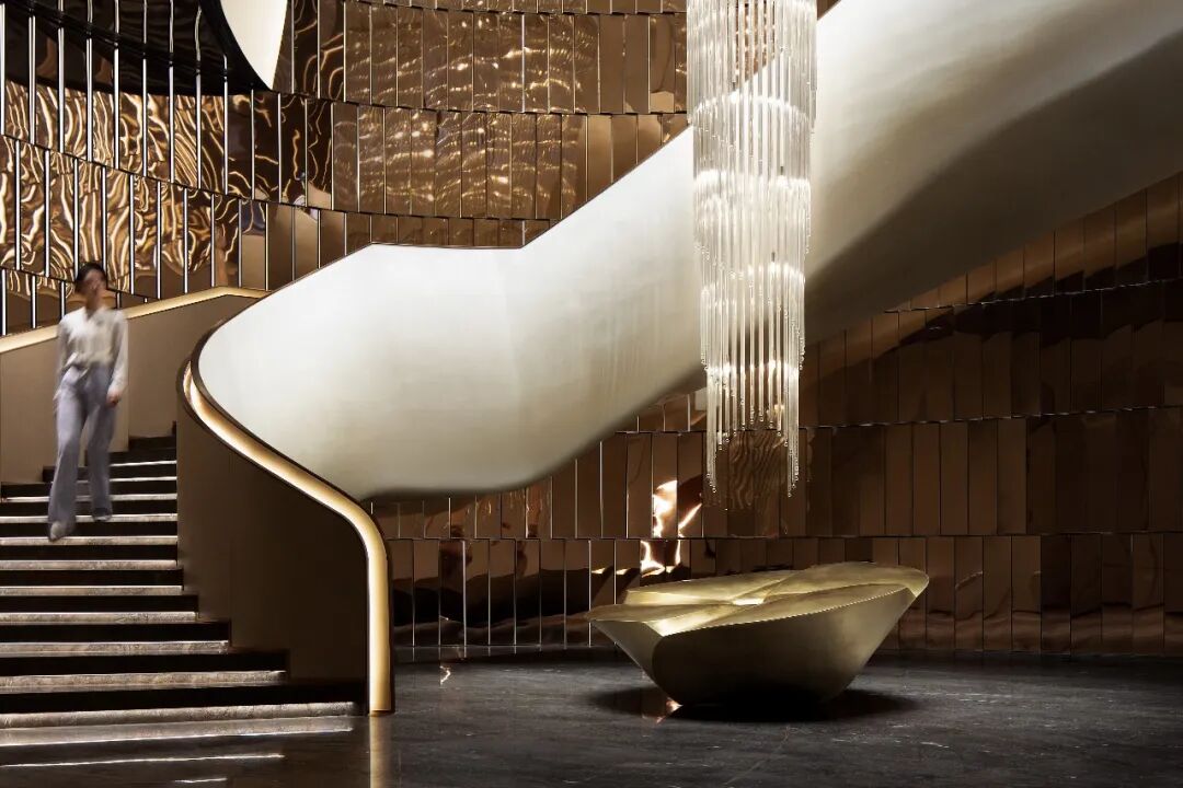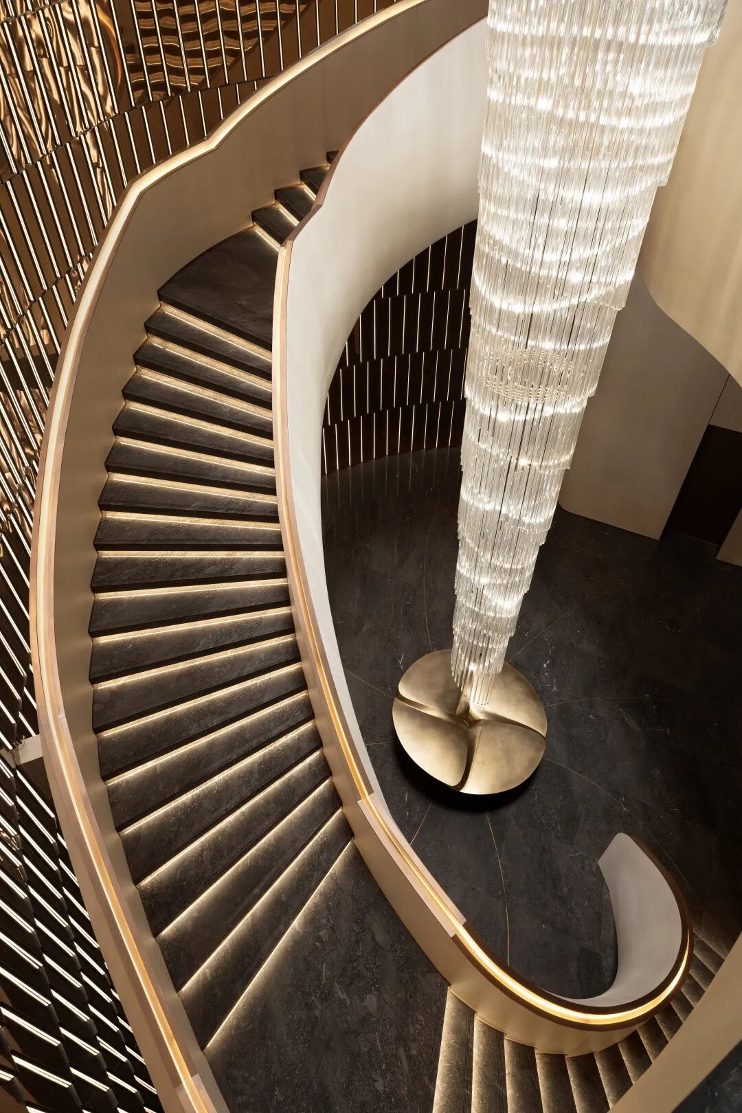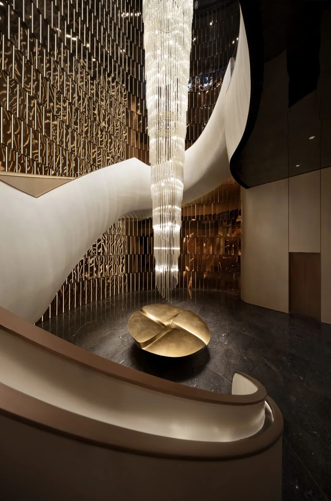 进入接待前厅,挑高的设计串联起前厅和艺术楼梯两个空间维度,柔和线条伴随着暖色光线从上至下充盈空间,呈现出优雅精致的空间诉求,自带冷感的天然石材与金属材质随着人的流动逐渐生出暖意,营造令观者难以忘怀的幻境感。