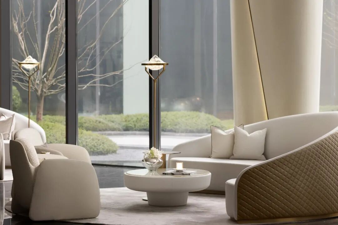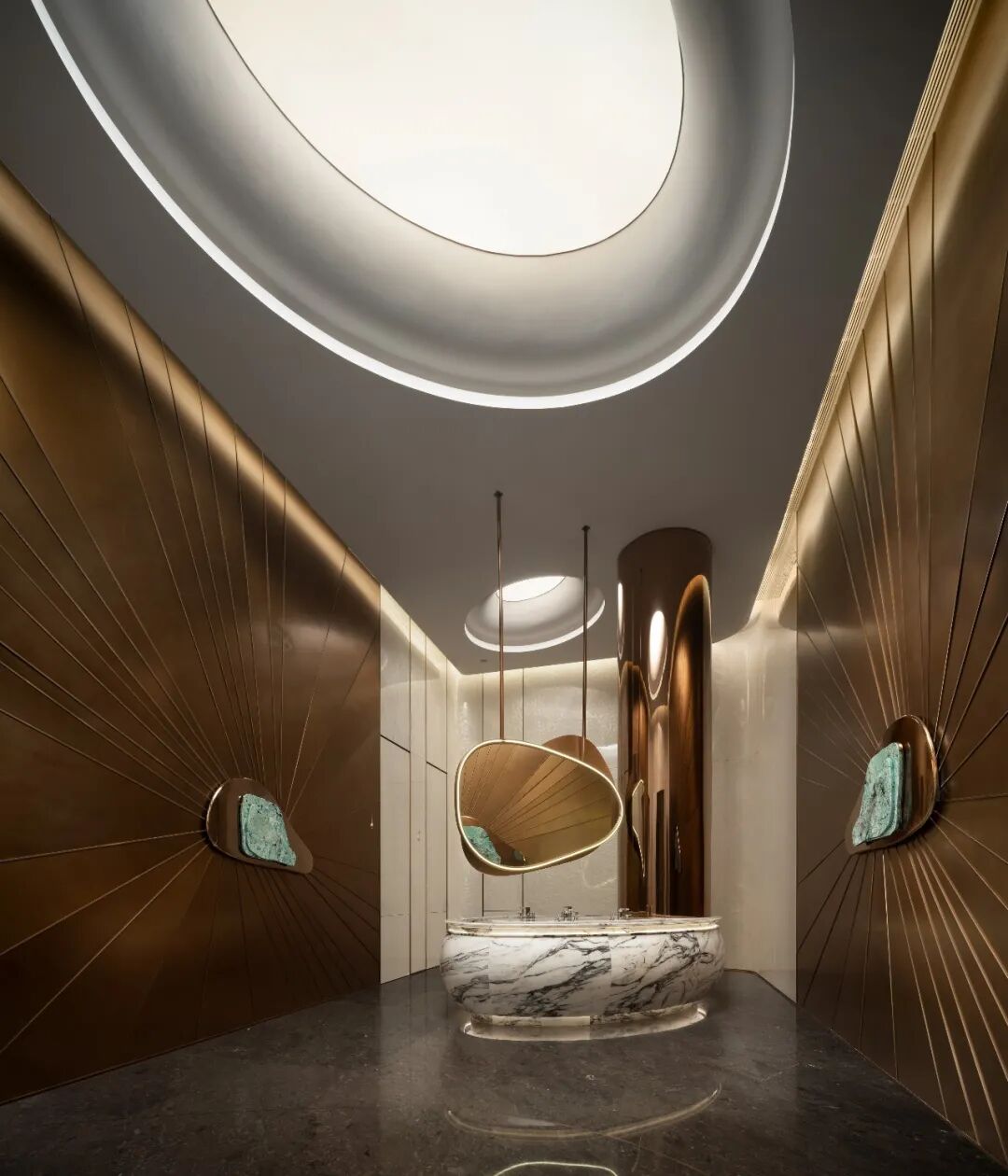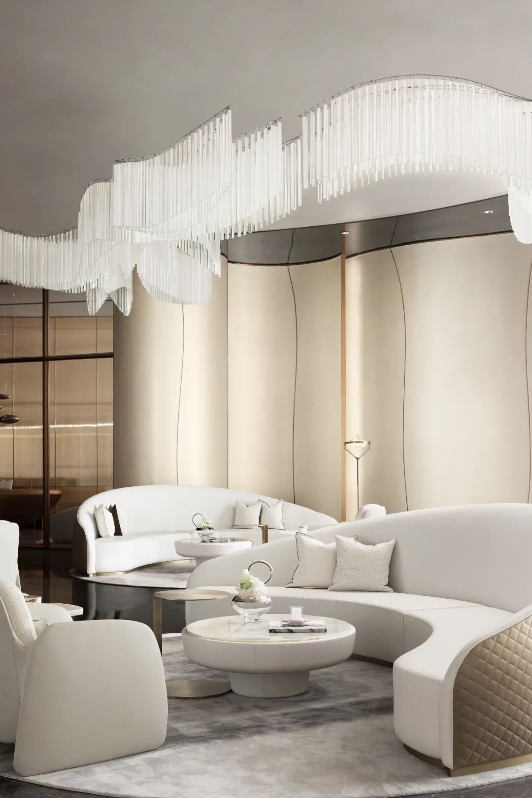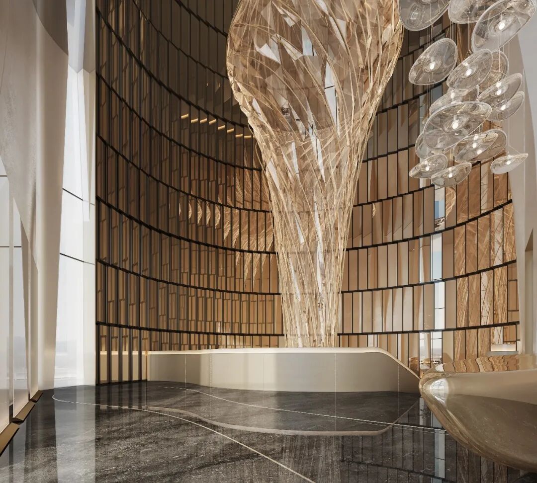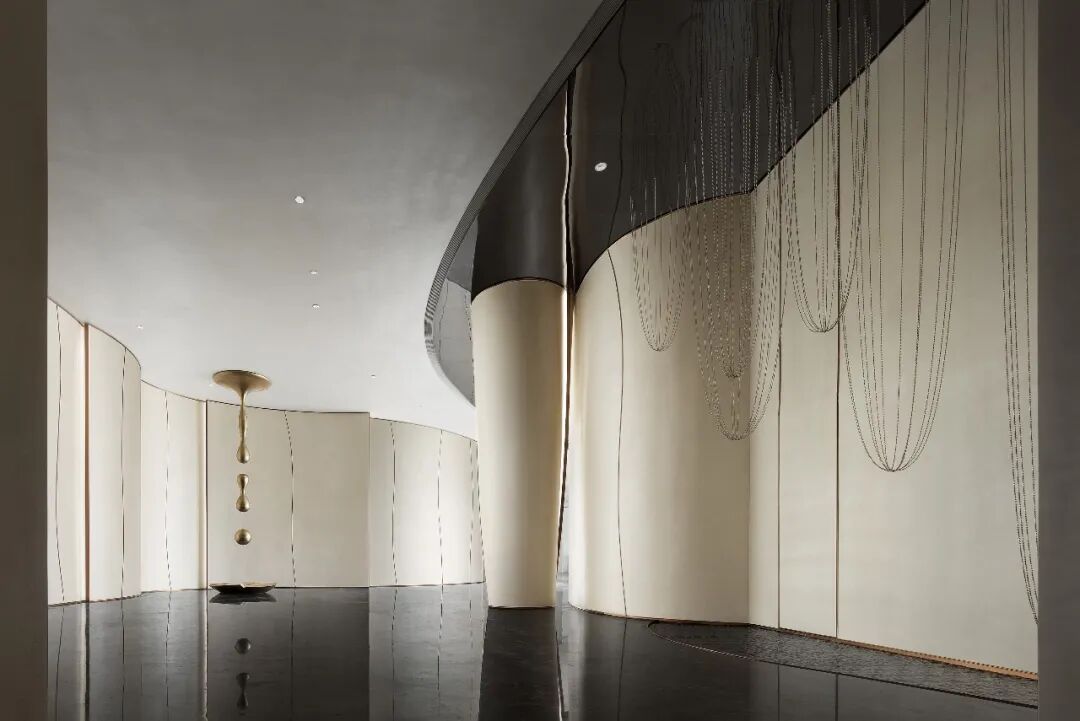 进入接待前厅,挑高的设计串联起前厅和艺术楼梯两个空间维度,柔和线条伴随着暖色光线从上至下充盈空间,呈现出优雅精致的空间诉求,自带冷感的天然石材与金属材质随着人的流动逐渐生出暖意,营造令观者难以忘怀的幻境感。