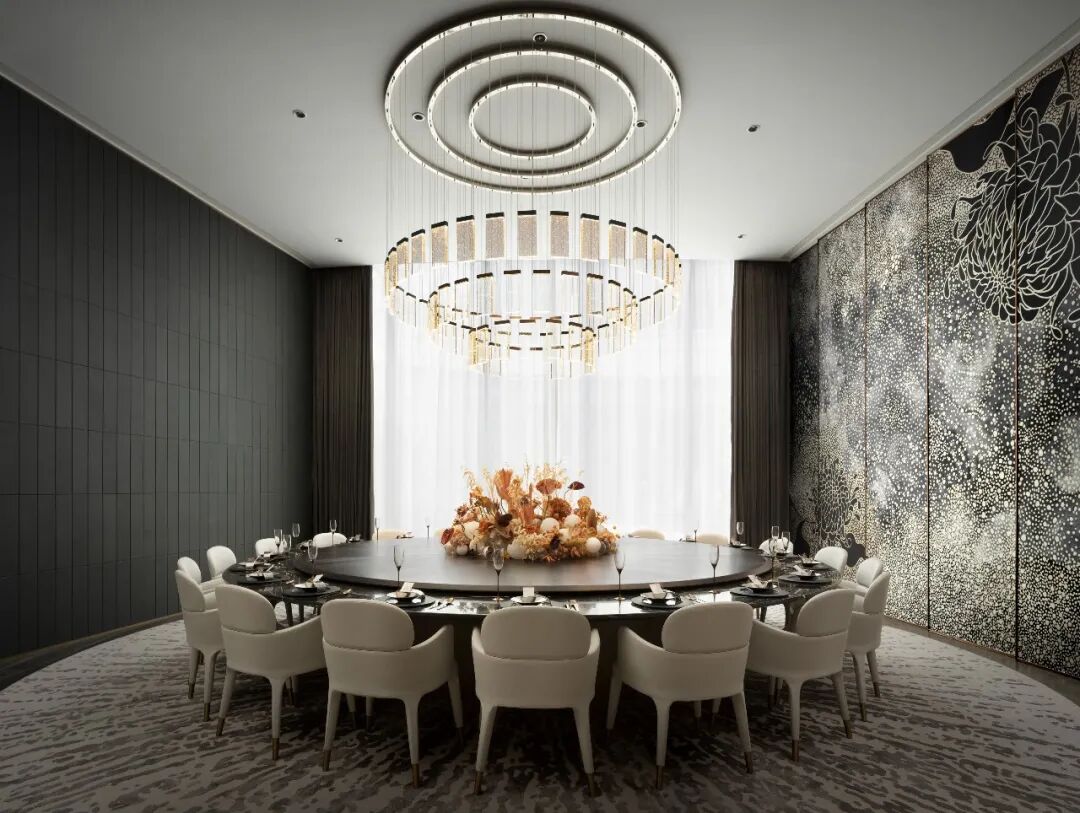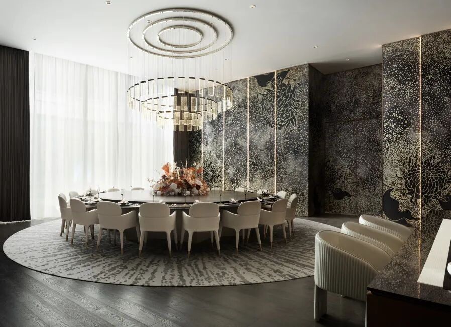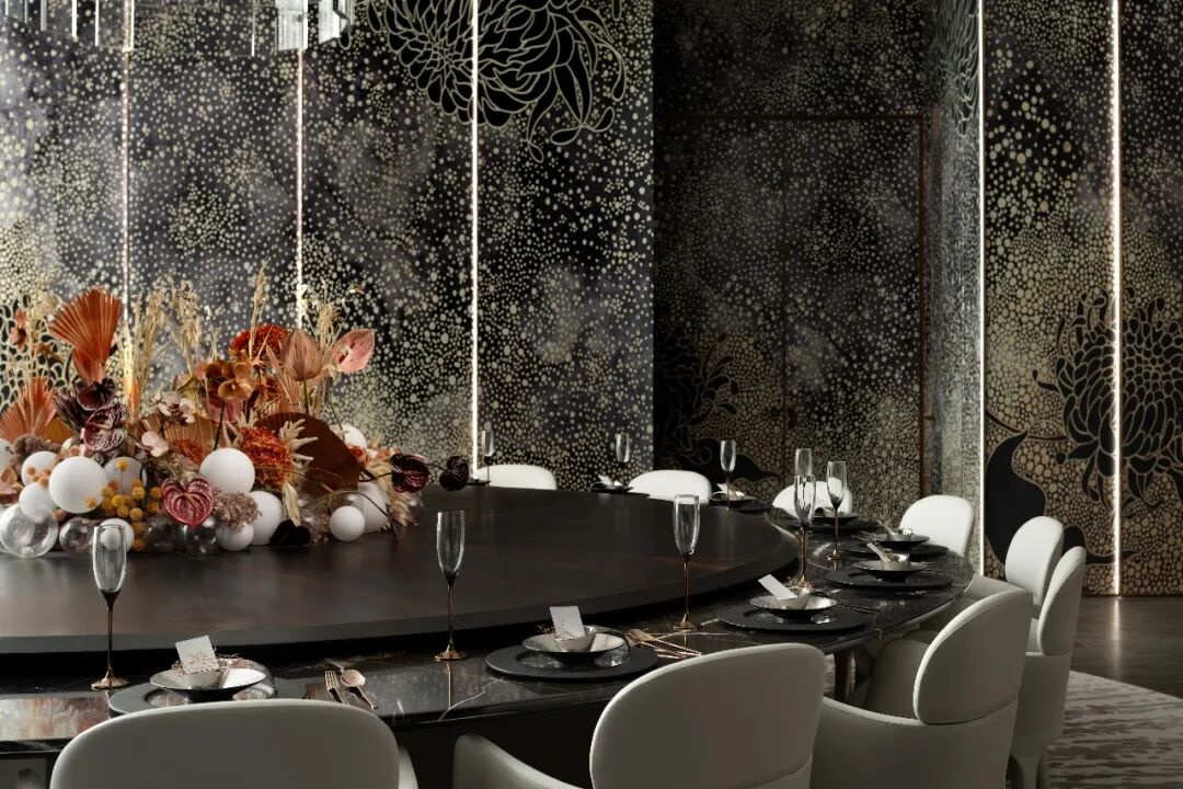 圆,是中华文明的精神原型,也是东方美学中不可缺少的元素,宴会厅从顶部天花至地毯,始终以圆形贯穿,由上至下层层递进,东方的大气豪情与精致细微相互关照,流光溢彩的金属餐具与曼妙多姿的繁花作品,共同传递出真实热闹的人间烟火。