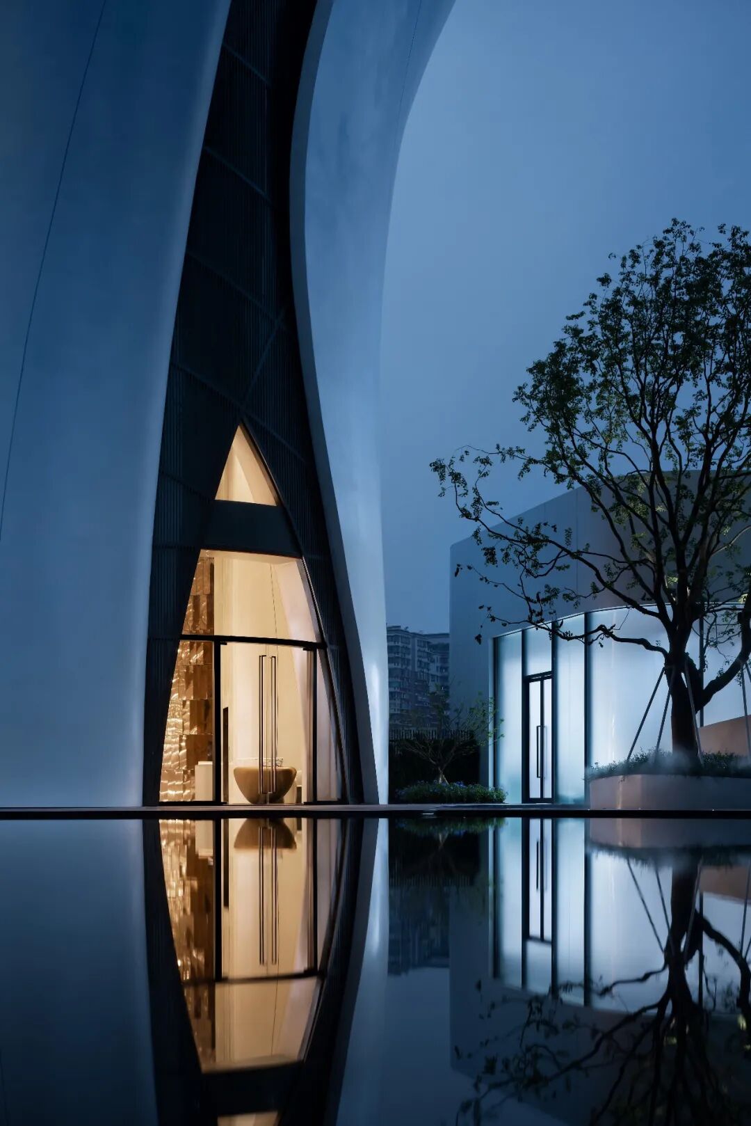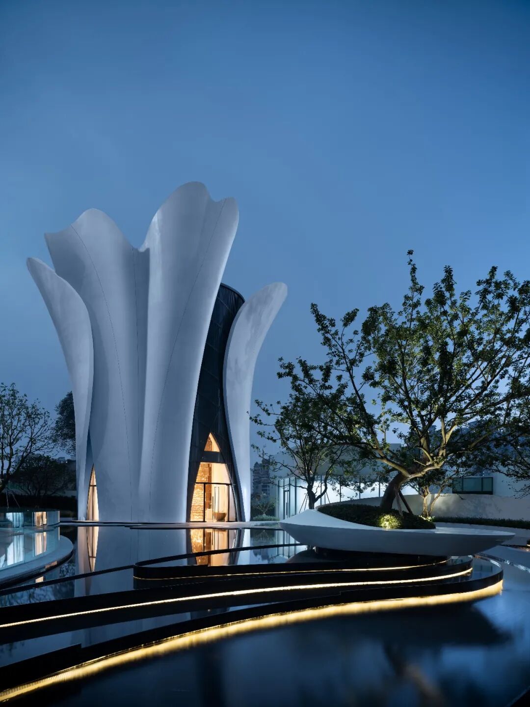 玉兰花瓣流淌的曲线,在景观、建筑与室内之间互为呼应,线与线的交织,簇拥出傲然的高洁,绽放出最美的姿态,刚柔并济。