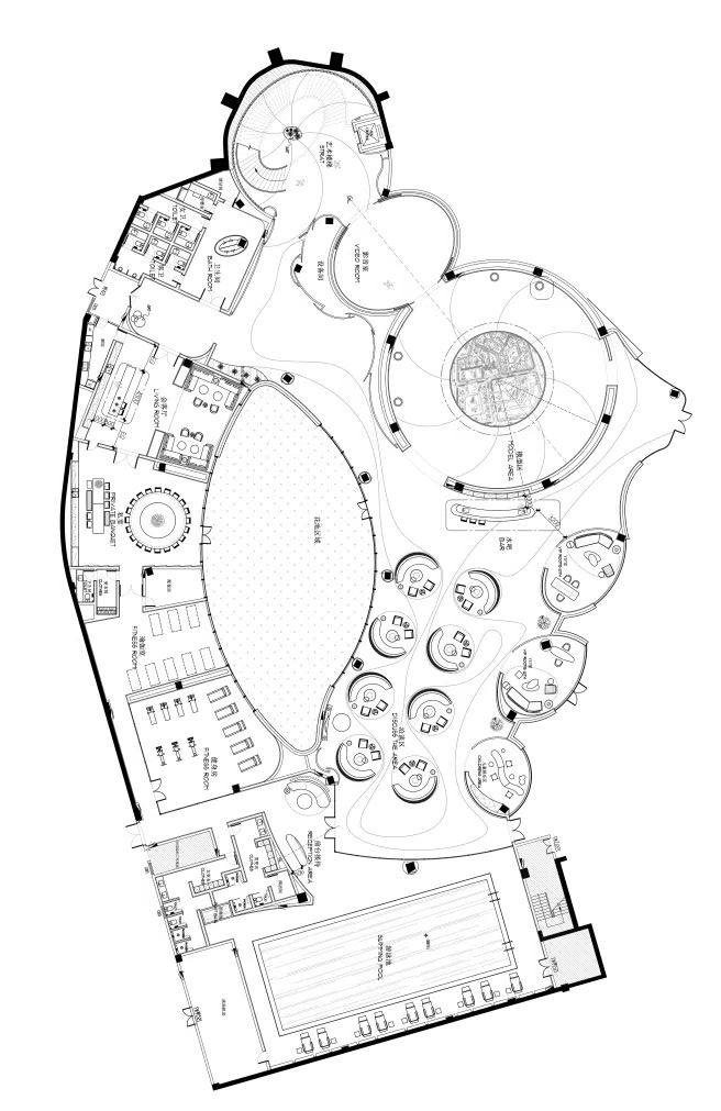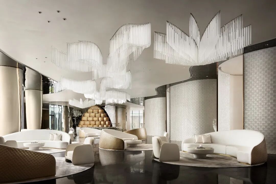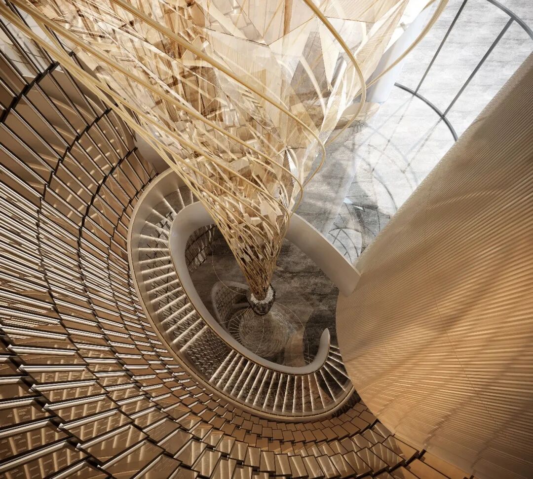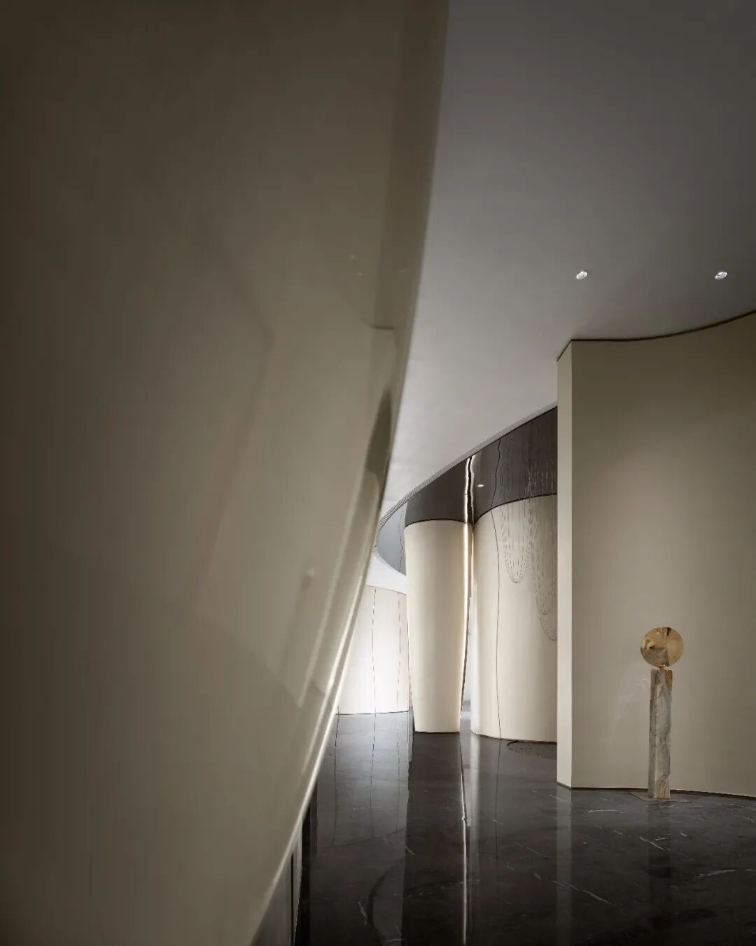 设计团队将斐波那契螺旋线嵌入至空间之内,以玉兰花为衍生,利用光影和角度的旋转,在空间内留下精简的曲线语言,致力于通过新颖潮流的空间形态来打造城市最具地标性的建筑体。真正融大胆前卫和优雅魅力于一体,从而传递给人以最直观的有关美的观感。