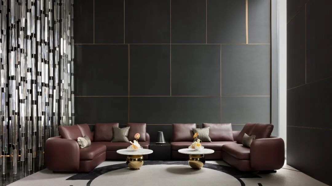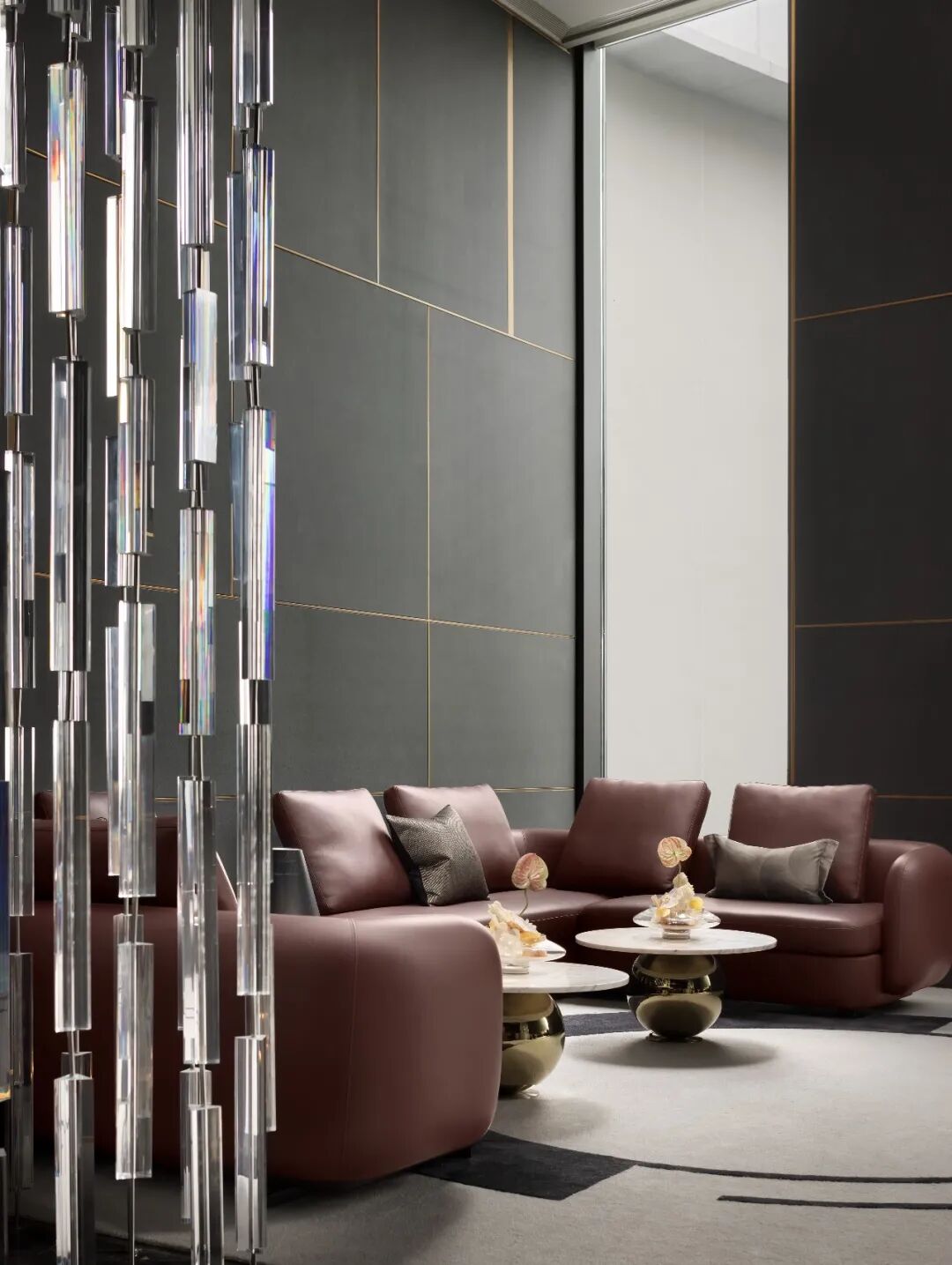 柔软的圆角皮质沙发与圆形茶几,给人轻松休闲的感觉,墨色的墙面与枣红色沙发,色调沉稳,在与浅色地毯对比中调和出别样的空间质感,彰显空间的优雅奢华。