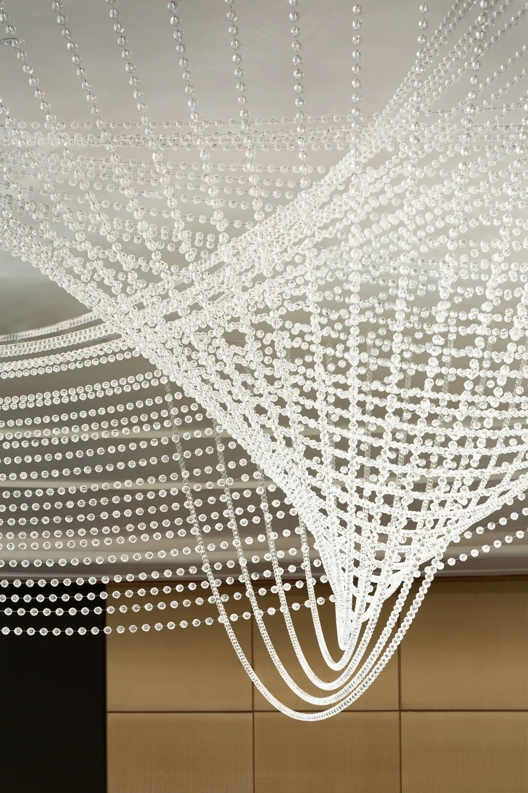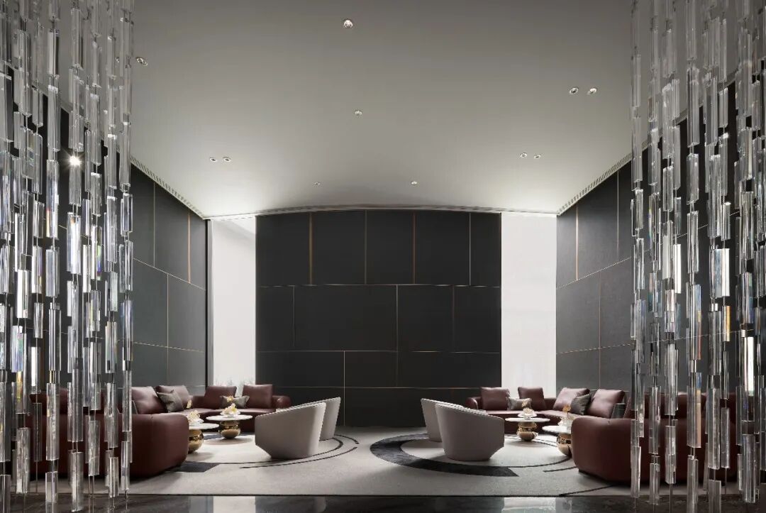 会客区以垂悬而下的亚克力流苏装置半围合,创造出一个波光粼粼、充满神秘感的区域,渐变色亚克力材质在自然光的照射下呈现出微妙的色彩变化,提升空间的时尚感。