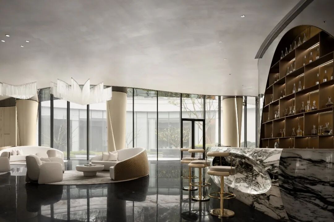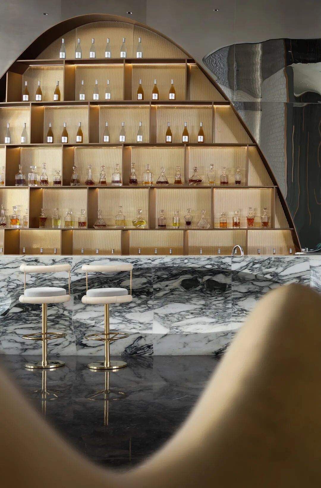 水吧与洽谈区和谐贯通,借助曲线语言的大理石吧台,传统水墨绘画般纹理氤氲其间,金属与布艺交织的座椅在其中点缀,丰富视觉层次,充满诗意的造型工艺,使整体呈现出犹如品牌精品橱窗。