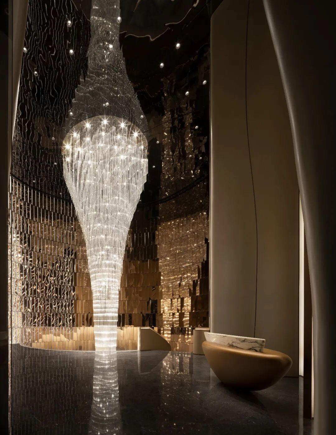 前厅与艺术楼梯以高达16米的水晶吊灯作为衔接,立体与平面的交叉,赋予强烈的仪式感,这也是本案最美的精妙。如瀑布一样从天花倾泻而下的水晶棱镜墙,以感悟生命的璀璨,将光芒填满空间。
