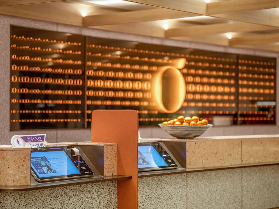 从桔子乐活“自由、愉悦”概念出发,大堂地面采用桔咖色、浅咖色、深咖色三种颜色的水磨石地砖拼接组合而成。前台背景墙以桔子 LOGO 为灵感,使用了全新研发的无限镜盒,镜盒图案采用大小渐变的构图方式,体现桔子乐活的韵律感,将乐活传递给前来办理入住的宾客。
