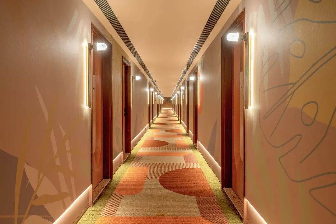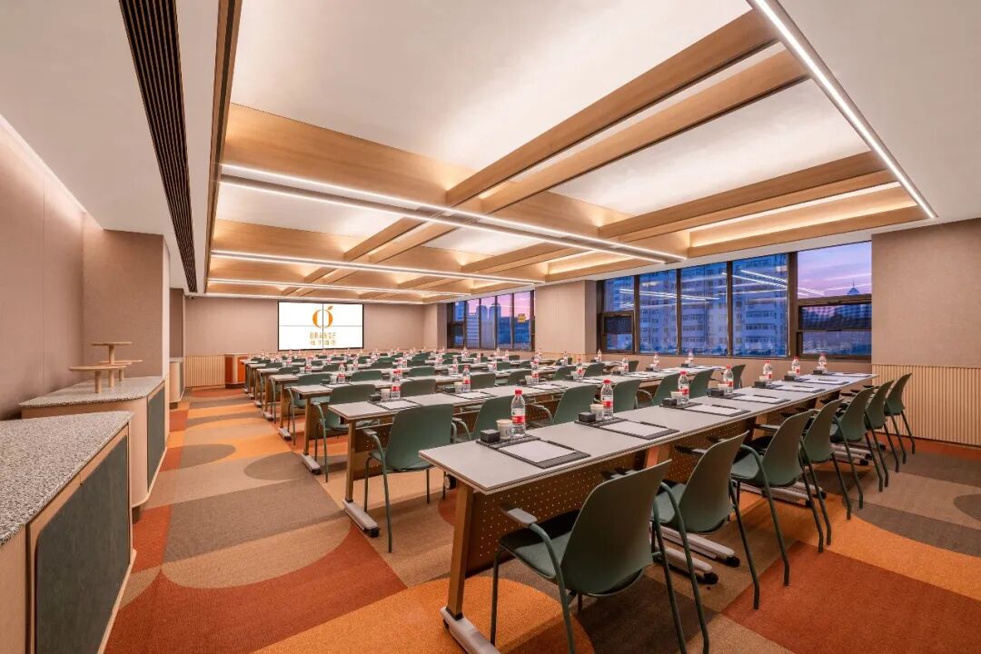 与此同时,大堂、早餐厅及会议室的天花均采用全新的木纹格栅,通过使用环保材料,体现桔子可持续、低碳自然的理念。上照的灯带设计与格栅造型结合,为公区提供了充足且柔和的光照。