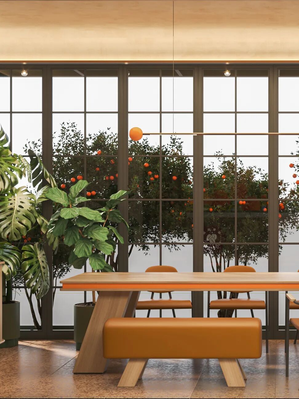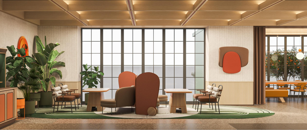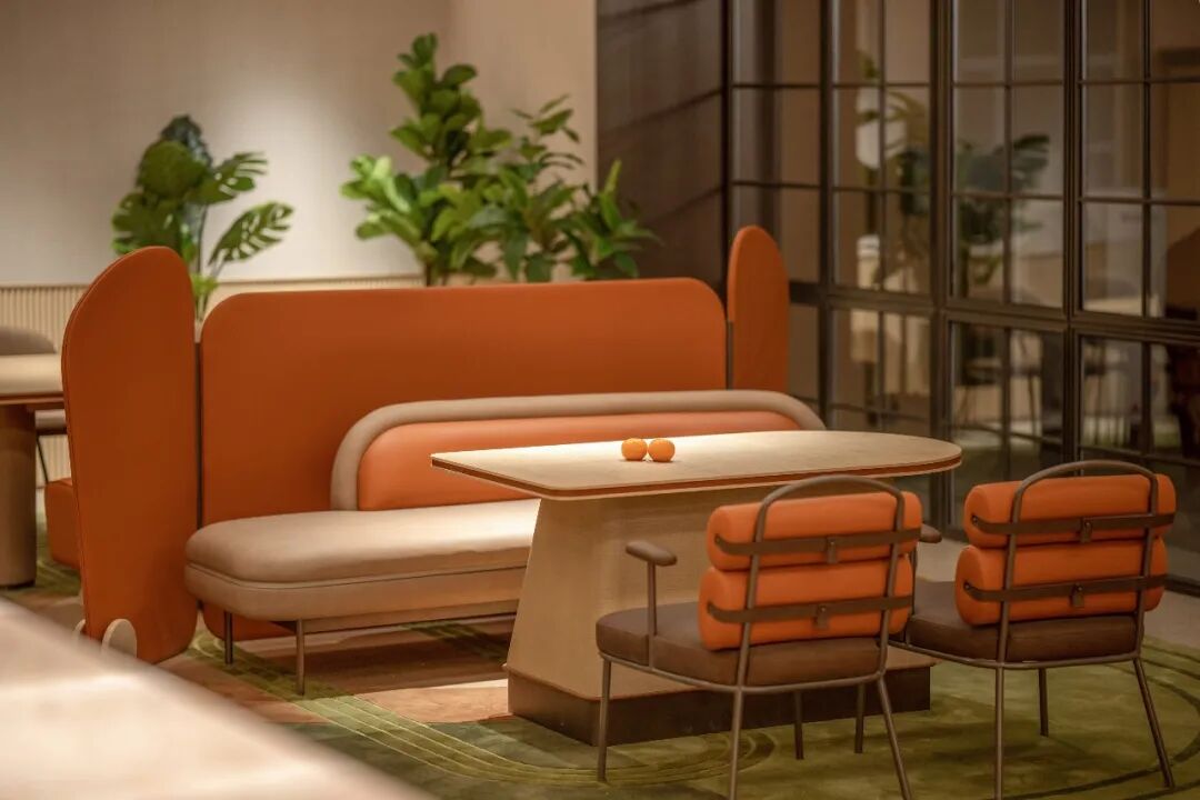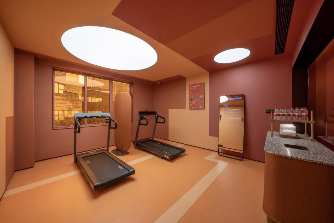 针对客户对隐私的关注以及后疫情时代卫生标准的升级,桔子3.0产品也在不同的空间场景和细节处理上融入了对私密性的考量。比如早餐餐桌之间加入了桔子特色格挡、健身房跑步机之间加入桔子特色隔断,满足隐私保护的同时丰富了空间的趣味性。