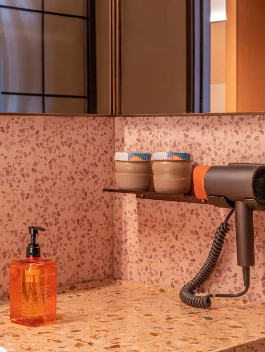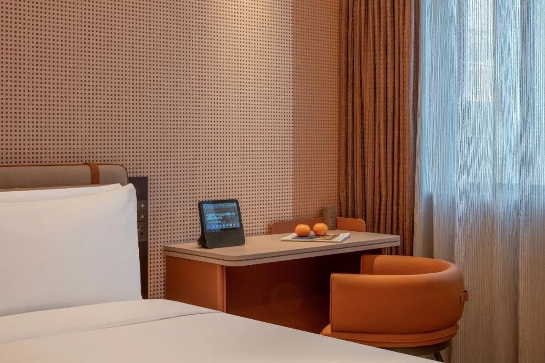 围绕桔子乐活主题,客房内的运营物品也在细节处,精细打磨,如客用品色彩搭配和摆放优化,吹风机功能、化妆镜灯光升级等。