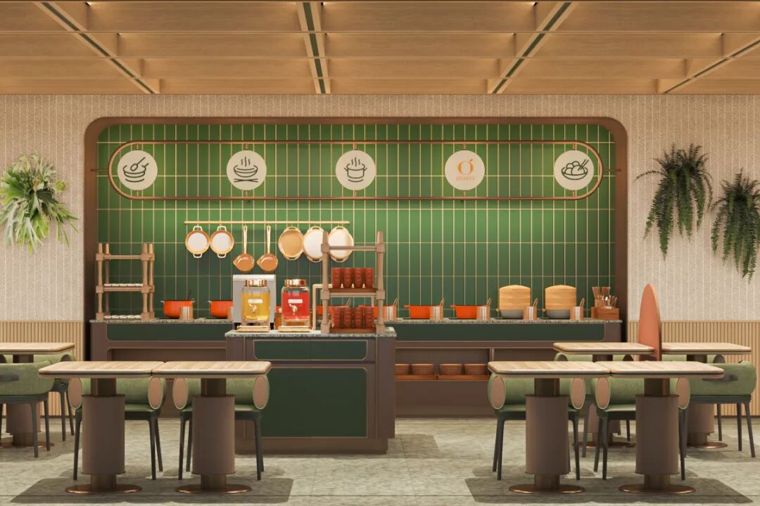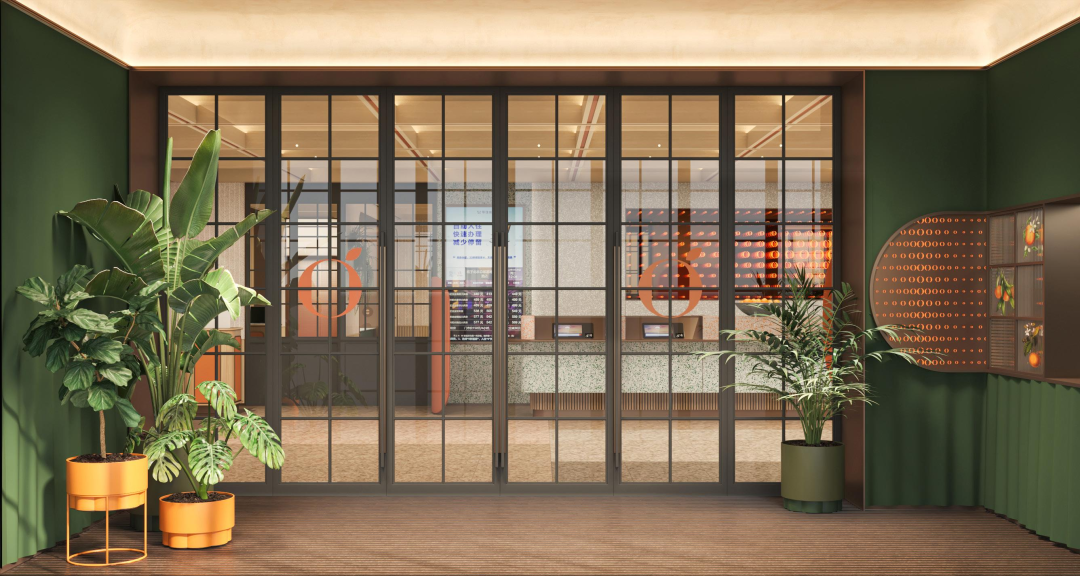 绿色系的墙砖、取餐台、座椅、沙发、 各类绿植软装,健康、绿色的概念,不单体验在室内设计上,更是“乐食”全新桔子乐活早餐的核心。